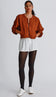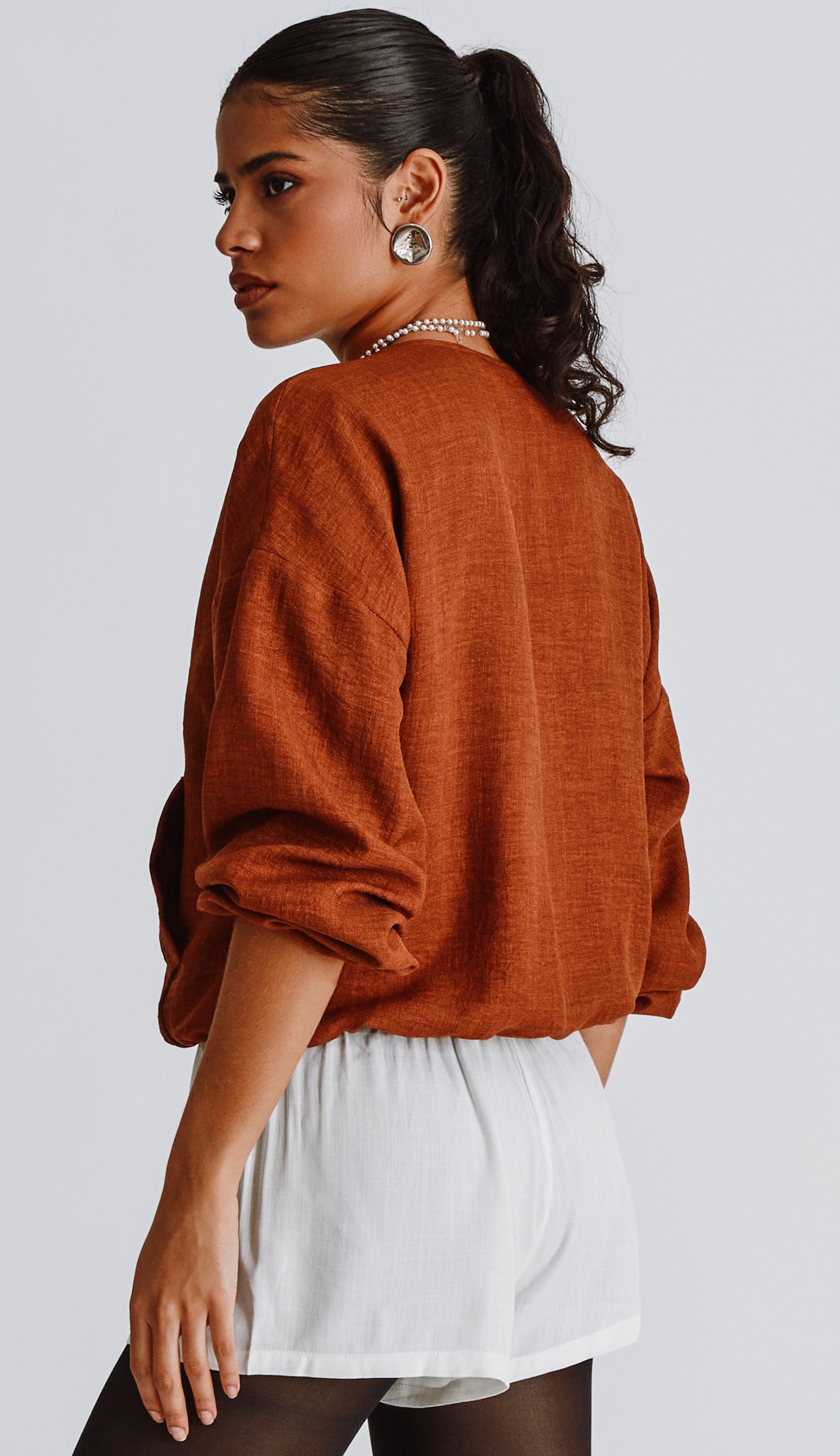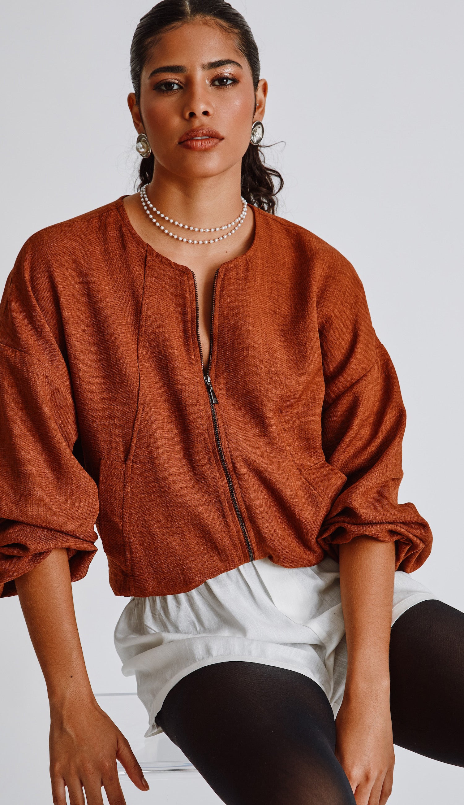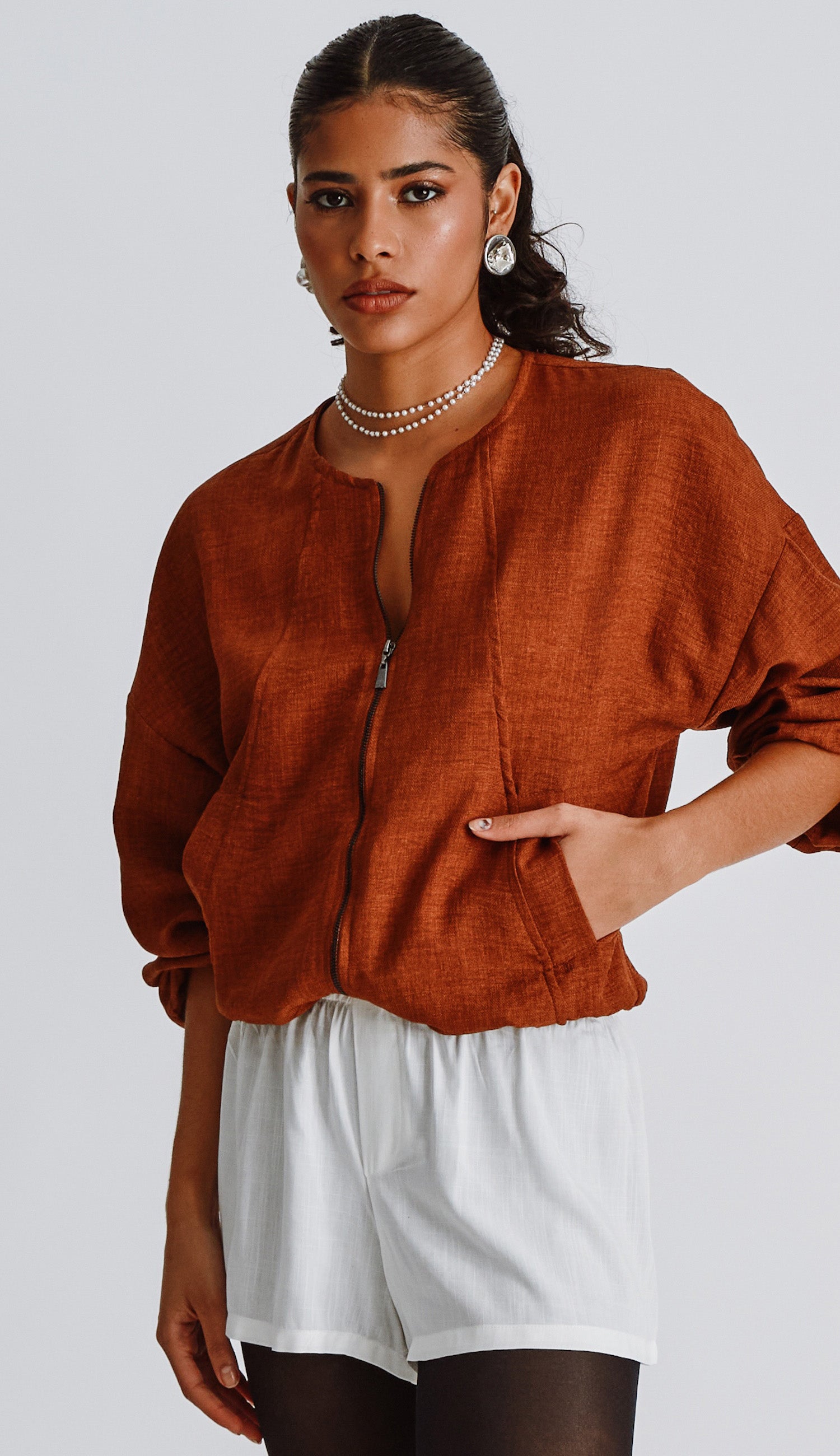 Jaqueta com forro, confeccionada em poliéster maquinetado com aspecto de linho e efeito amassadinho. Possui gola redonda, fechamento frontal por zíper de metal com pingente que tem o delicado detalhe da conchinha da Laguna gravada, bolsos laterais e elástico franzido interno nos punhos e na barra, dando um efeito levemente blusê.