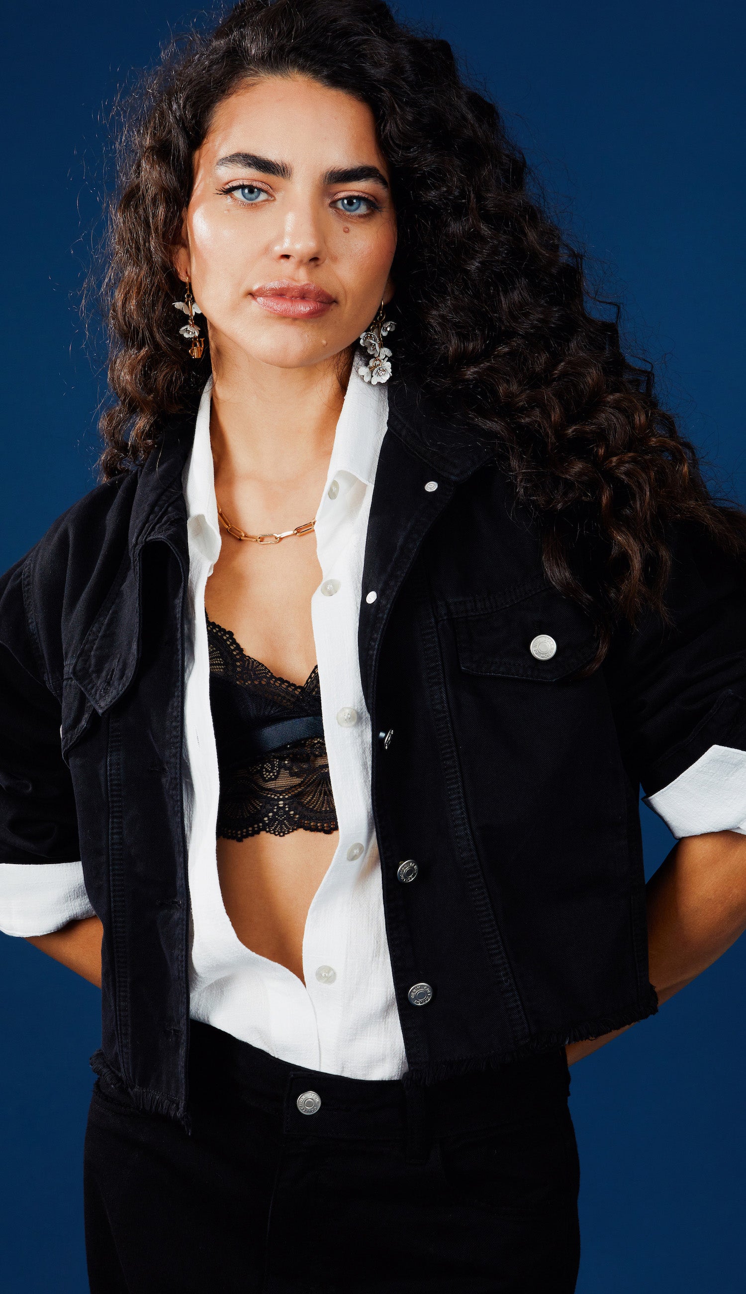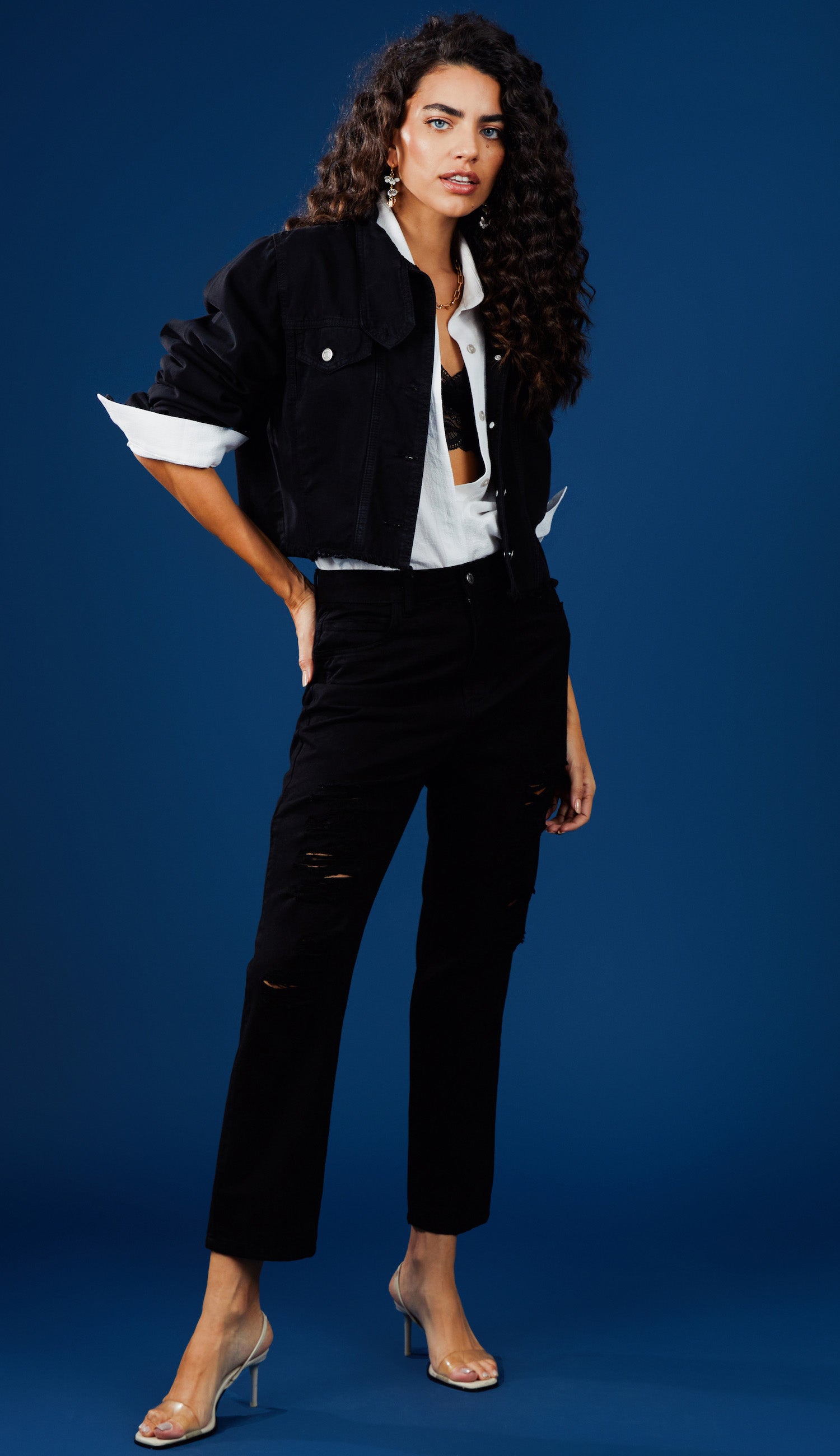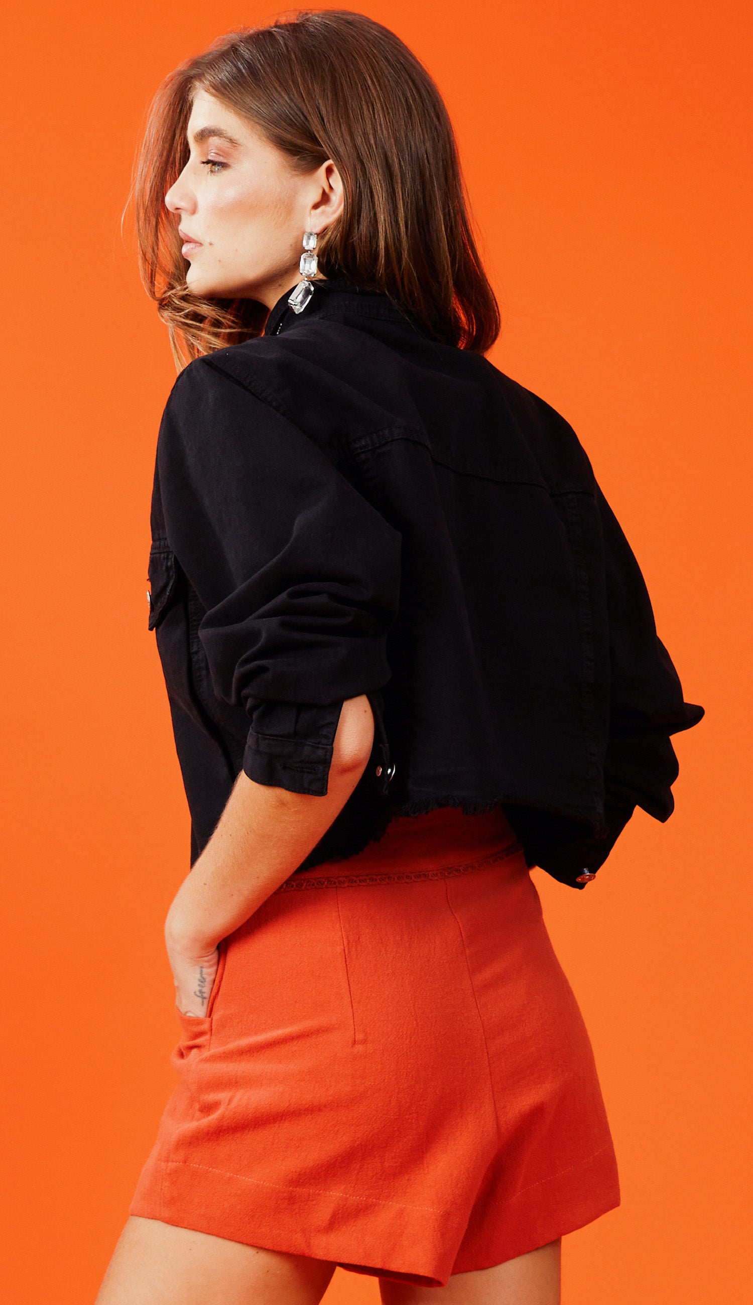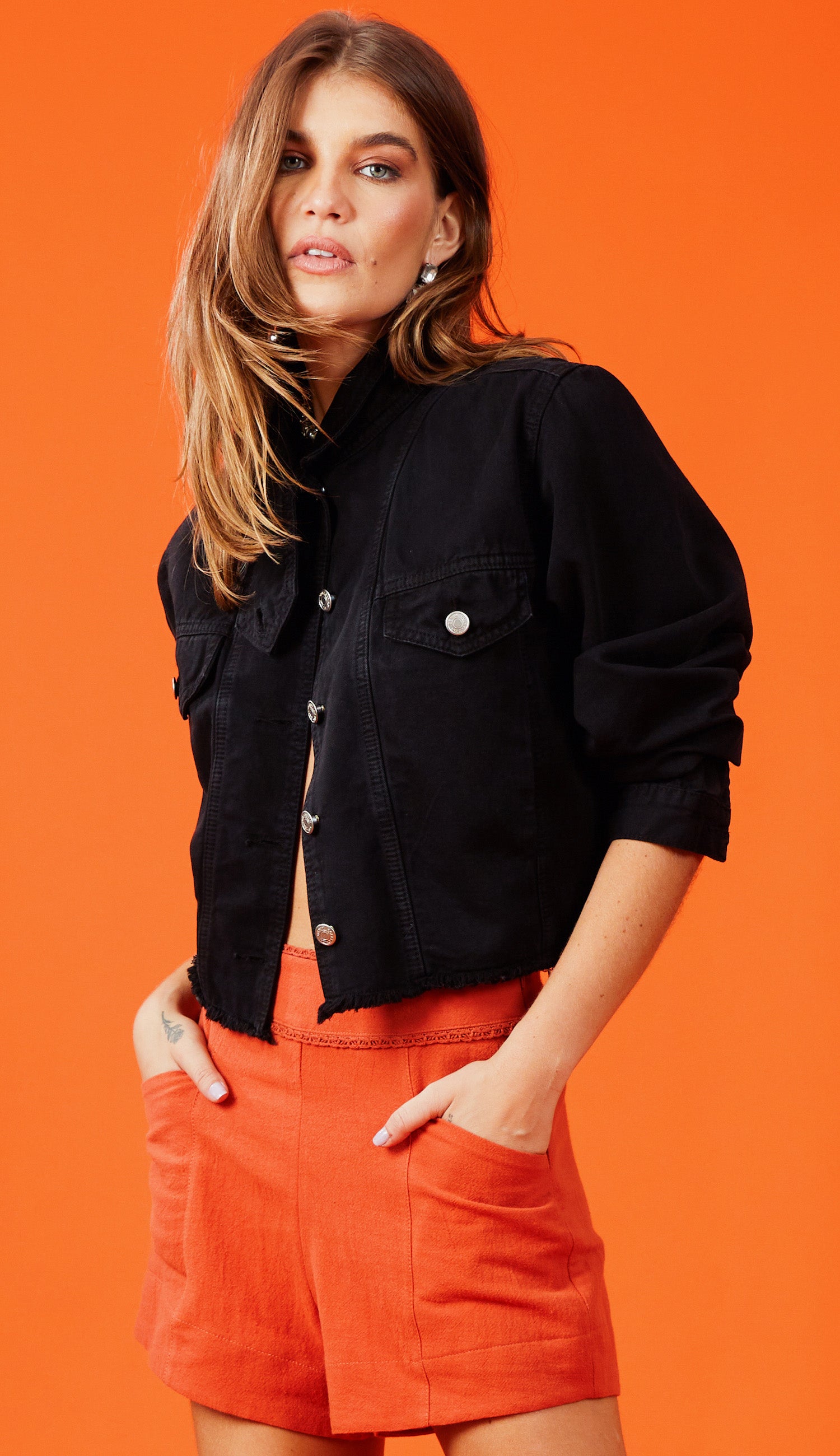 Jaqueta cropped confeccionada em sarja de algodão. Possui mangas longas, bolsos frontais e internos, barra desfiada e fechamento por botões em níquel. É a peça perfeita para combinar com seus looks Laguna em dias mais friozinhos!