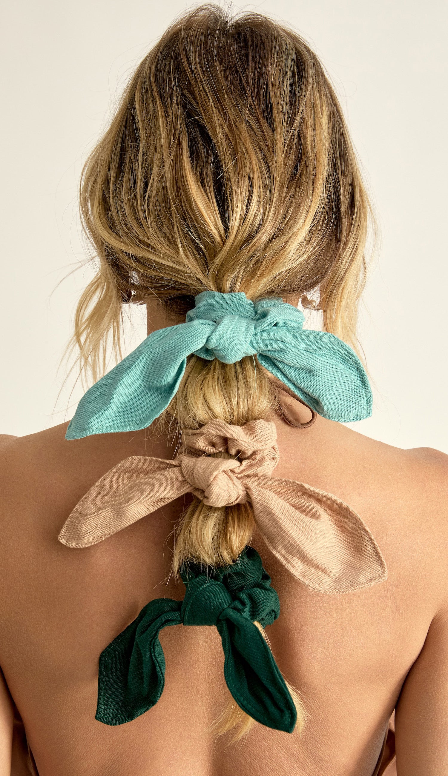 Scrunchies confeccionadas em linho. Nossas laguchinhas já são muito famosas! O mimo que toda Laguna Lover ama! Esse pac possui 3 scrunchies nas cores: verde, natural e azul.