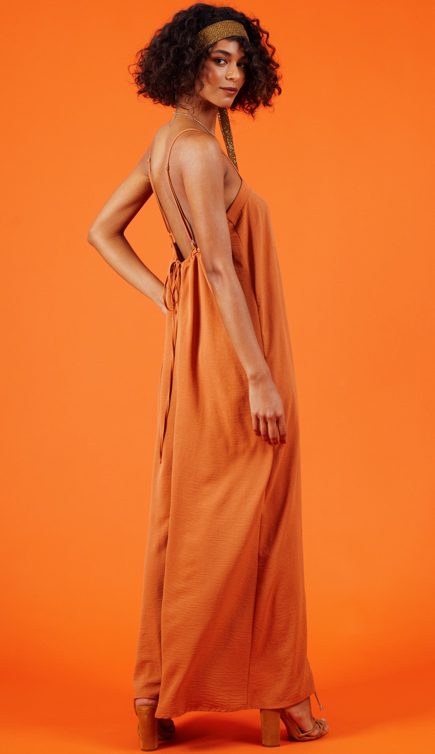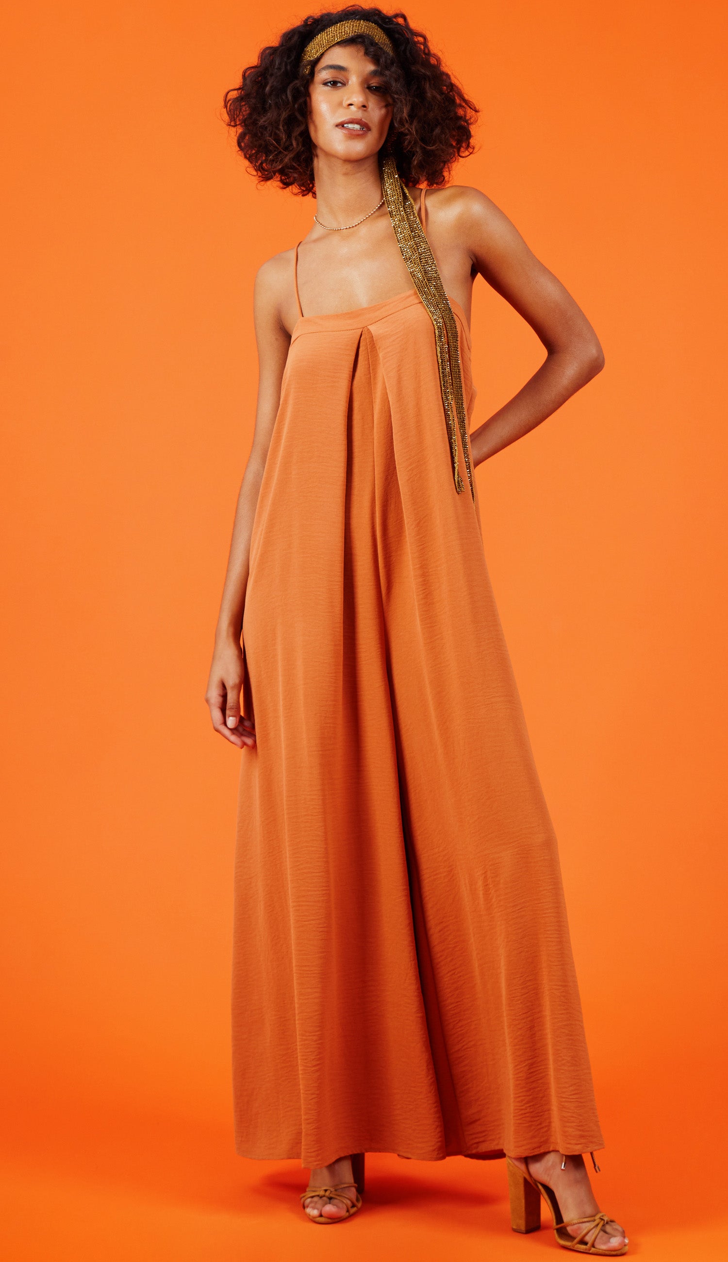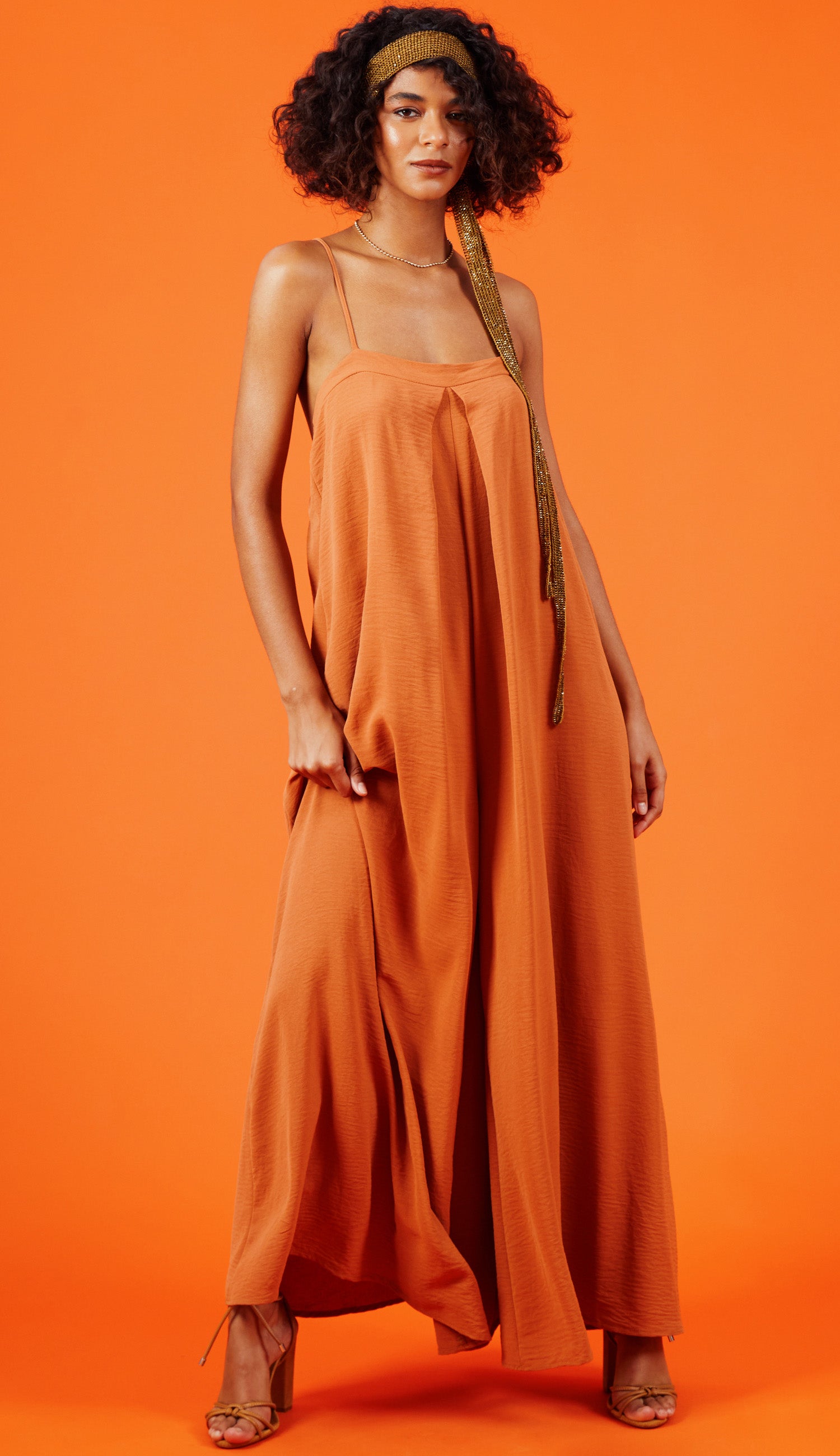 Macacão confeccionado em crepe texturizado com efeito amassadinho. A modelagem é ampla trazendo movimento ao look. As alças são finas e reguláveis. Possui prega no decote que dá um volume super elegante à peça e tira nas costas para ajuste e amarração.