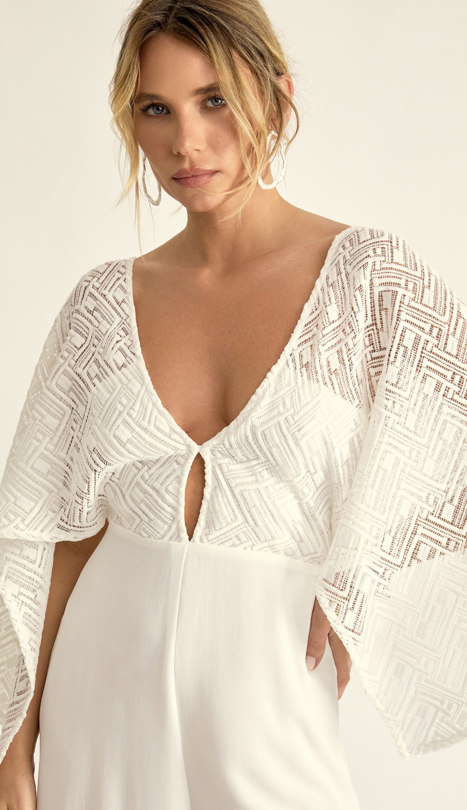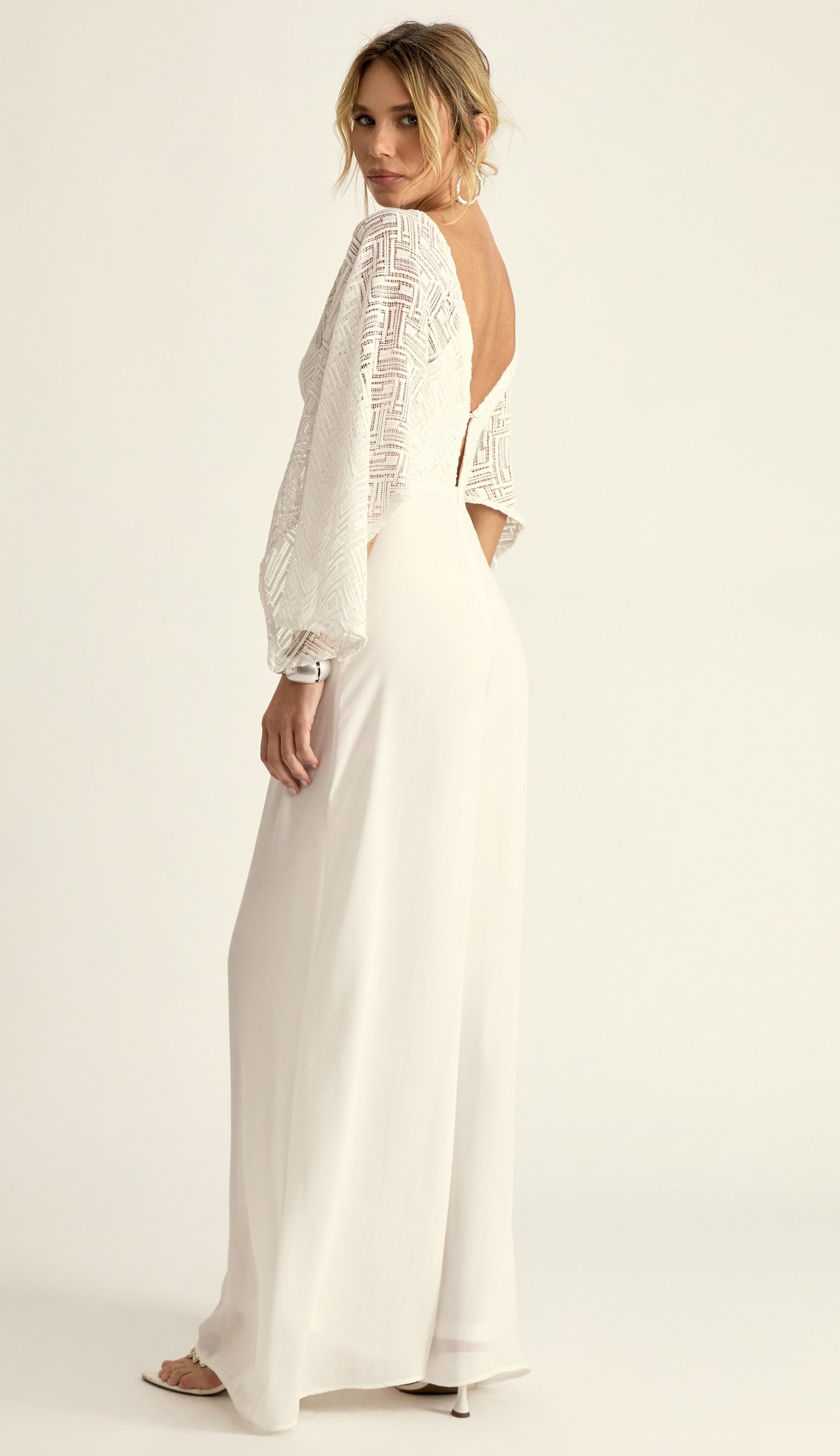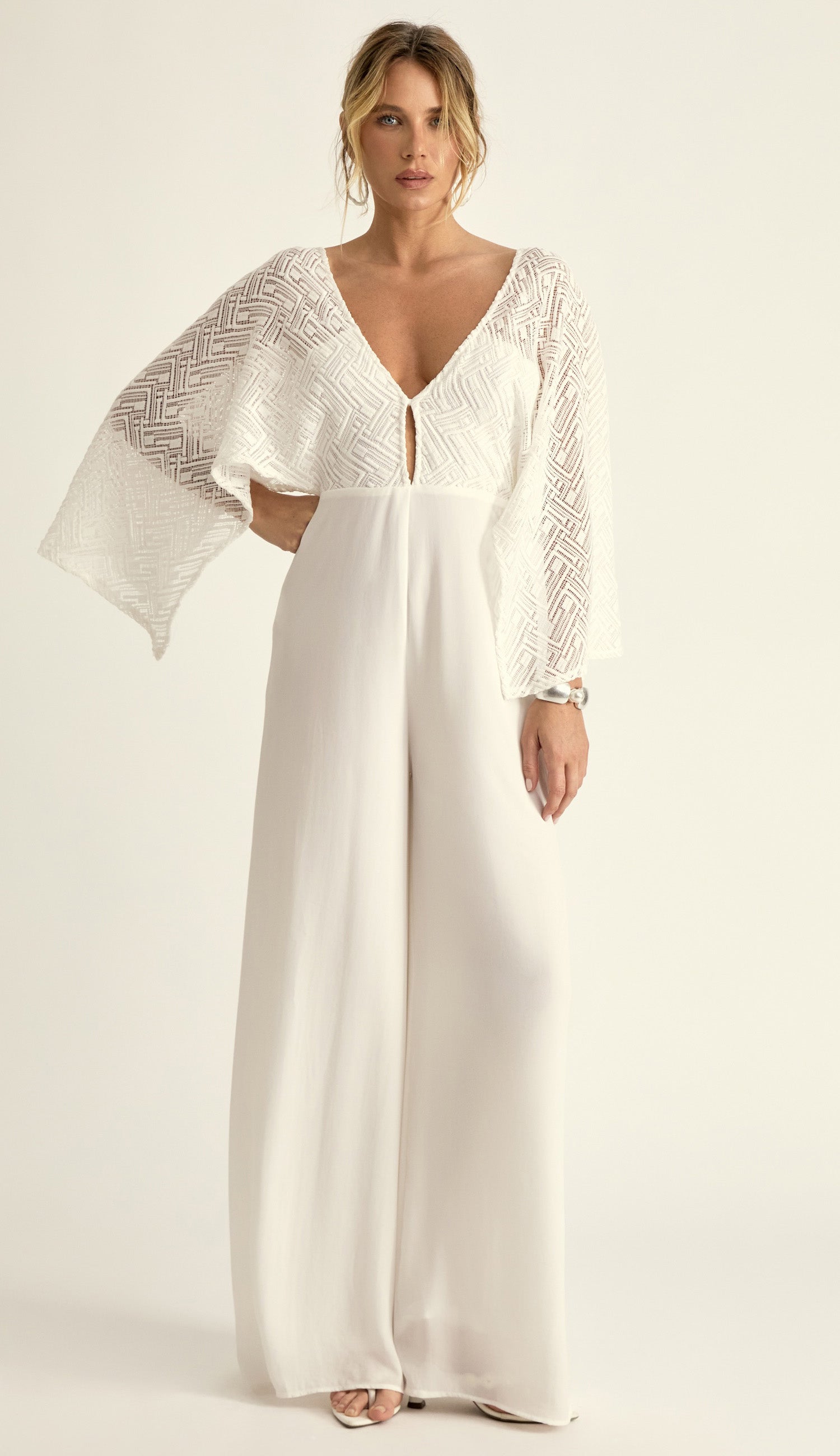 Macacão longo com forro na peça inteira, confeccionado em renda guipir na parte de cima, no busto e em crepe na parte de baixo, na calça. Possui decote em V frente e costas, mangas compridas estilo kimono, calça soltinha e fechamento traseiro por botão esmaltado e zíper invisível.
