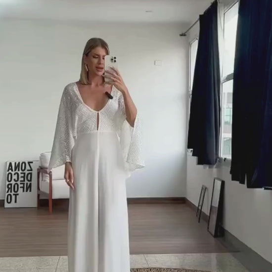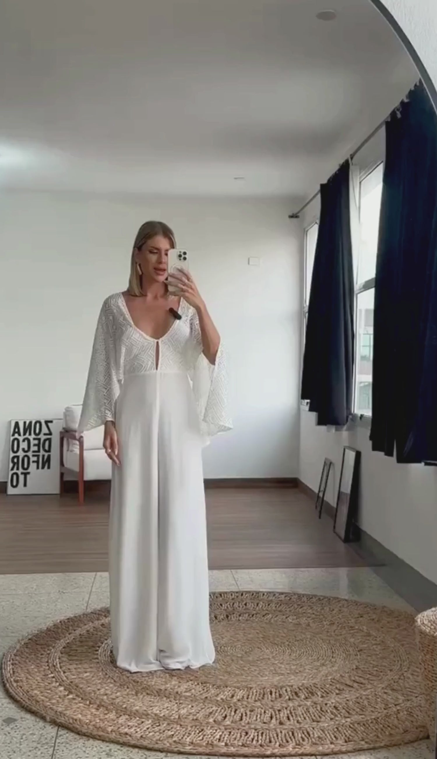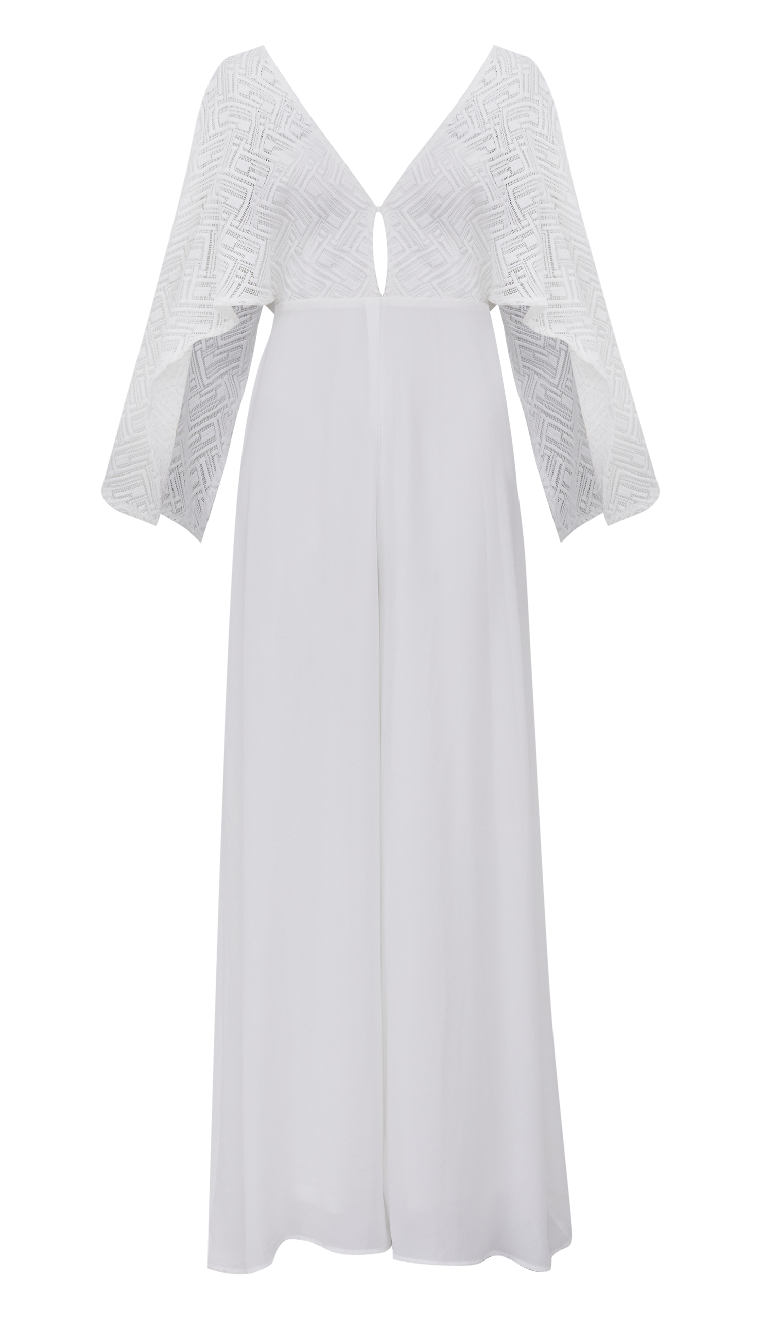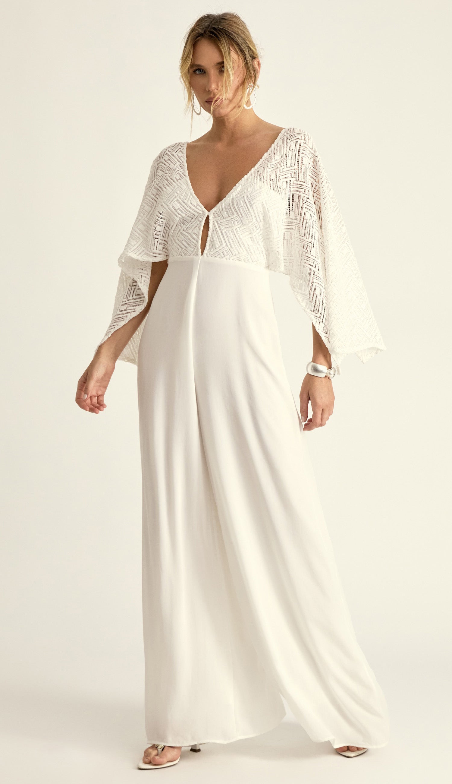 Macacão longo com forro na peça inteira, confeccionado em renda guipir na parte de cima, no busto e em crepe na parte de baixo, na calça. Possui decote em V frente e costas, mangas compridas estilo kimono, calça soltinha e fechamento traseiro por botão esmaltado e zíper invisível.