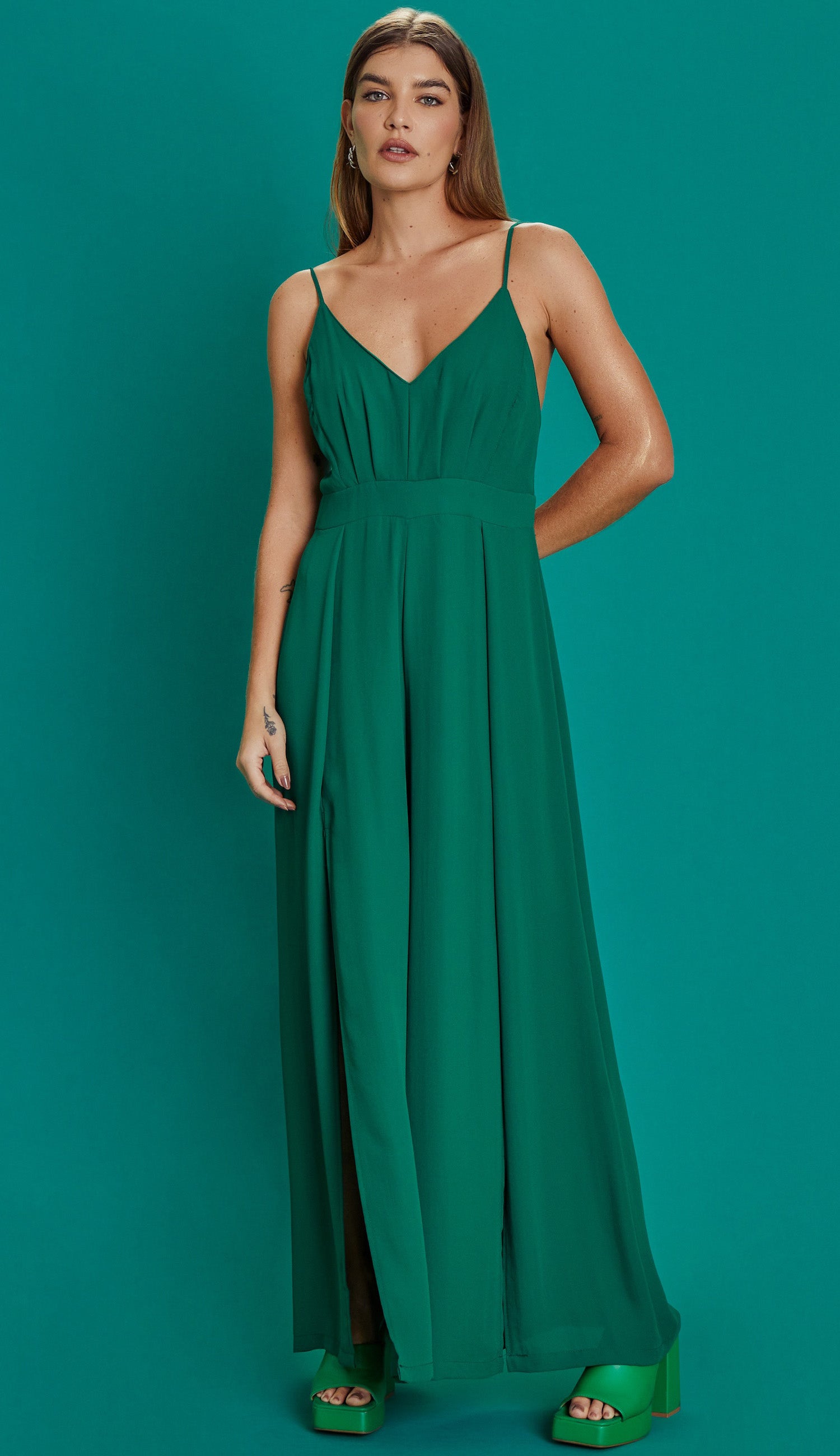 Macacão pantalona confeccionado em crepe com forro. Possui decote em V, alcinhas compridas para ajuste e amarração nas costas, busto com recorte e pregas, seguido de pala e preguinhas nas pernas também, fendas frontais e fechamento traseiro por zíper invisível.