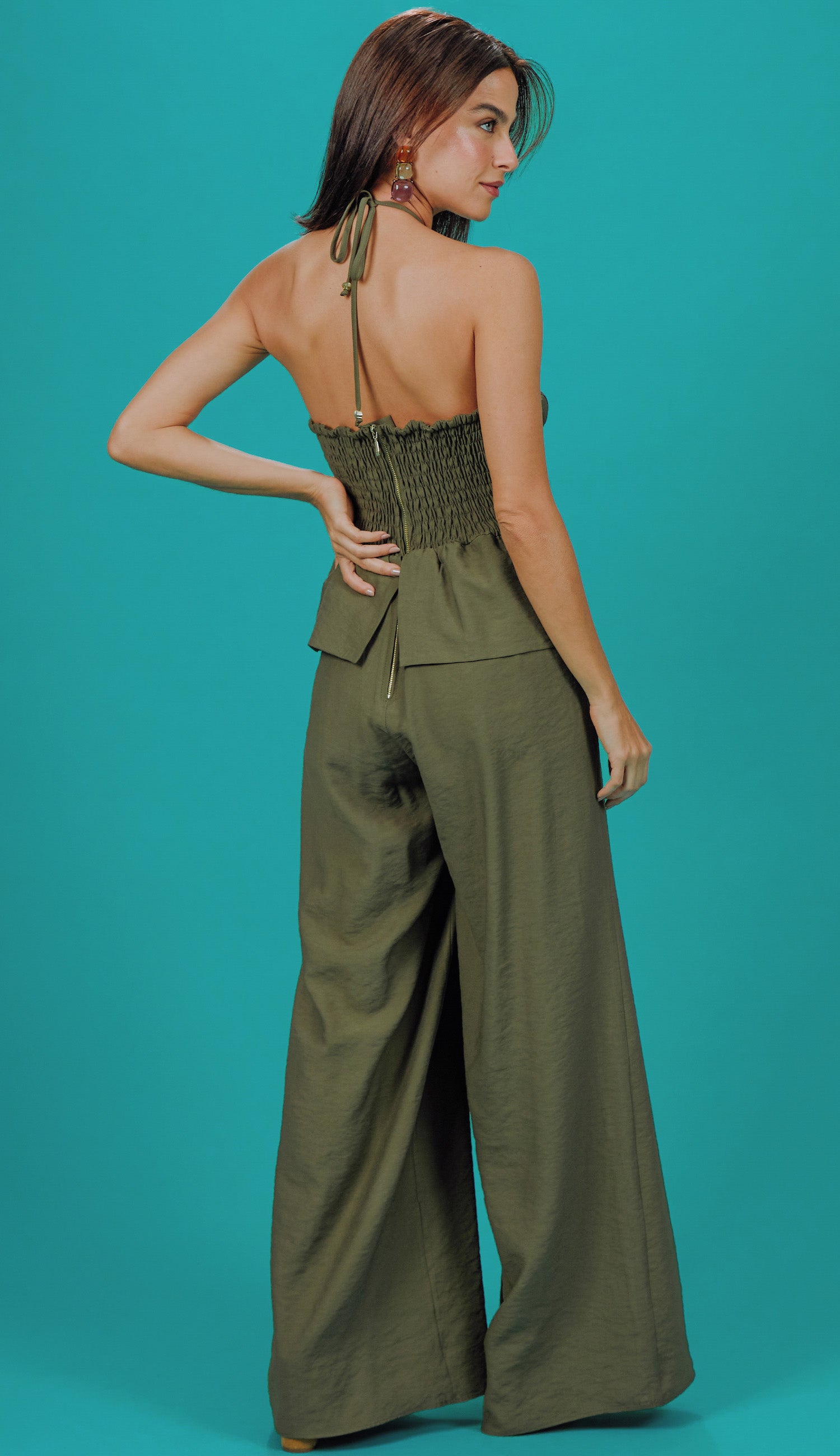 Macacão pantalona frente única confeccionado em alfaiataria de poliviscose com aspecto de liocel e efeito amassadinho. Possui decote em V transpassado com tirinhas compridas para amarrar no pescoço com ponteiras de metal em formato de conchinhas, forro no busto, silicone interno no decote para maior sustentação, recorte na cintura com sobreposição de tecido estilo "peplum", lastex franzido nas costas para melhor ajuste ao corpo e fechamento traseiro por zíper de metal.