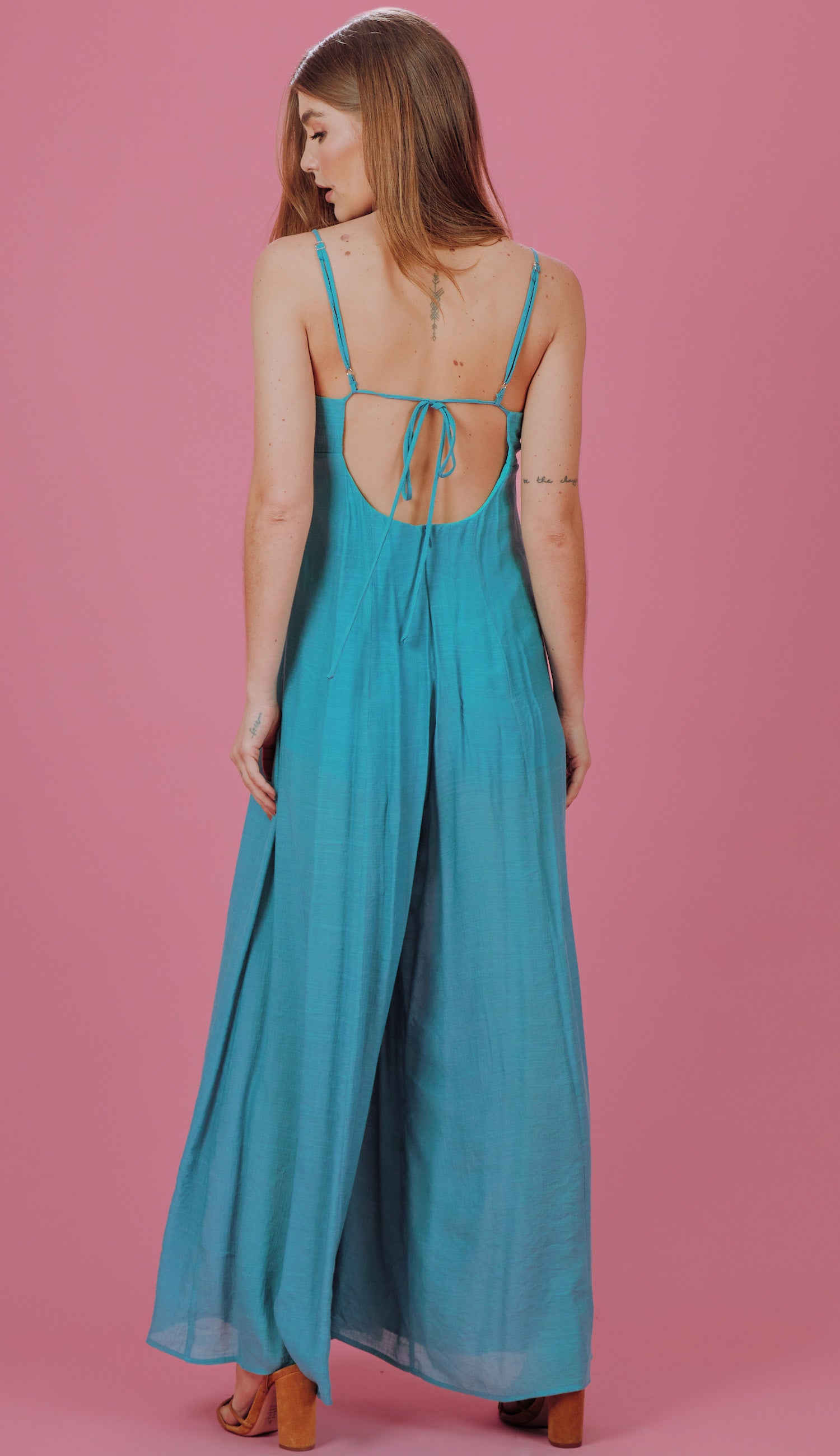 Macacão pantalona com forro, confeccionado em poliviscose texturizado com aspecto de linho. Possui alcinhas reguláveis presas em alças fixas nas costas para amarração, decote coração com elástico interno, recorte com franzidinhos no busto, modelagem império com marcação logo abaixo do busto e restante do comprimento solto, recortes frontais e fechamento traseiro por zíper invisível.