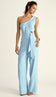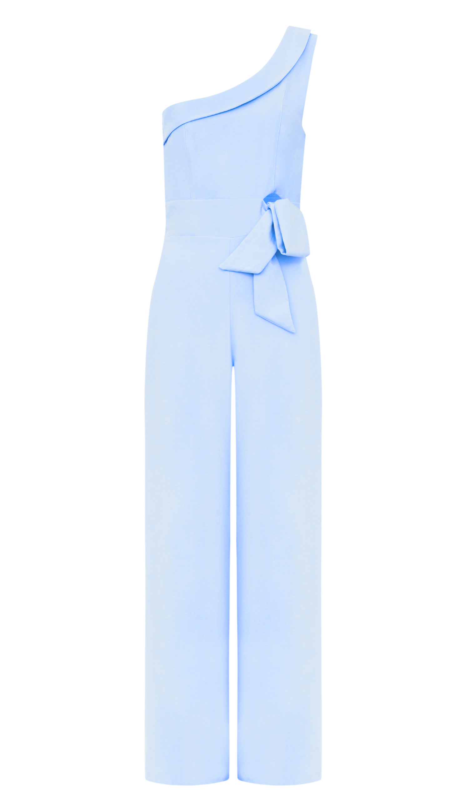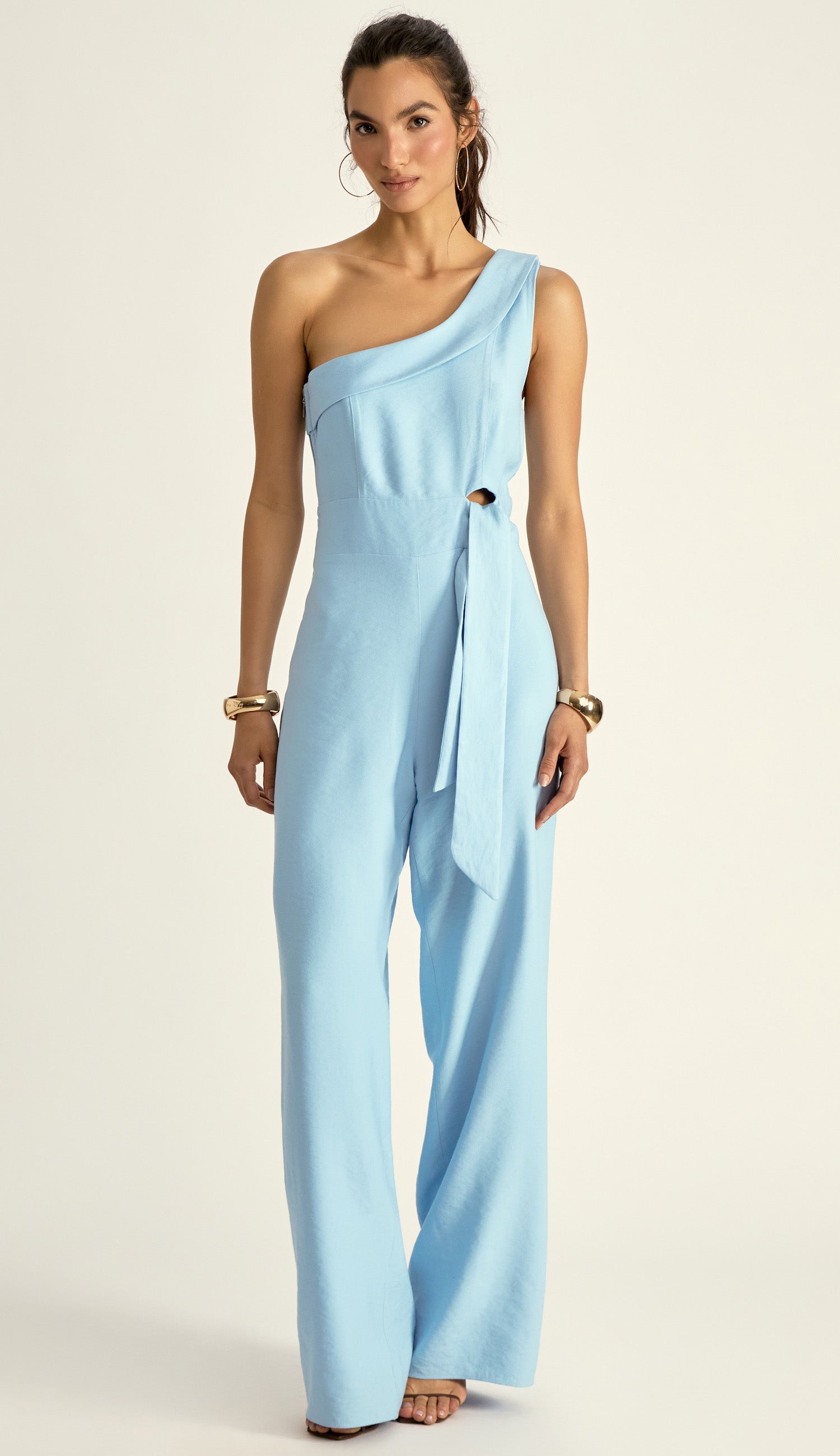 Macacão confeccionado em sarja de alfaiataria em viscose mais encorpada. Possui forro na peça inteira, pernas retas soltinhas, decote ombro único regata com pala dobrada, pala também na cintura com vazado na lateral seguida de faixa fixa para amarrar, recortes que modelam a peça e fechamento lateral por zíper de metal que tem o pingente com a conchinha da Laguna gravada.