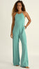 Macacão confeccionado em linho texturizado com forro na peça inteira. Possui decote halter, alcinhas reguláveis com botãozinho esmaltado para cruzar as alças nas costas criando um lindo decote profundo nessa região, deixando as costas nuas; pernas soltas estilo wide, bolsos laterais, recorte frontal no centro que alonga a silhueta e elástico franzido na parte traseira do cós com fechamento por zíper invisível. Por sua composição mista do tecido, possui a aparência e toque elegantes do linho, mas com a vantagem de não amassar com tanta facilidade; tornando a peça muito prática e confortável.