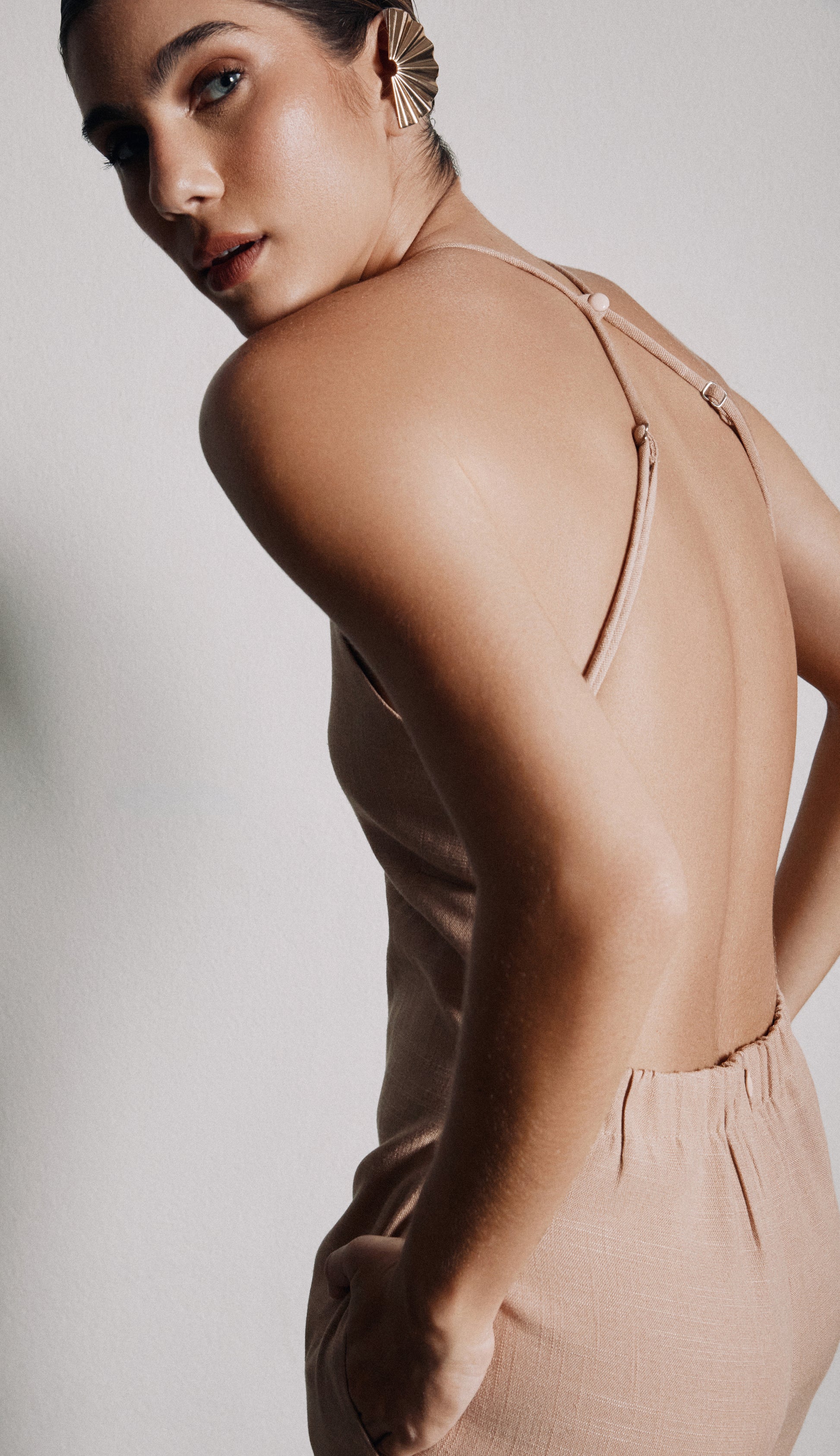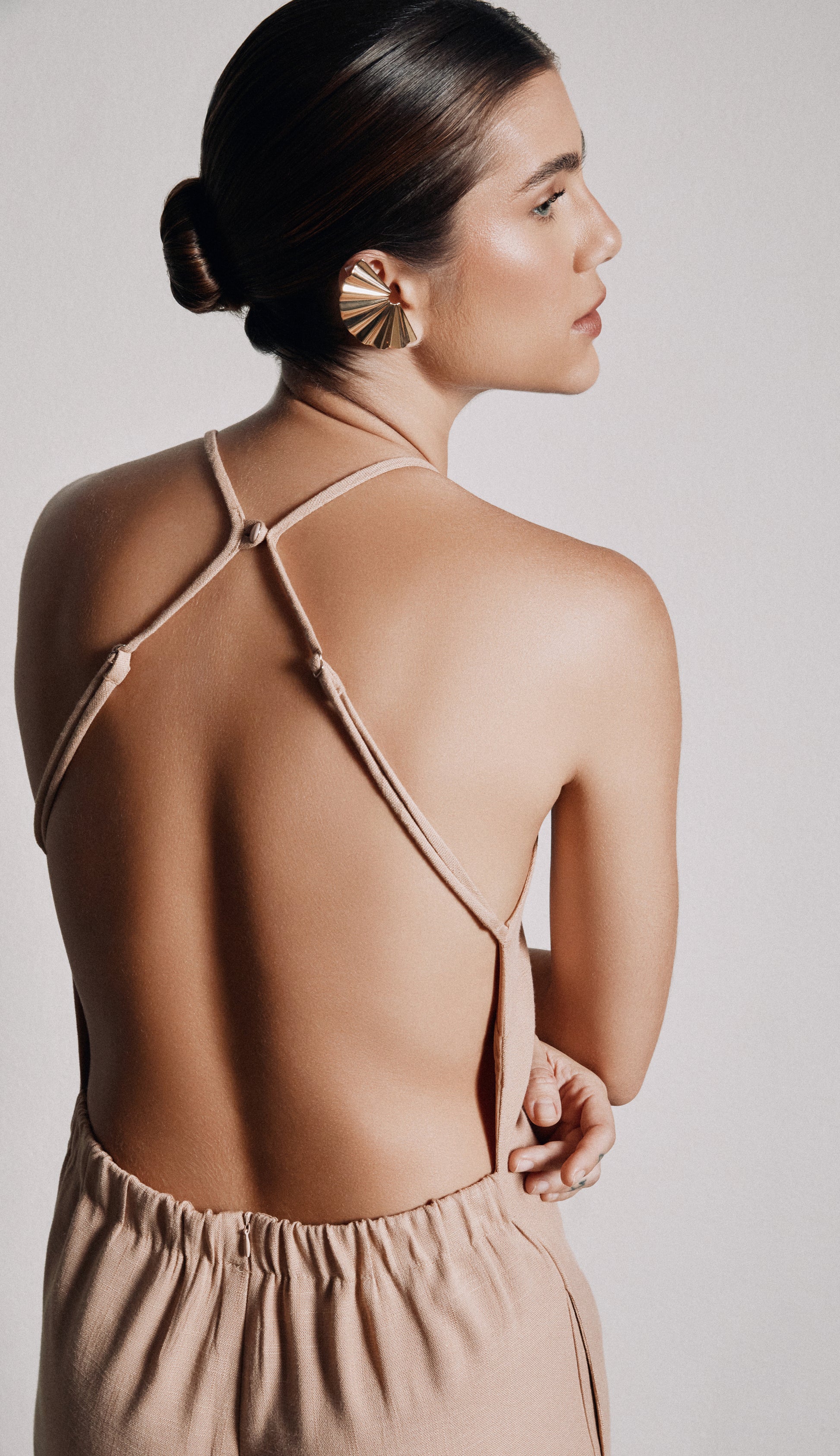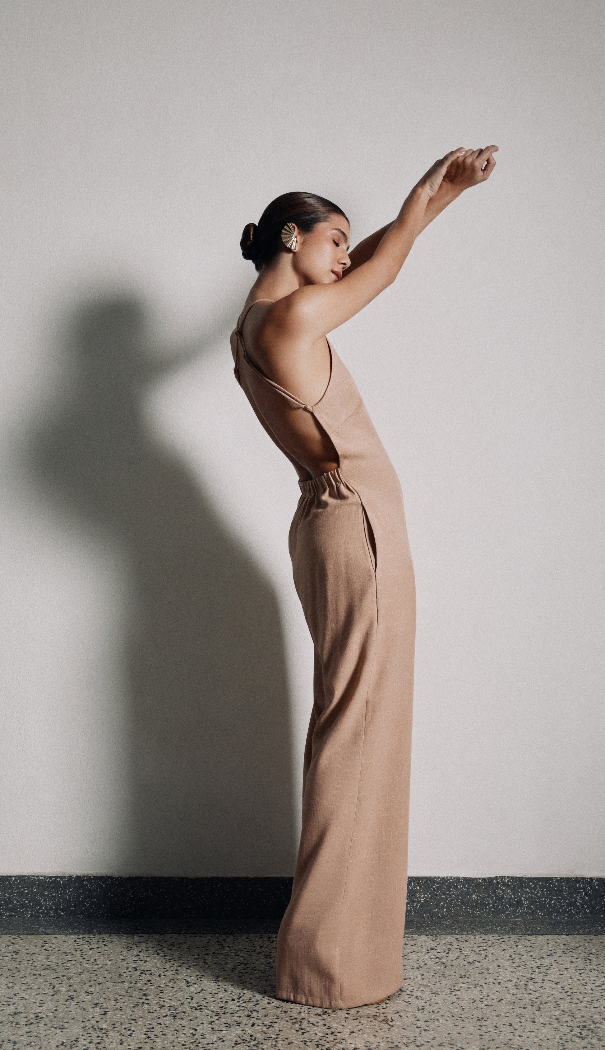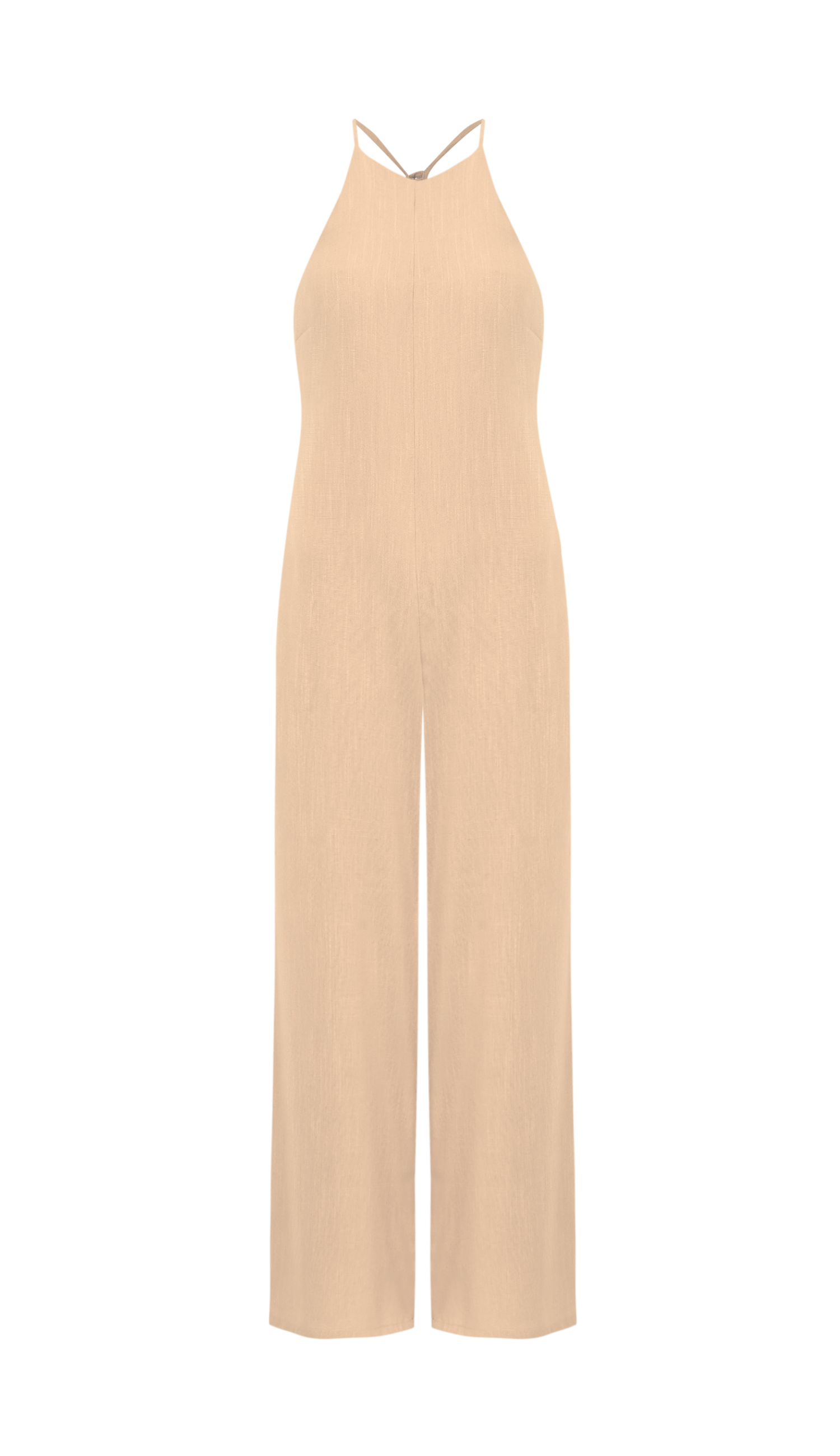 Macacão confeccionado em linho texturizado com forro na peça inteira. Possui decote halter, alcinhas reguláveis com botãozinho esmaltado para cruzar as alças nas costas criando um lindo decote profundo nessa região, deixando as costas nuas; pernas soltas estilo wide, bolsos laterais, recorte frontal no centro que alonga a silhueta e elástico franzido na parte traseira do cós com fechamento por zíper invisível. Por sua composição mista do tecido, possui a aparência e toque elegantes do linho, mas com a vantagem de não amassar com tanta facilidade; tornando a peça muito prática e confortável.