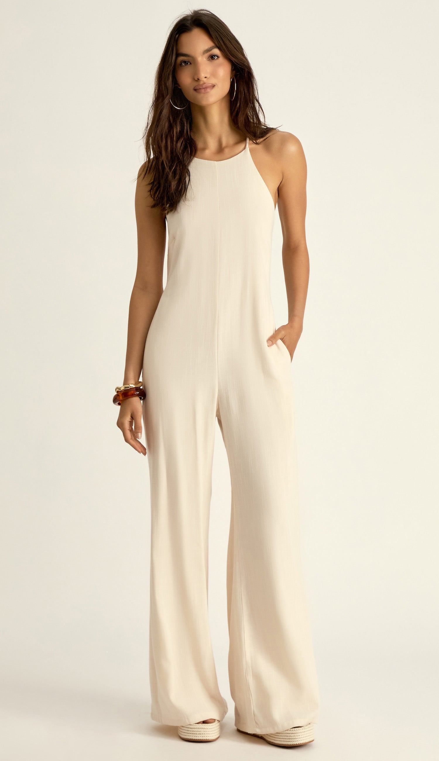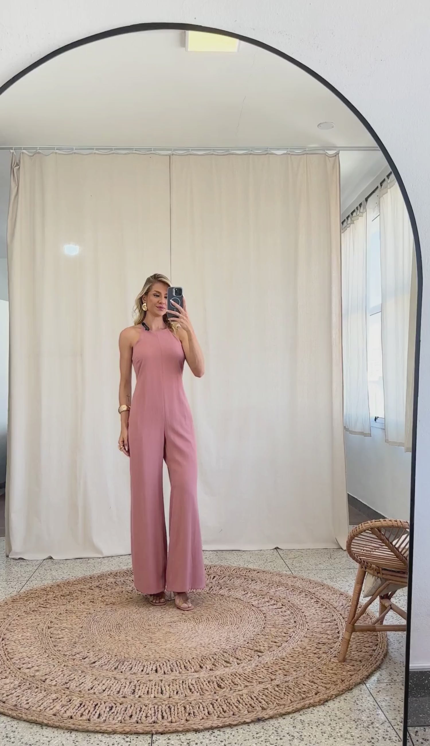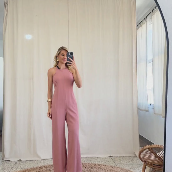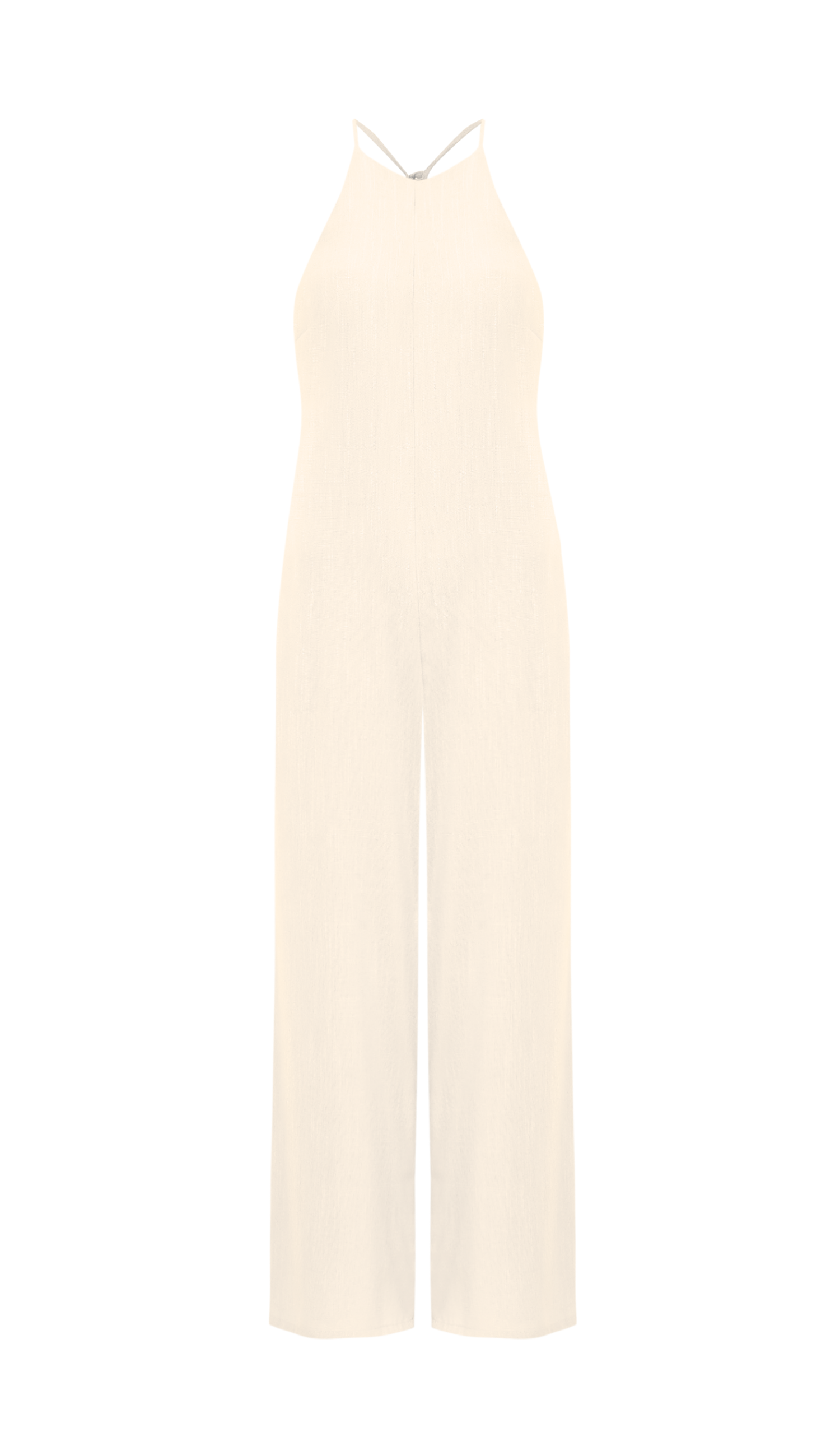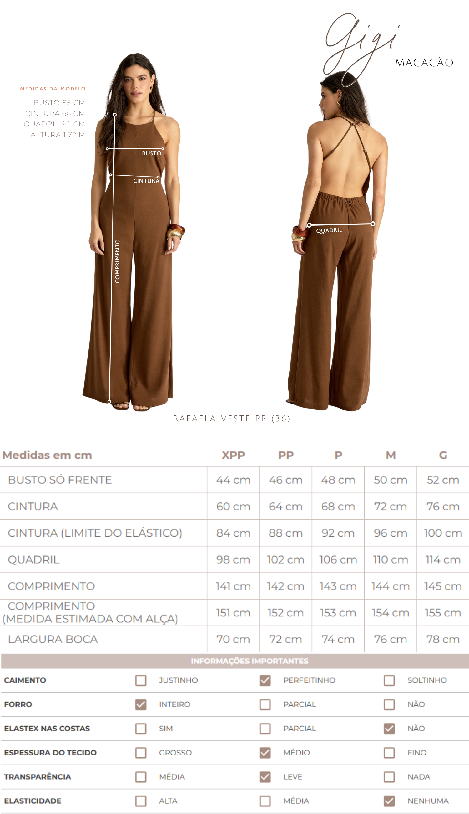 Macacão confeccionado em linho texturizado com forro na peça inteira. Possui decote halter, alcinhas reguláveis com botãozinho esmaltado para cruzar as alças nas costas criando um lindo decote profundo nessa região, deixando as costas nuas; pernas soltas estilo wide, bolsos laterais, recorte frontal no centro que alonga a silhueta e elástico franzido na parte traseira do cós com fechamento por zíper invisível. Por sua composição mista do tecido, possui a aparência e toque elegantes do linho, mas com a vantagem de não amassar com tanta facilidade; tornando a peça muito prática e confortável.