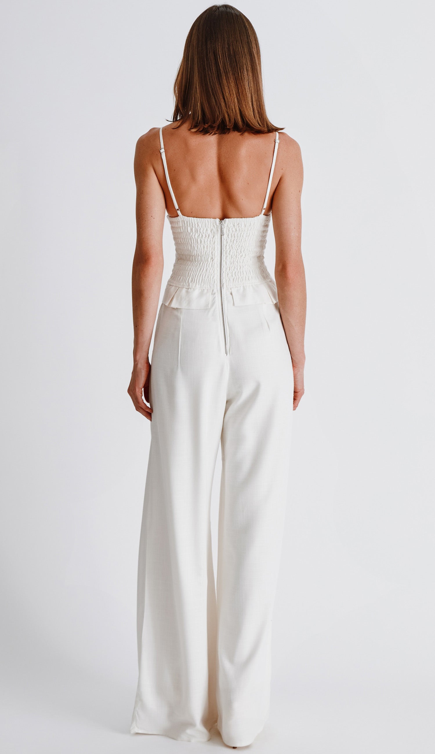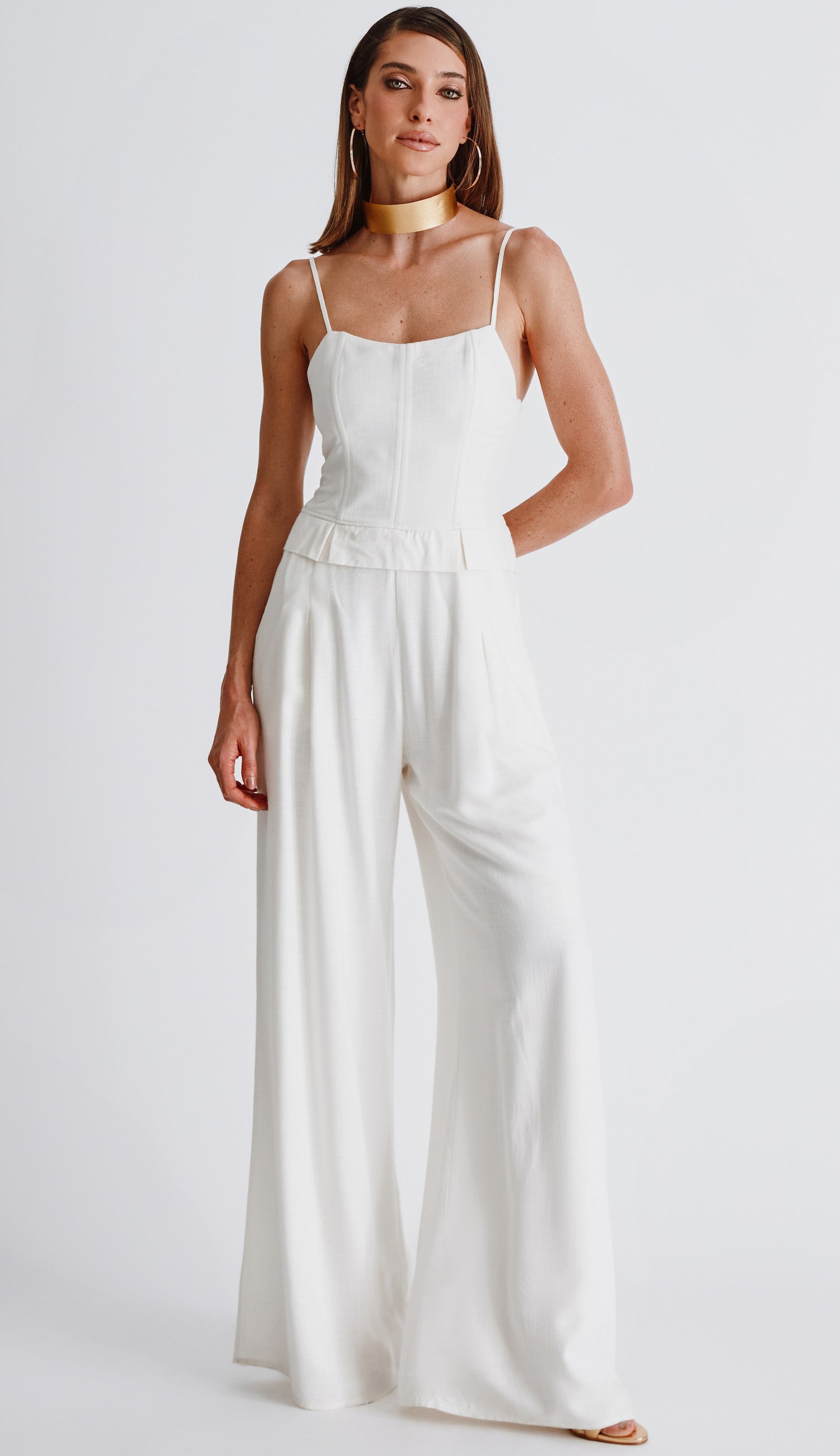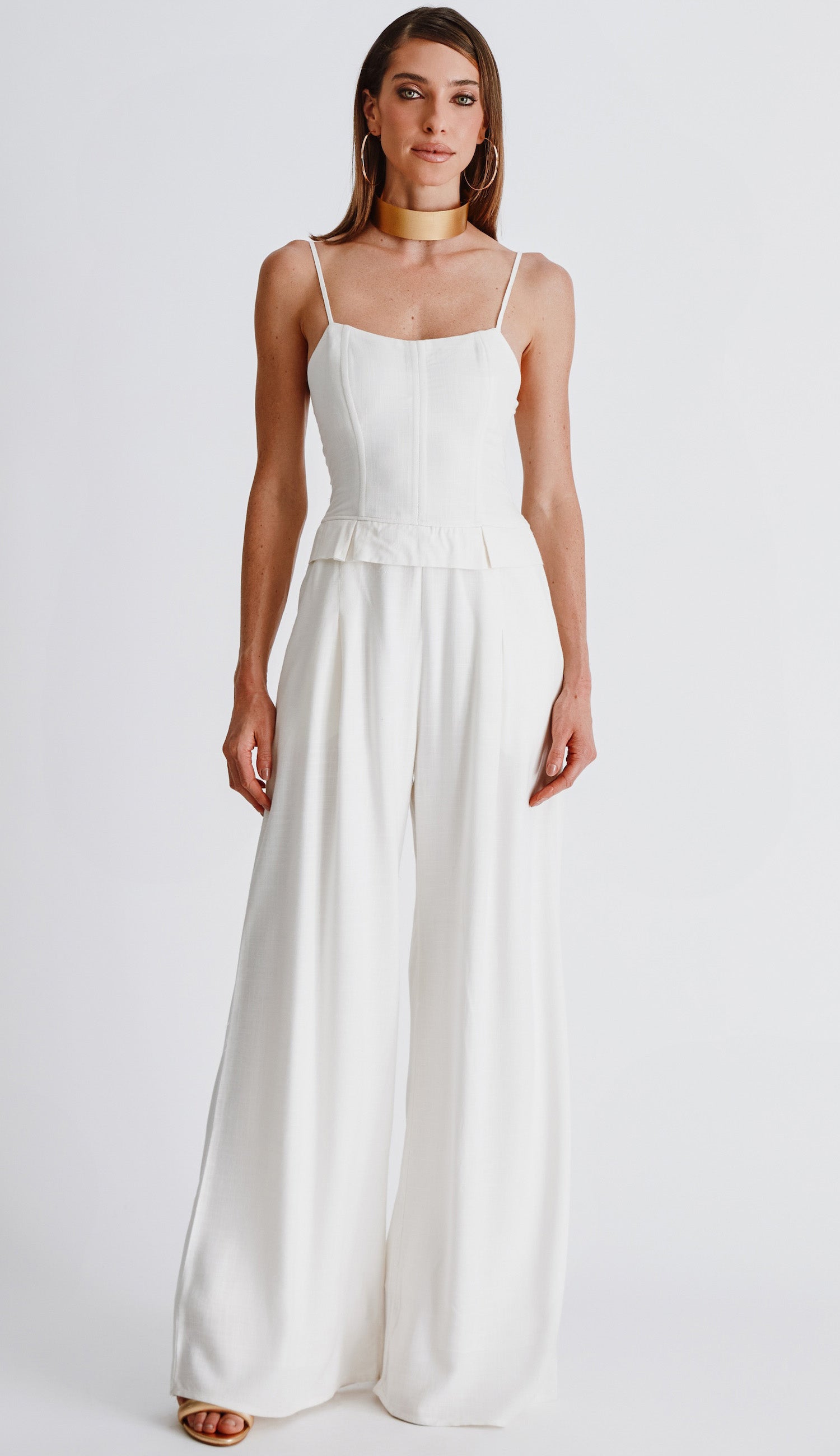 Macacão com forro, confeccionado em viscose mais encorpada com toque e aspecto de linho. Possui decote princesa, alcinhas reguláveis, barbatanas no corpo, para estruturar a peça, babadinho com pregas na cintura estilo peplum, bolsos laterais, pregas frontais, lastex franzido nas costas para melhor ajuste ao corpo e fechamento traseiro por zíper de metal com pingente que possui o delicado detalhe da conchinha da Laguna gravado, o que dá um charme todo especial à peça.