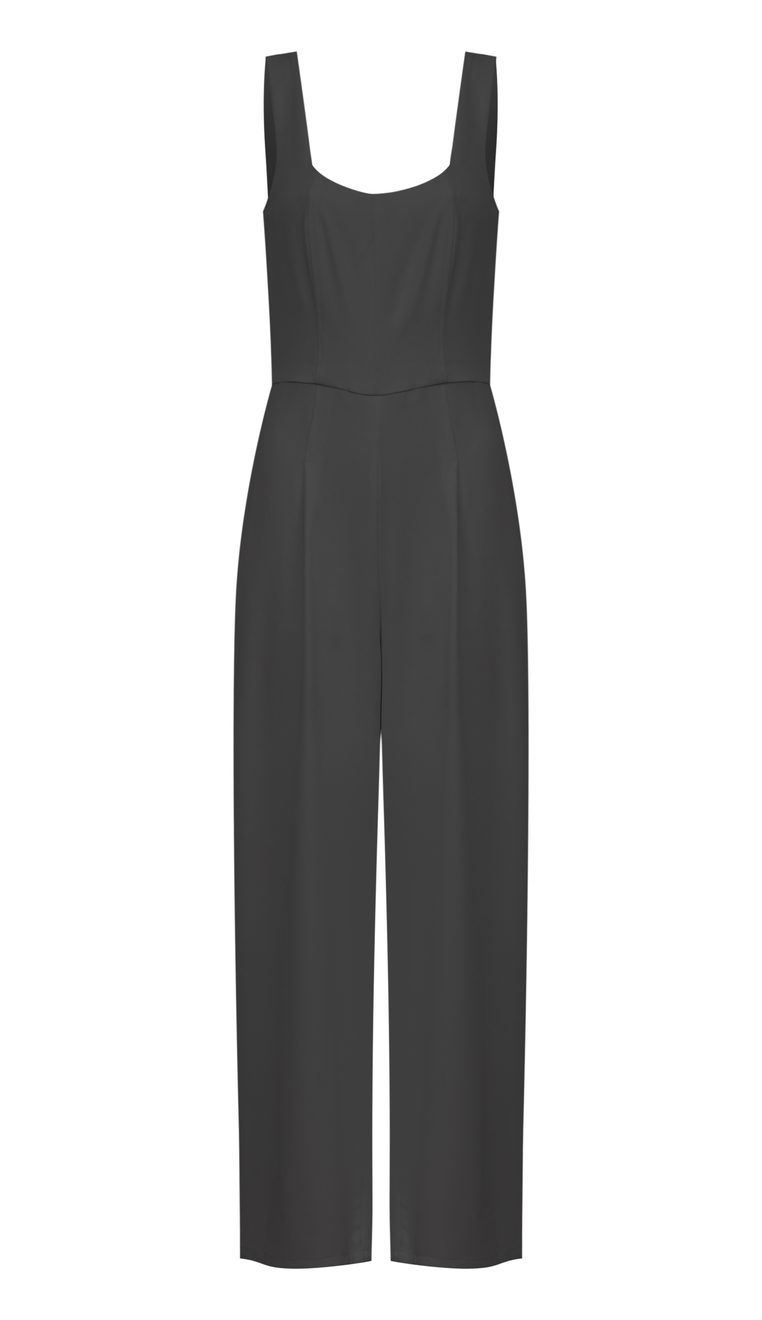Macacão confeccionado em crepe de alfaiataria com forro na calça. Possui decote princesa, alças mais largas, recortes pespontados que modelam o corpo da peça, pregas frontais, pernas retas soltinhas e fechamento traseiro por zíper de metal com pingente de conchinha.