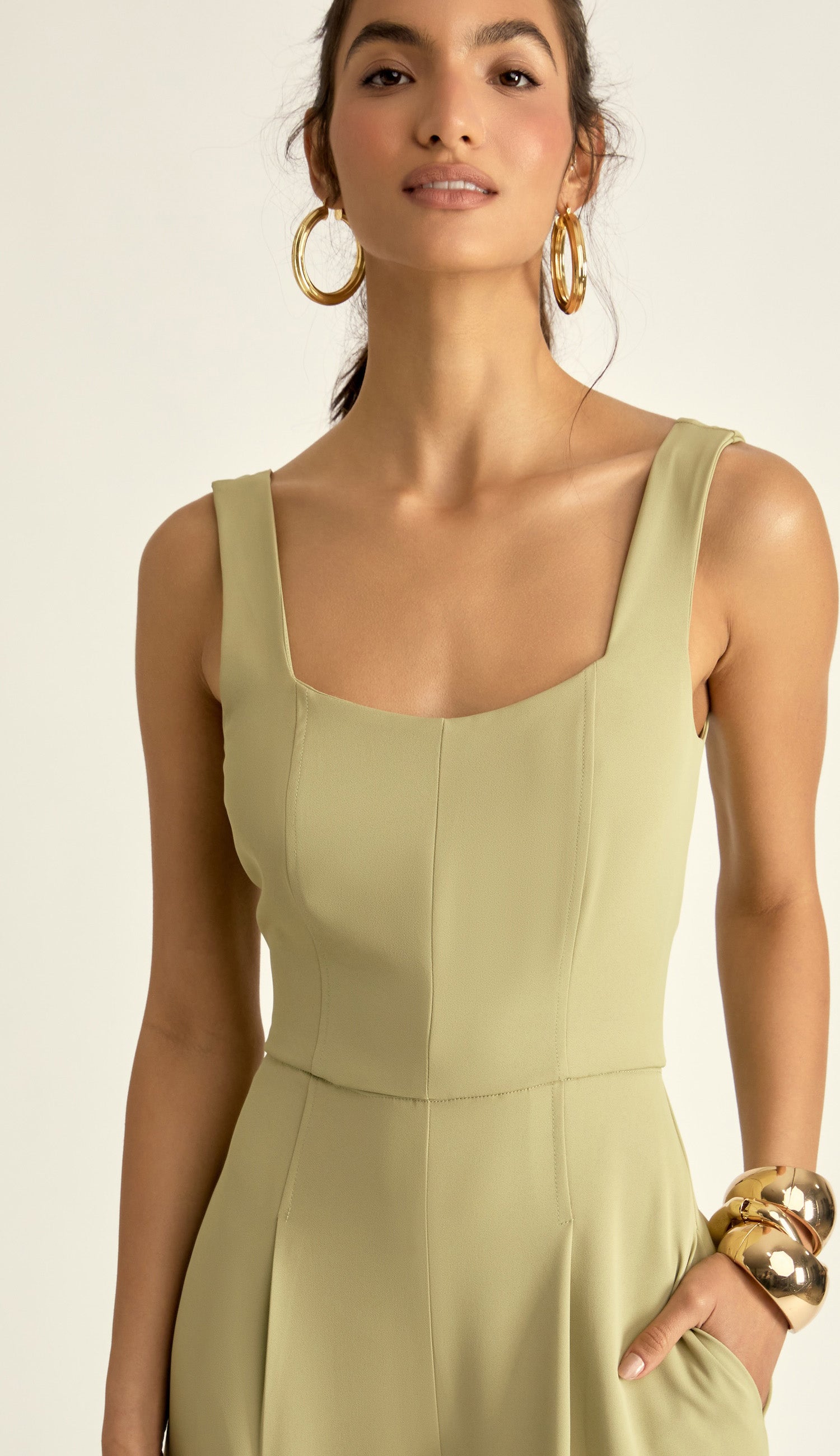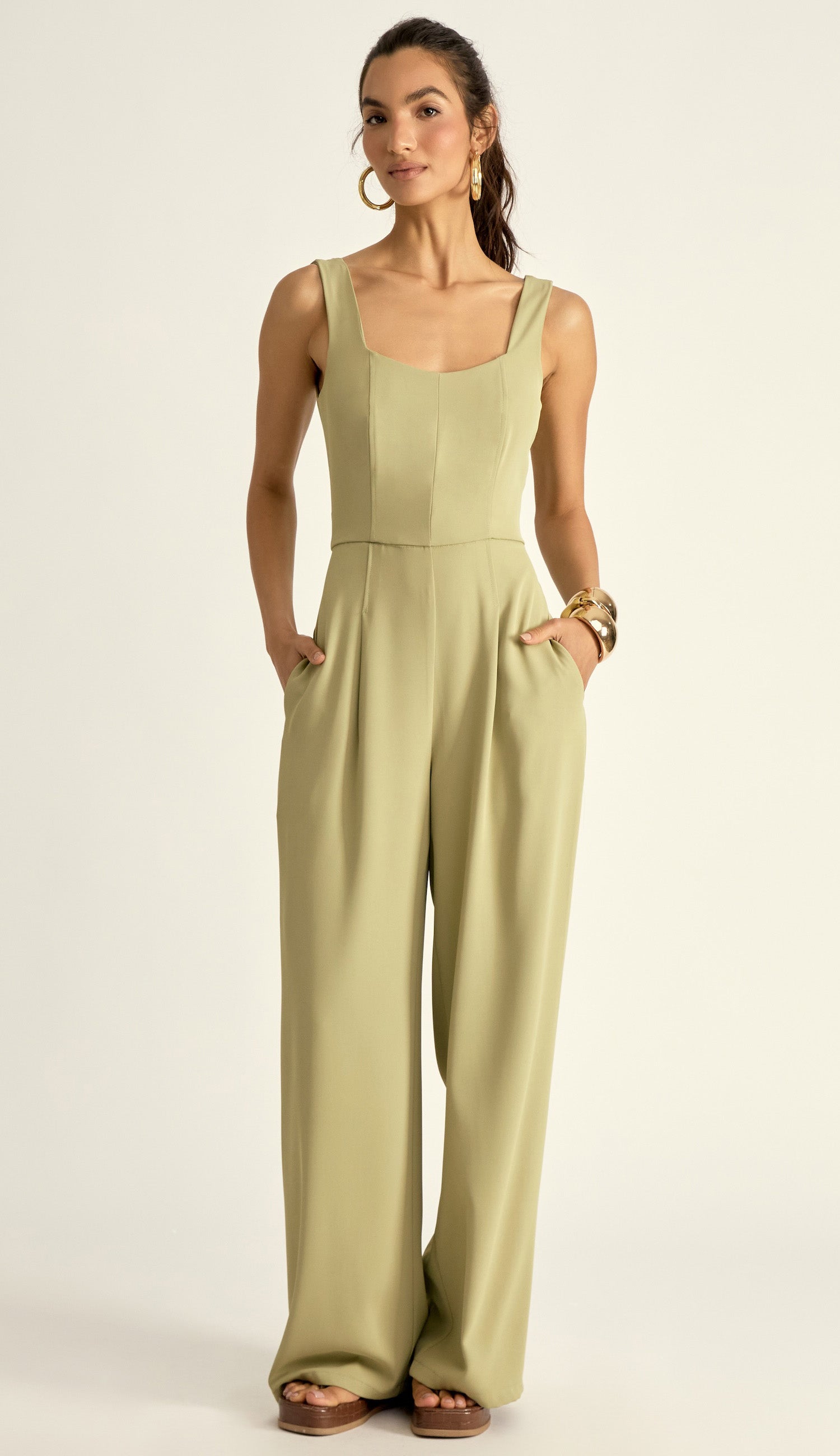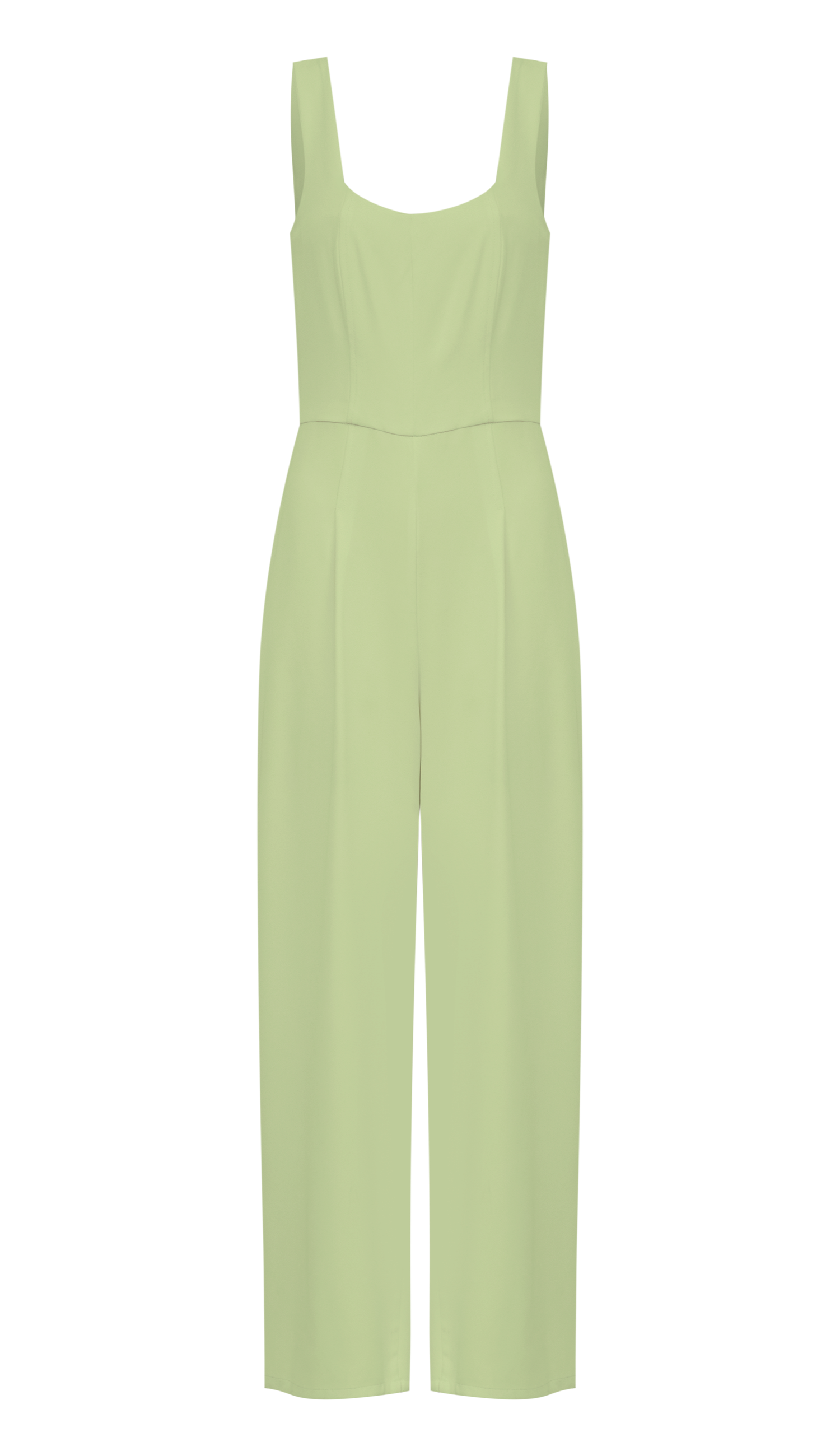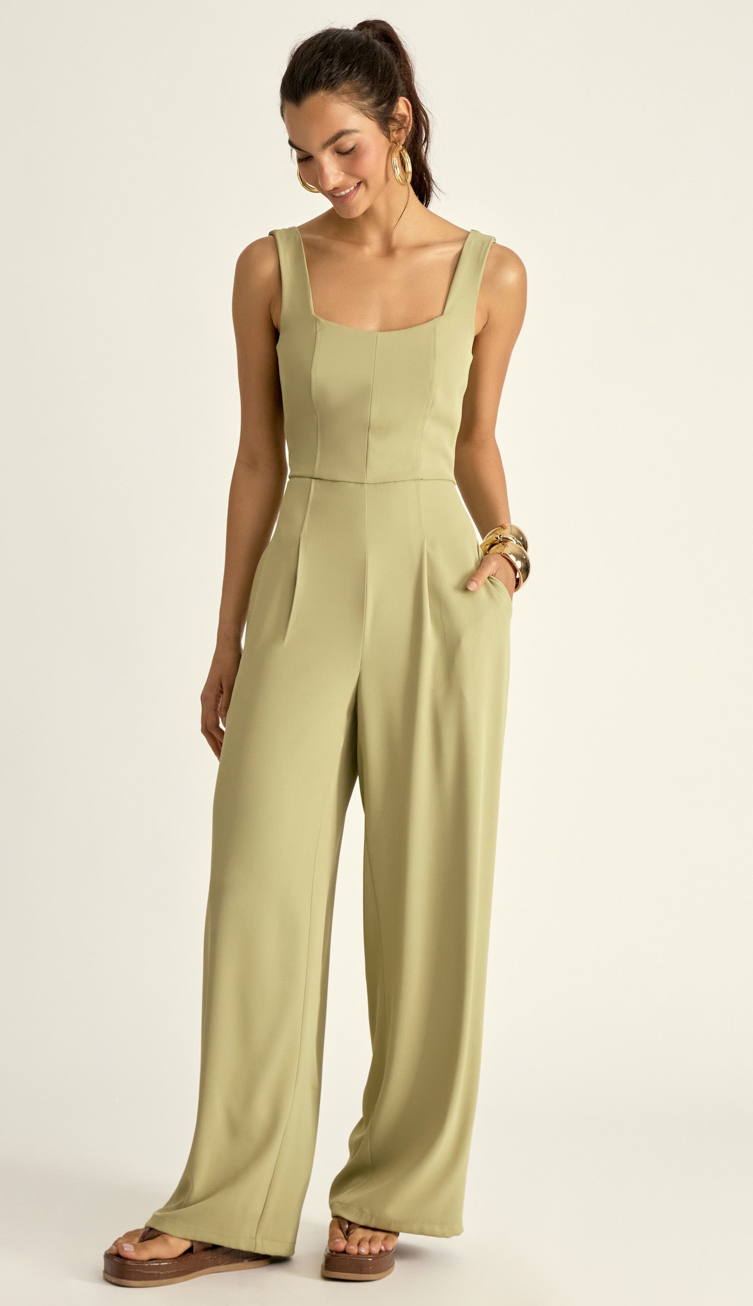 Macacão confeccionado em crepe de alfaiataria com forro na calça. Possui decote princesa, alças mais largas, recortes pespontados que modelam o corpo da peça, pregas frontais, pernas retas soltinhas e fechamento traseiro por zíper de metal com pingente de conchinha.
