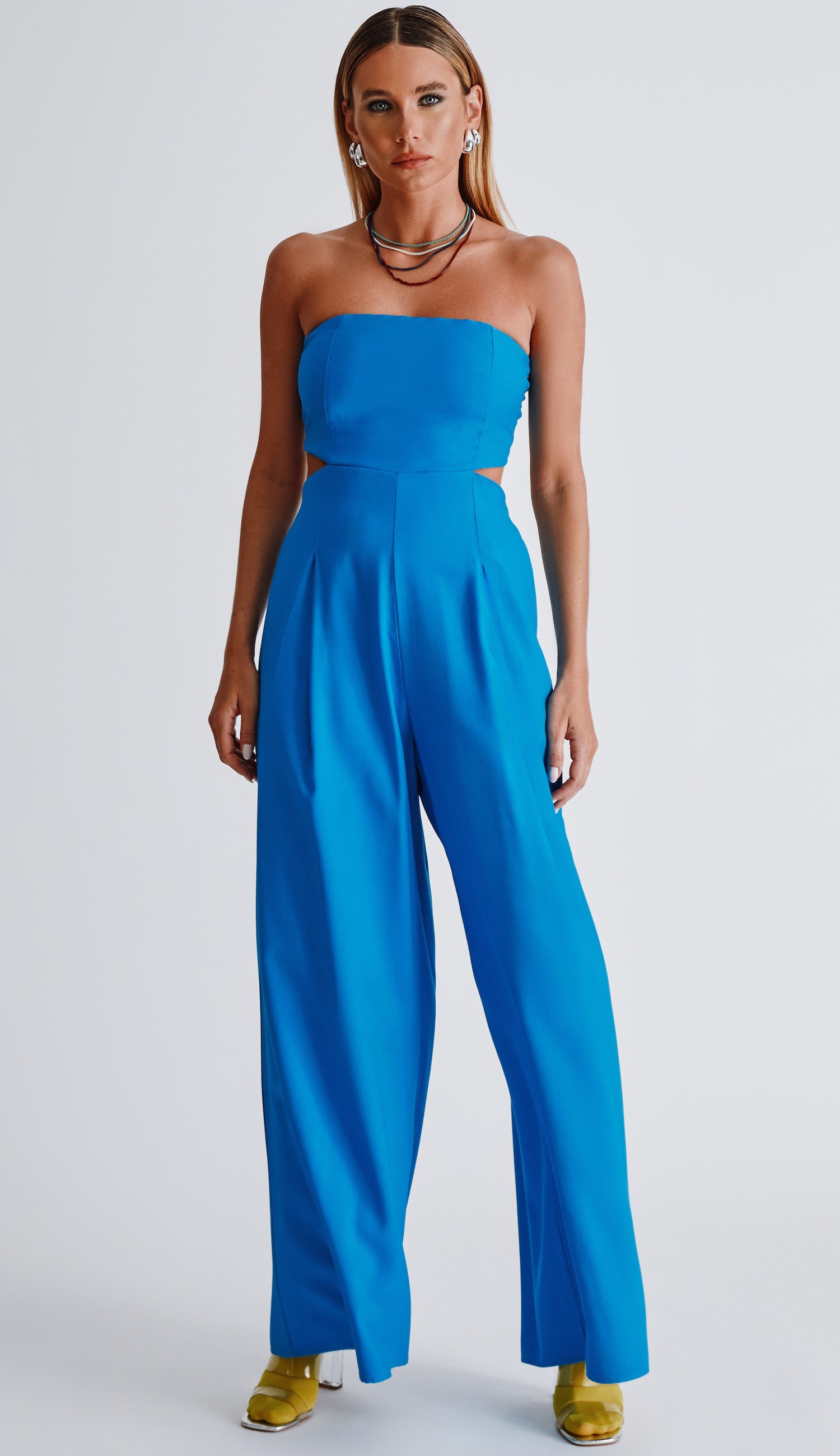 Macacão pantalona com forro e sem mangas, confeccionado em sarja de alfaiataria em viscose mais encorpada. Possui decote reto com silicone elástico interno para maior segurança; busto fixo à calça apenas por recorte frontal, deixando toda a cintura à mostra; lastex franzido nas costas do busto, para maior conforto; pregas e bolsos frontais; elástico nas costas da calça e fechamento traseiro por zíper de metal com pingente que possui o delicado detalhe da conchinha da Laguna gravado no metal, o que dá um charme todo especial à peça.