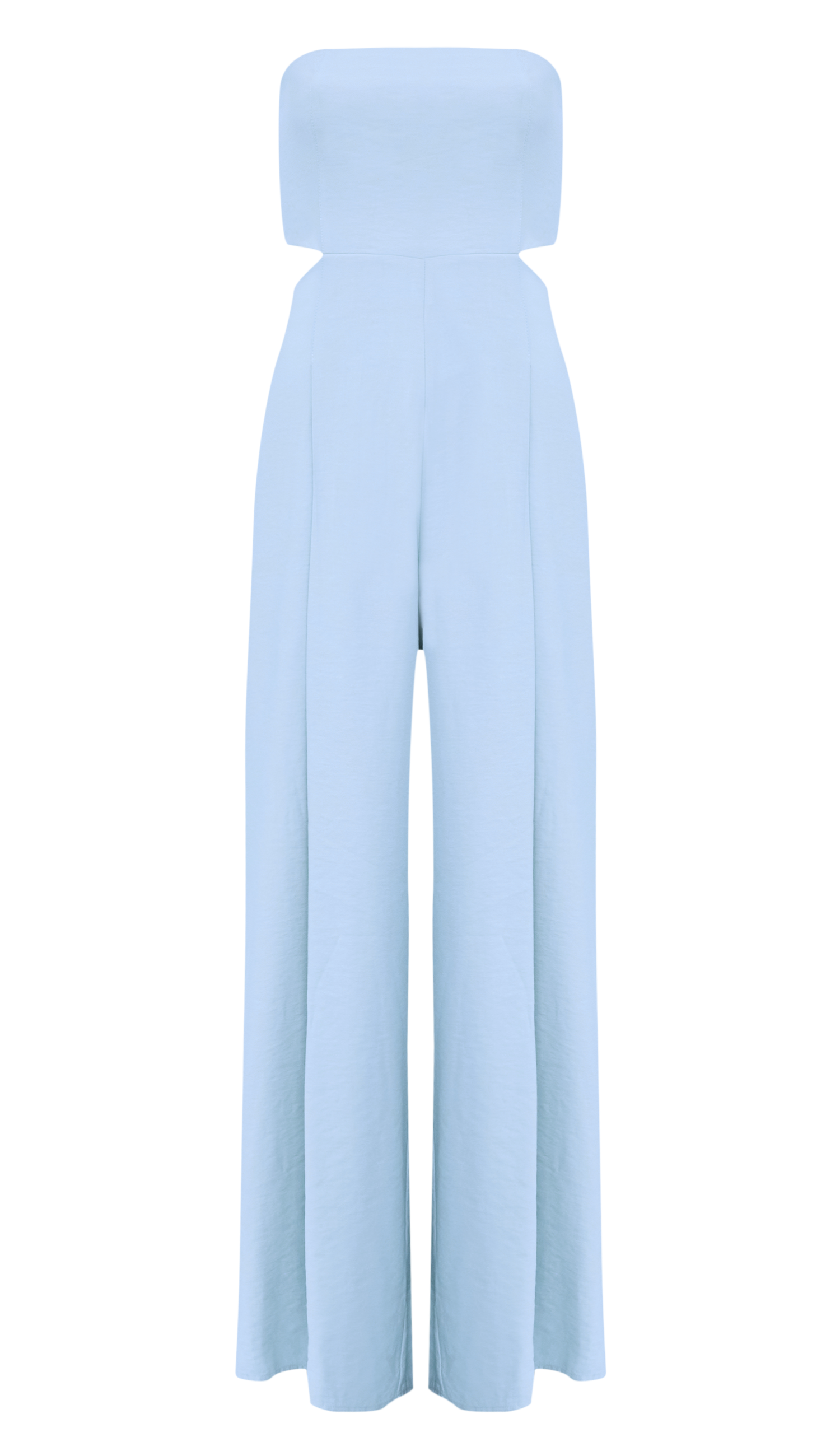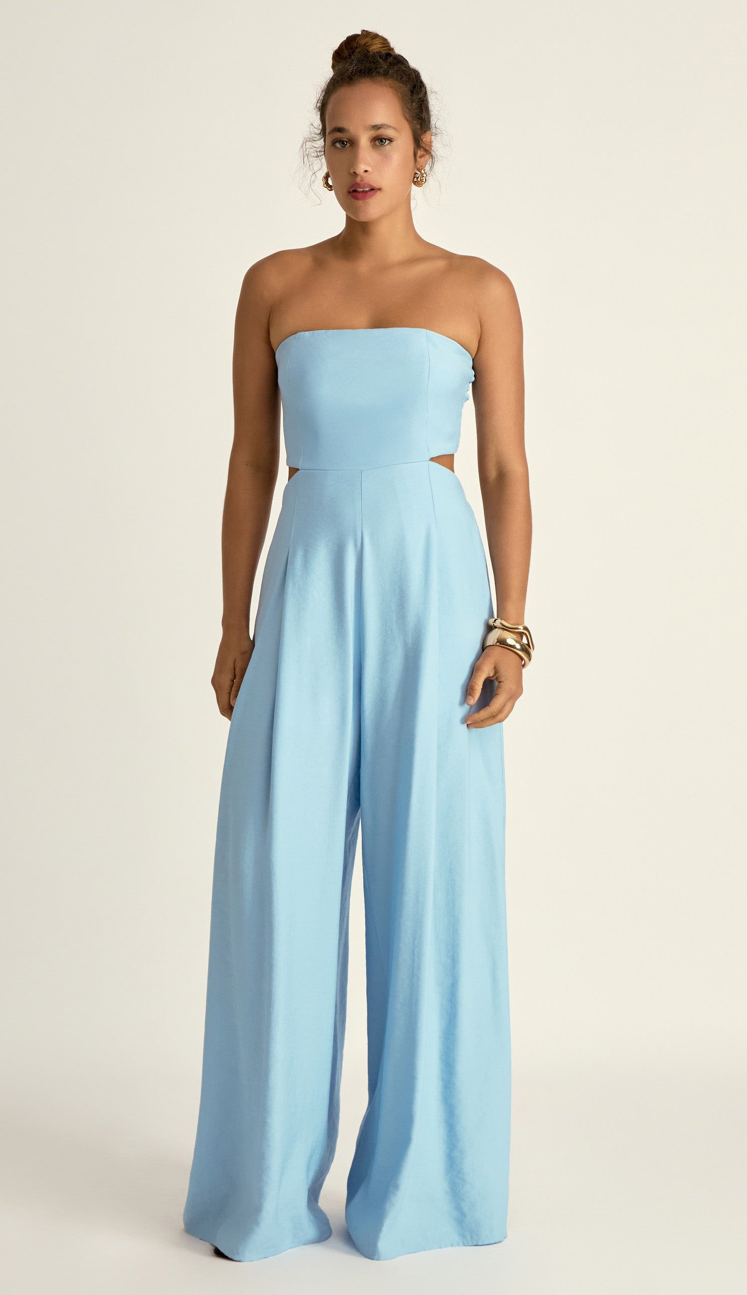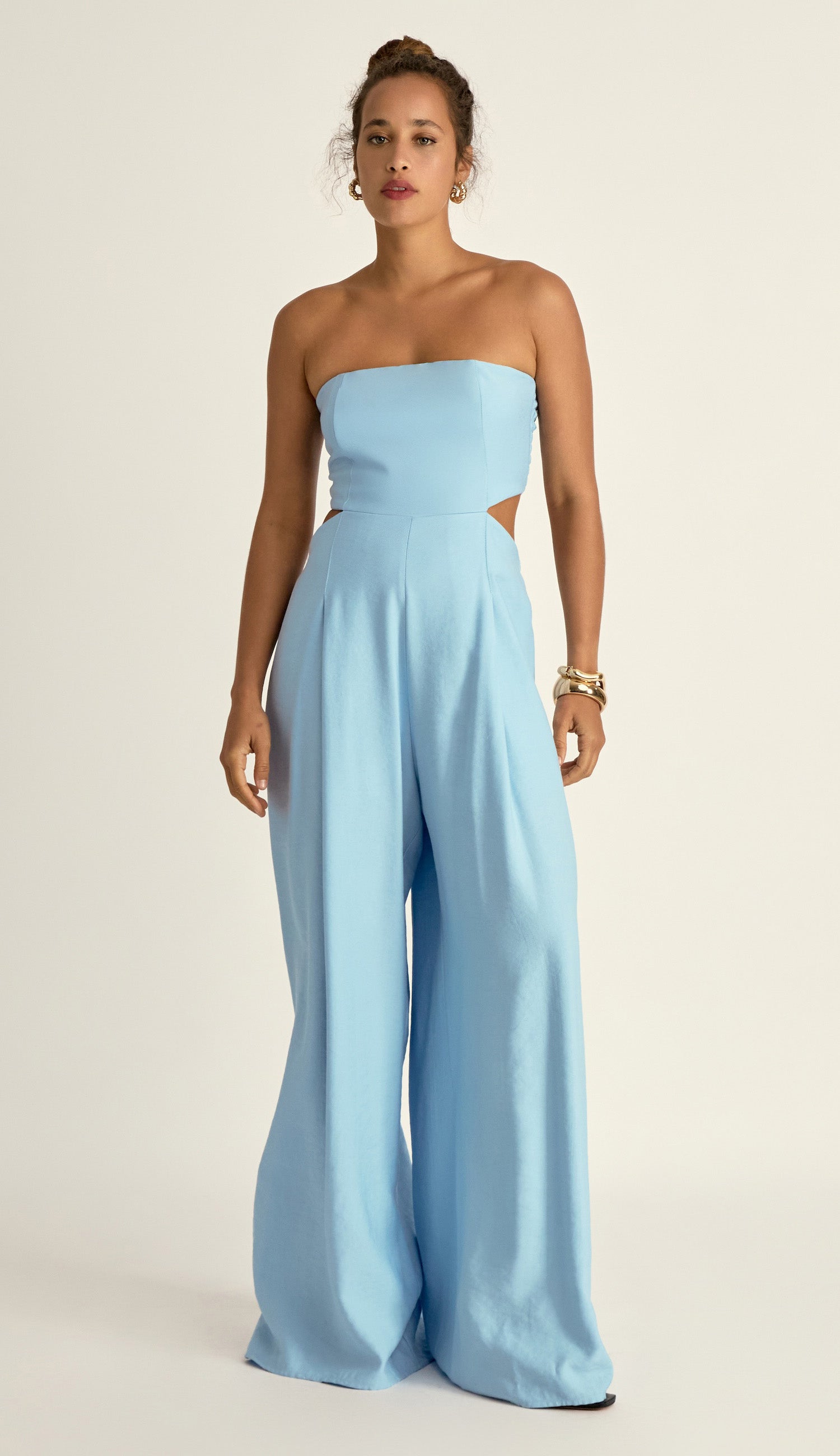 Macacão pantalona com forro e sem mangas, confeccionado em sarja de alfaiataria em viscose mais encorpada. Possui decote reto com silicone elástico interno para maior segurança; busto fixo à calça apenas por recorte frontal, deixando toda a cintura à mostra; lastex franzido nas costas do busto, para maior conforto; pregas e bolsos frontais; elástico nas costas da calça e fechamento traseiro por zíper de metal com pingente que possui o delicado detalhe da conchinha da Laguna gravado, o que dá um charme todo especial à peça.