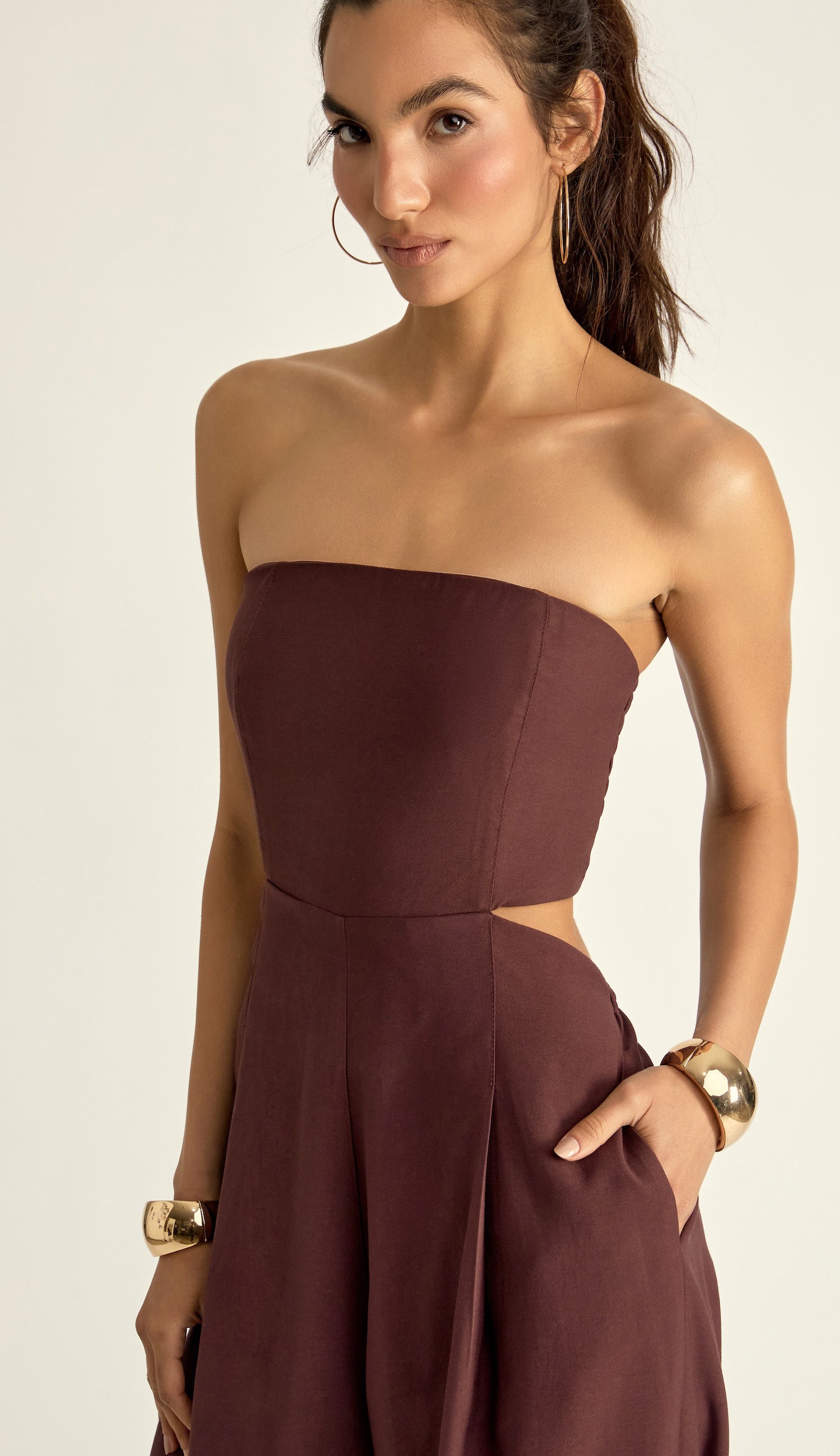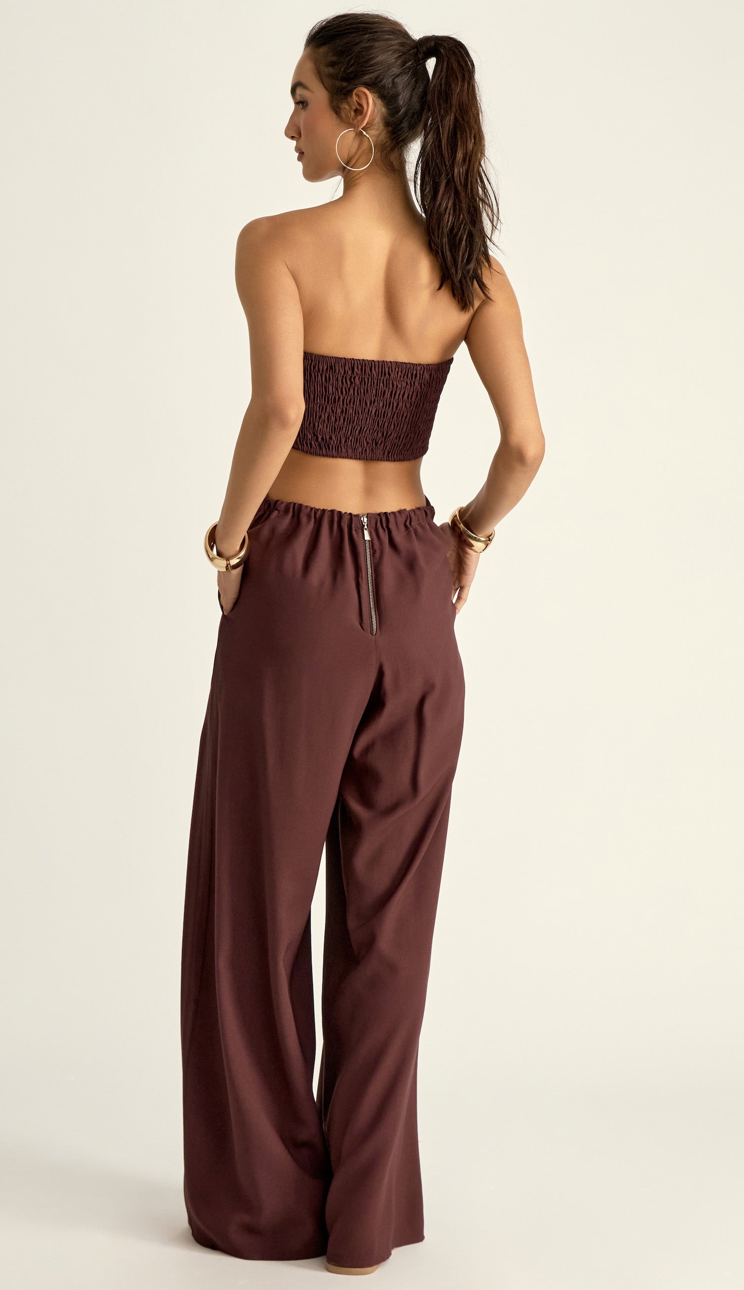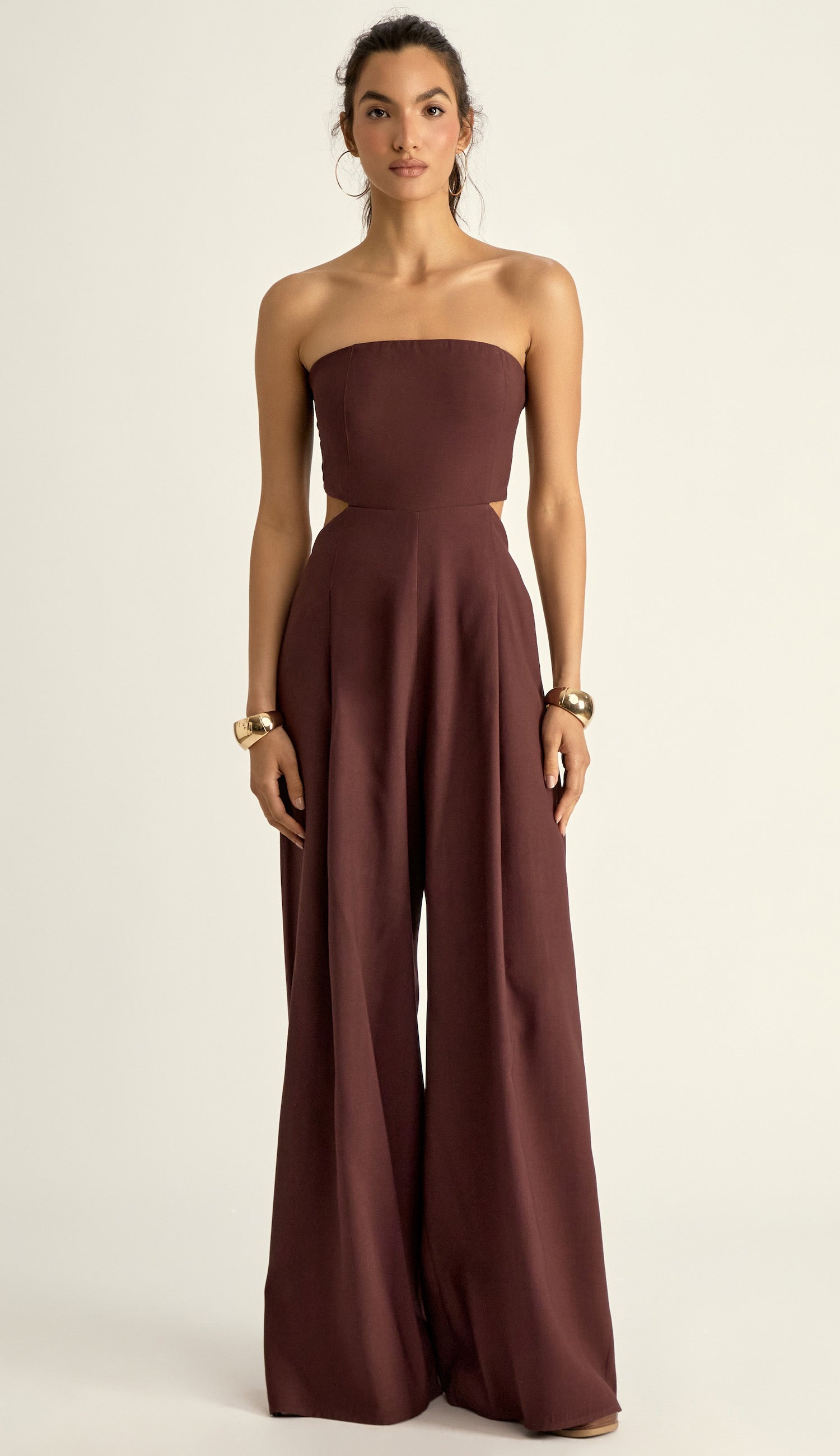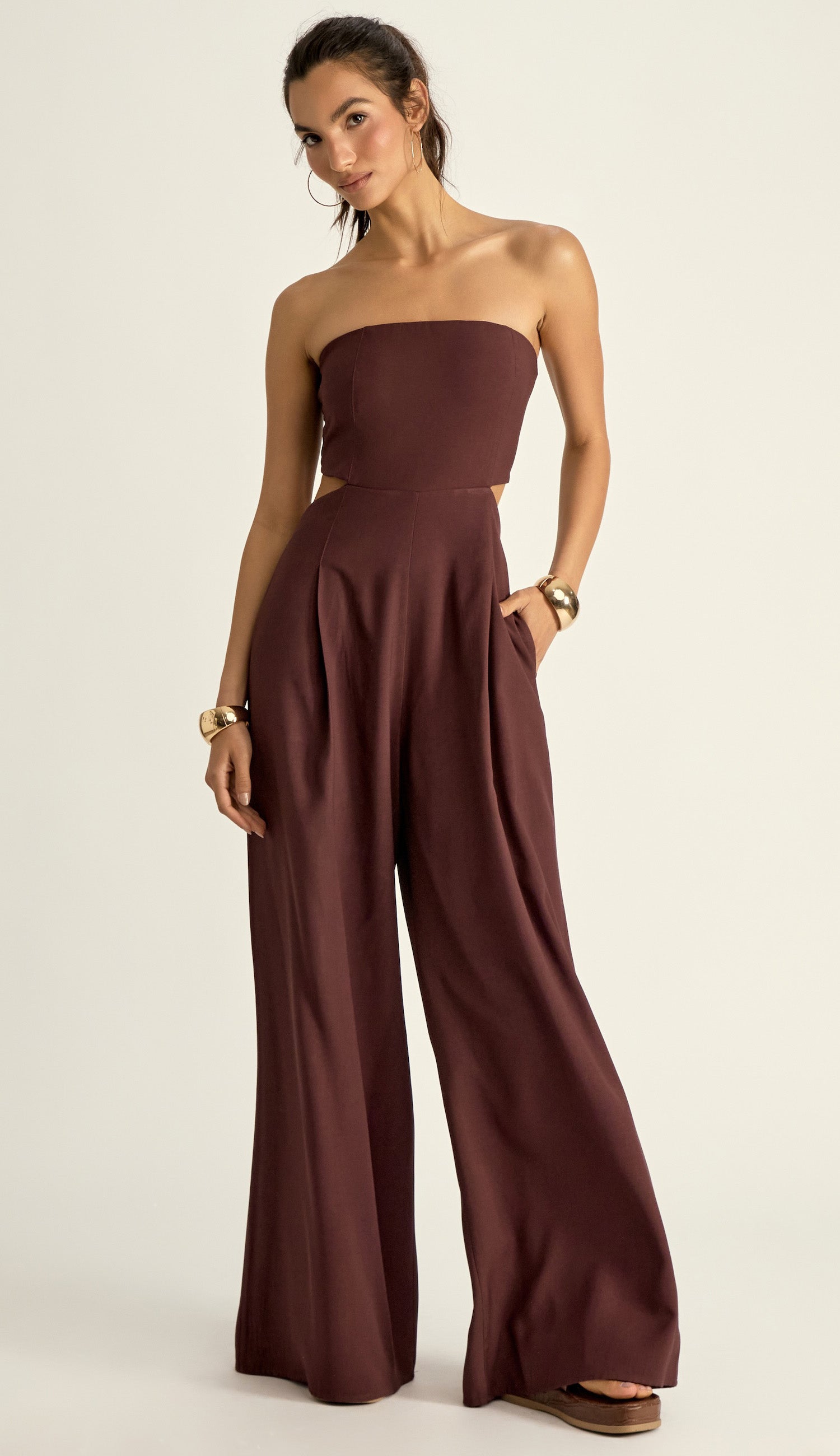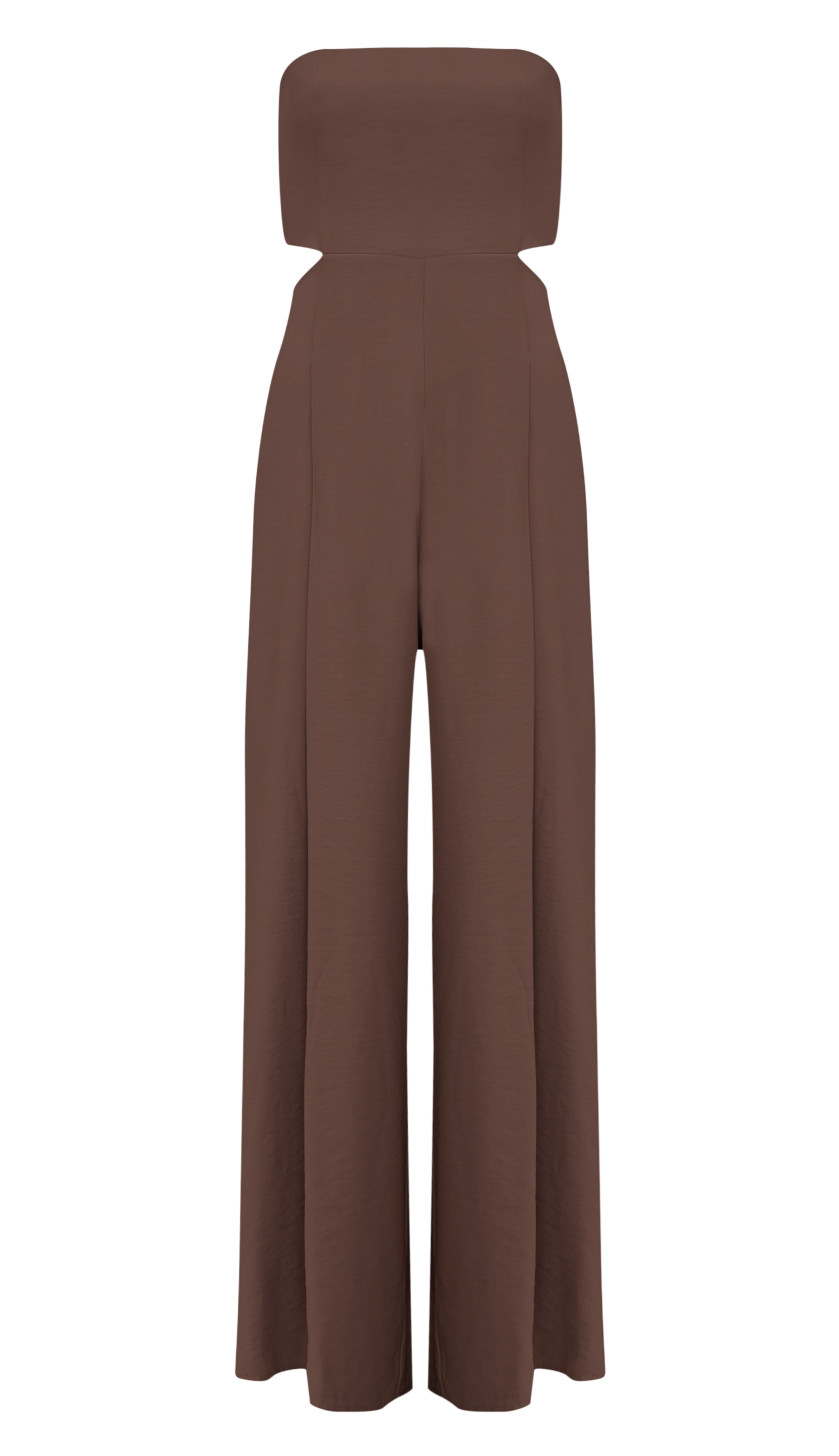 Macacão pantalona com forro e sem mangas, confeccionado em sarja de alfaiataria em viscose mais encorpada. Possui decote reto com silicone elástico interno para maior segurança; busto fixo à calça apenas por recorte frontal, deixando toda a cintura à mostra; lastex franzido nas costas do busto, para maior conforto; pregas e bolsos frontais; elástico nas costas da calça e fechamento traseiro por zíper de metal com pingente que possui o delicado detalhe da conchinha da Laguna gravado, o que dá um charme todo especial à peça.