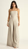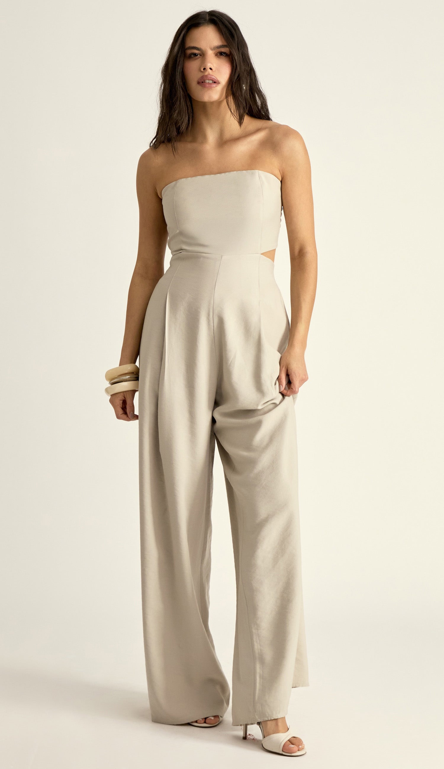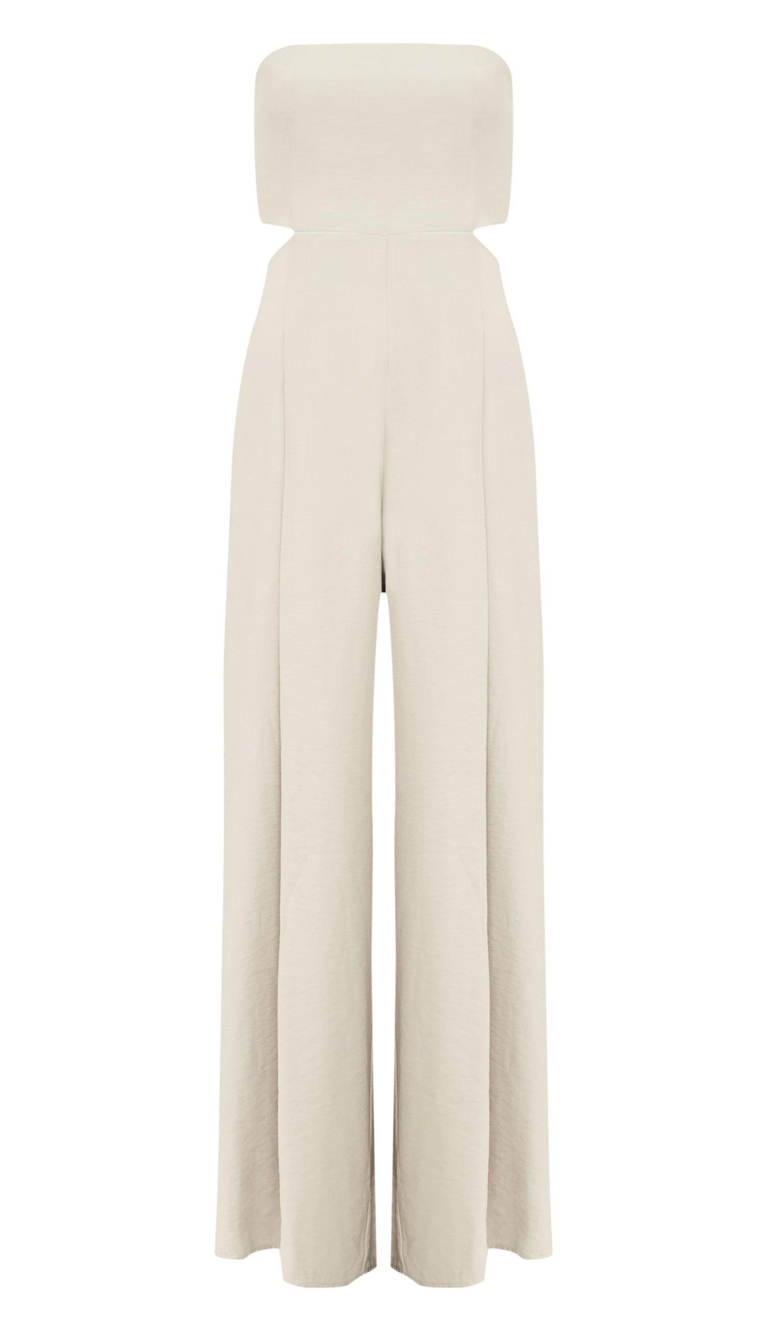 Macacão pantalona com forro e sem mangas, confeccionado em sarja de alfaiataria em viscose mais encorpada. Possui decote reto com silicone elástico interno para maior segurança; busto fixo à calça apenas por recorte frontal, deixando toda a cintura à mostra; lastex franzido nas costas do busto, para maior conforto; pregas e bolsos frontais; elástico nas costas da calça e fechamento traseiro por zíper de metal com pingente que possui o delicado detalhe da conchinha da Laguna gravado, o que dá um charme todo especial à peça.