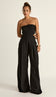 Macacão pantalona com forro e sem mangas, confeccionado em sarja de alfaiataria em viscose mais encorpada. Possui decote reto com silicone elástico interno para maior segurança; busto fixo à calça apenas por recorte frontal, deixando toda a cintura à mostra; lastex franzido nas costas do busto, para maior conforto; pregas e bolsos frontais; elástico nas costas da calça e fechamento traseiro por zíper de metal com pingente que possui o delicado detalhe da conchinha da Laguna gravado, o que dá um charme todo especial à peça.