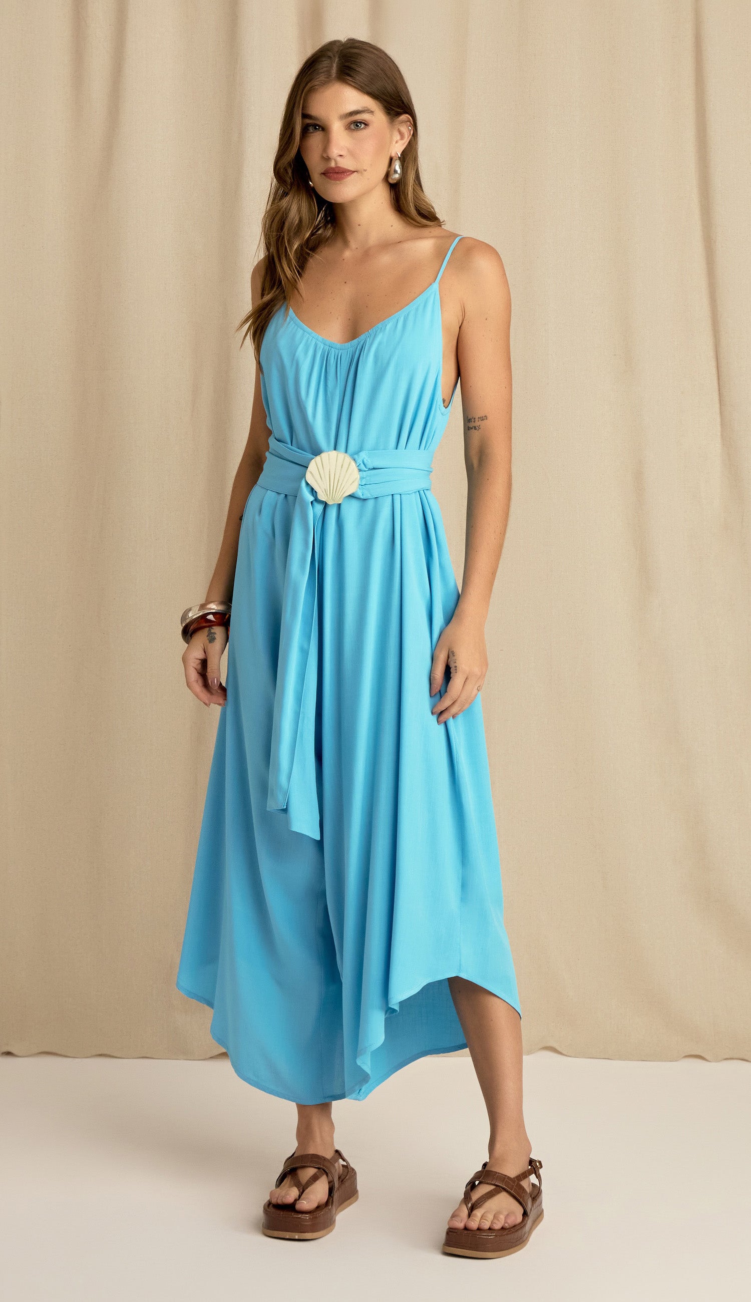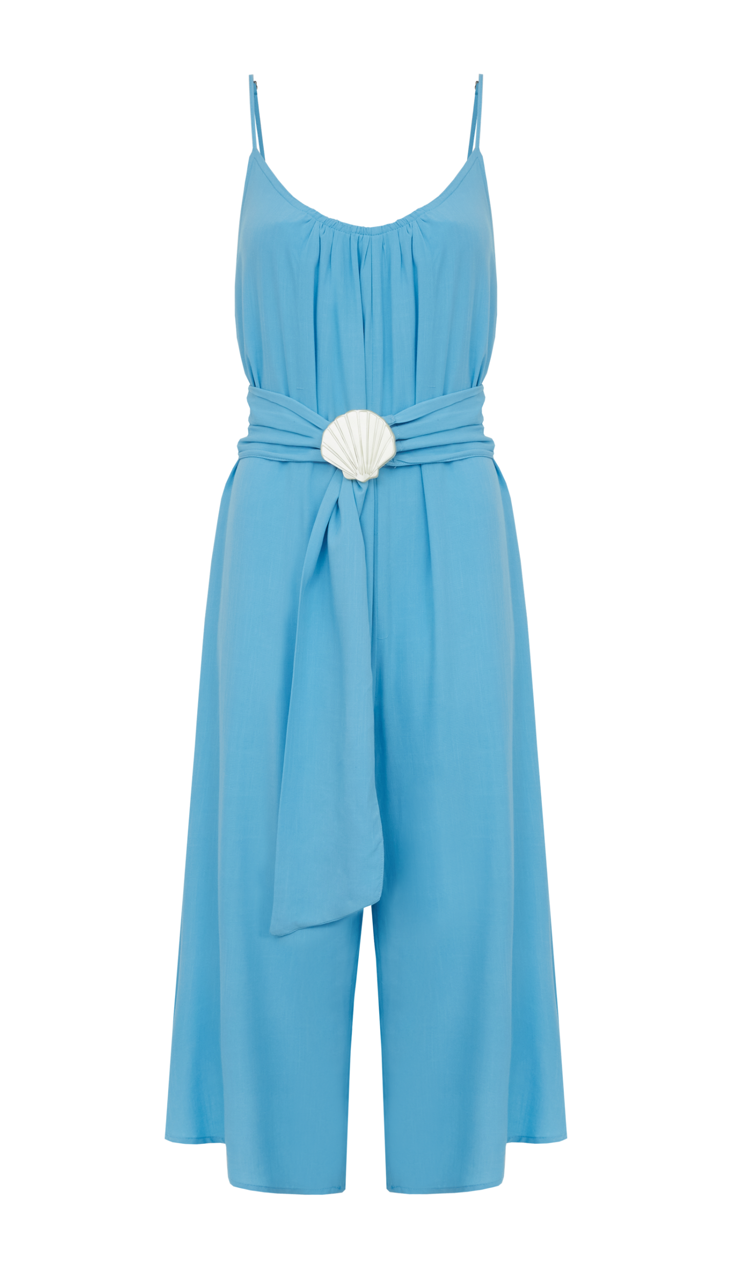 Macação pantacourt com forro, confeccionado em viscose com aspecto e toque de linho. Possui alças finas reguláveis, decote redondo frente e costas com detalhe franzido, modelagem ampla e faixa solta com fivela de acrílico em formato de concha para ajuste da cintura. Um look super versátil por ser peça única, prático e perfeito para ser usado de dia ou de noite.
