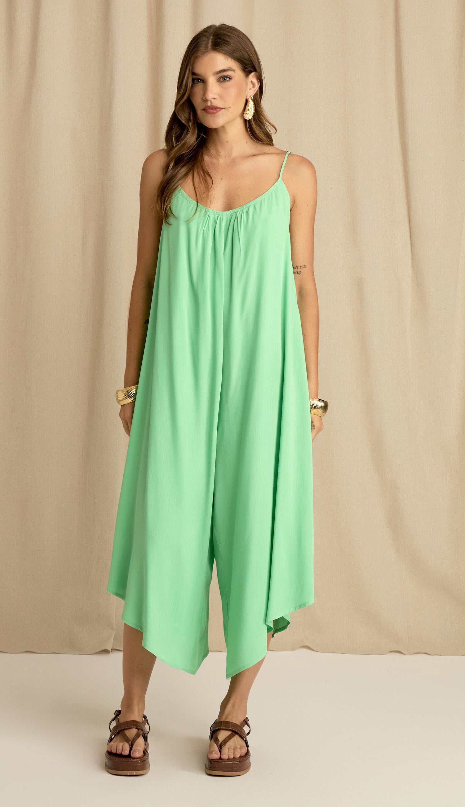 Macação pantacourt com forro, confeccionado em viscose com aspecto e toque de linho. Possui alças finas reguláveis, decote redondo frente e costas com detalhe franzido, modelagem ampla e faixa solta com fivela de acrílico em formato de concha para ajuste da cintura. Um look super versátil por ser peça única, prático e perfeito para ser usado de dia ou de noite.