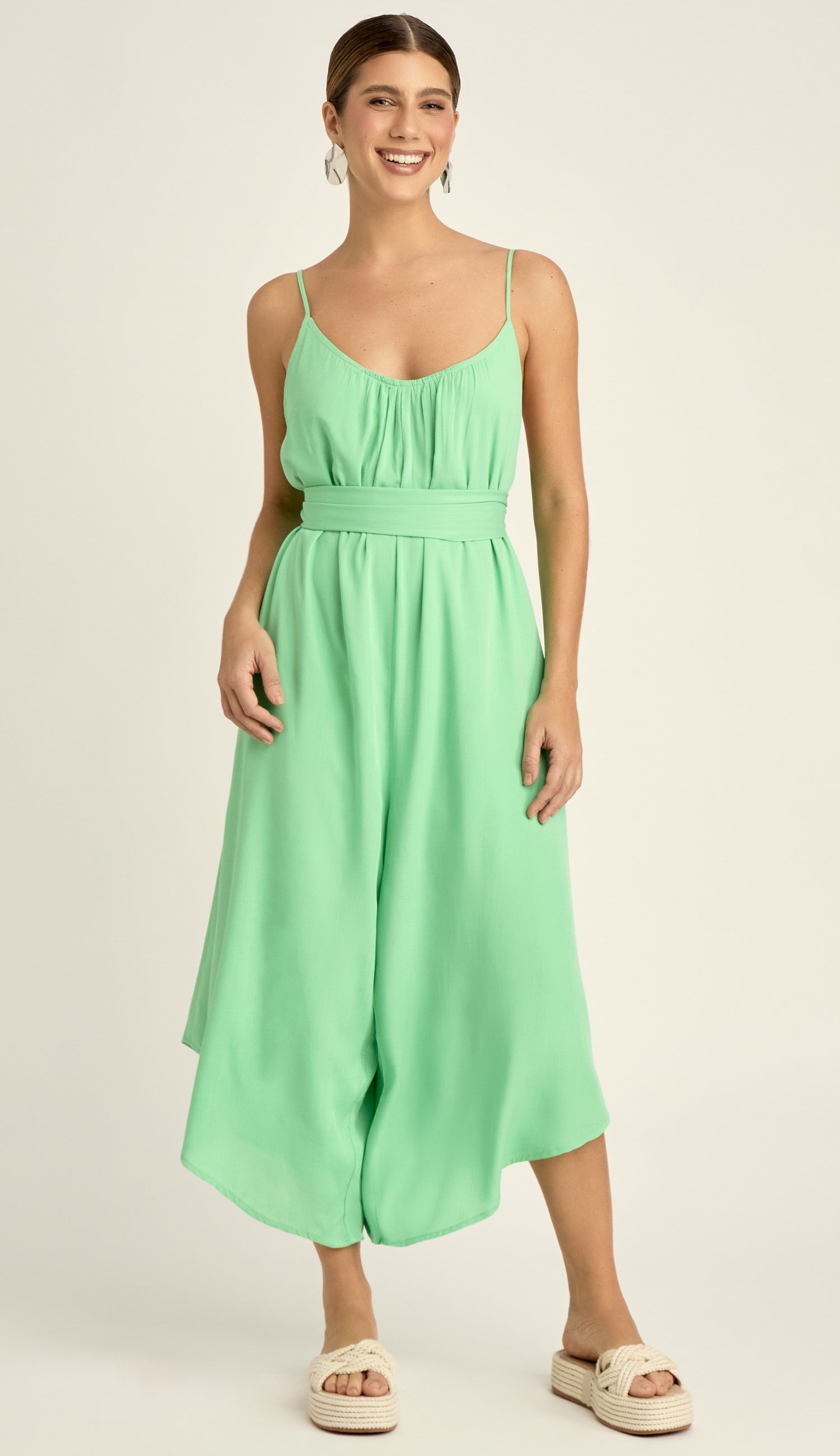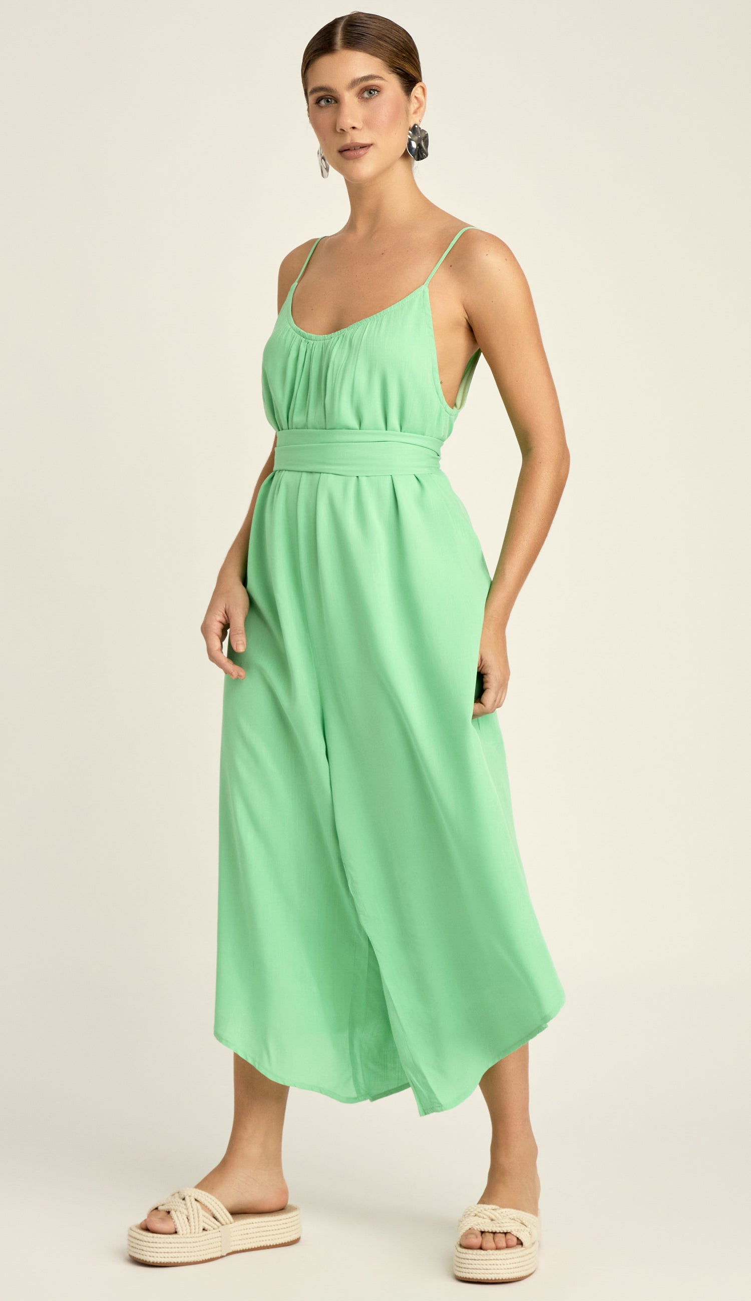 Macação pantacourt com forro, confeccionado em viscose com aspecto e toque de linho. Possui alças finas reguláveis, decote redondo frente e costas com detalhe franzido, modelagem ampla e faixa solta para ajuste da cintura. Um look super versátil por ser peça única, prático e perfeito para ser usado de dia ou de noite.