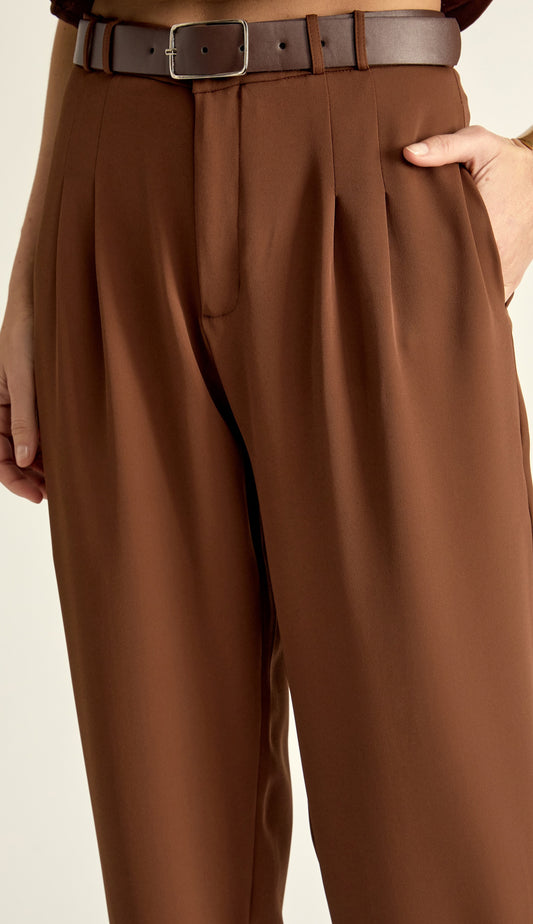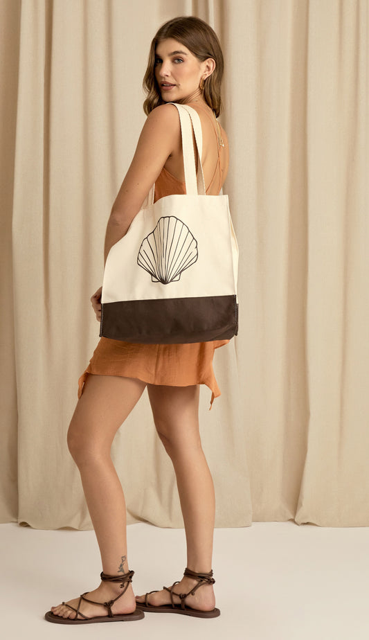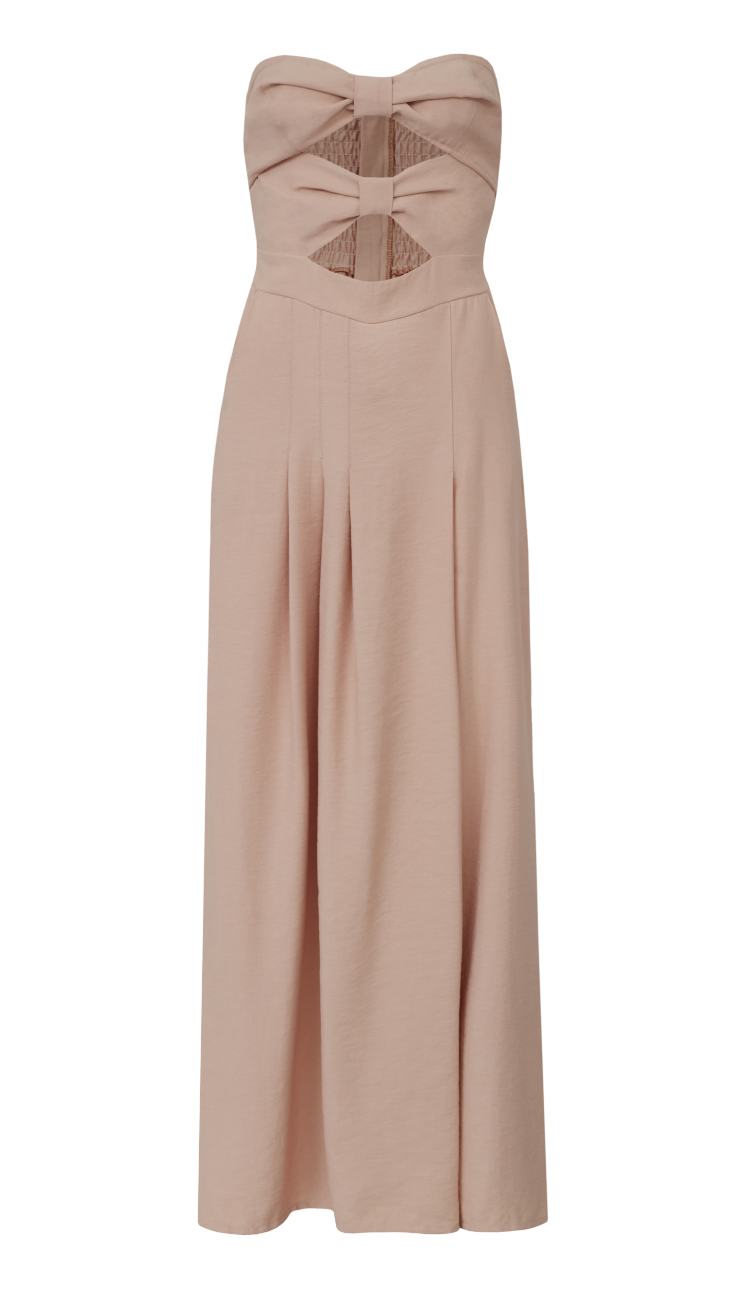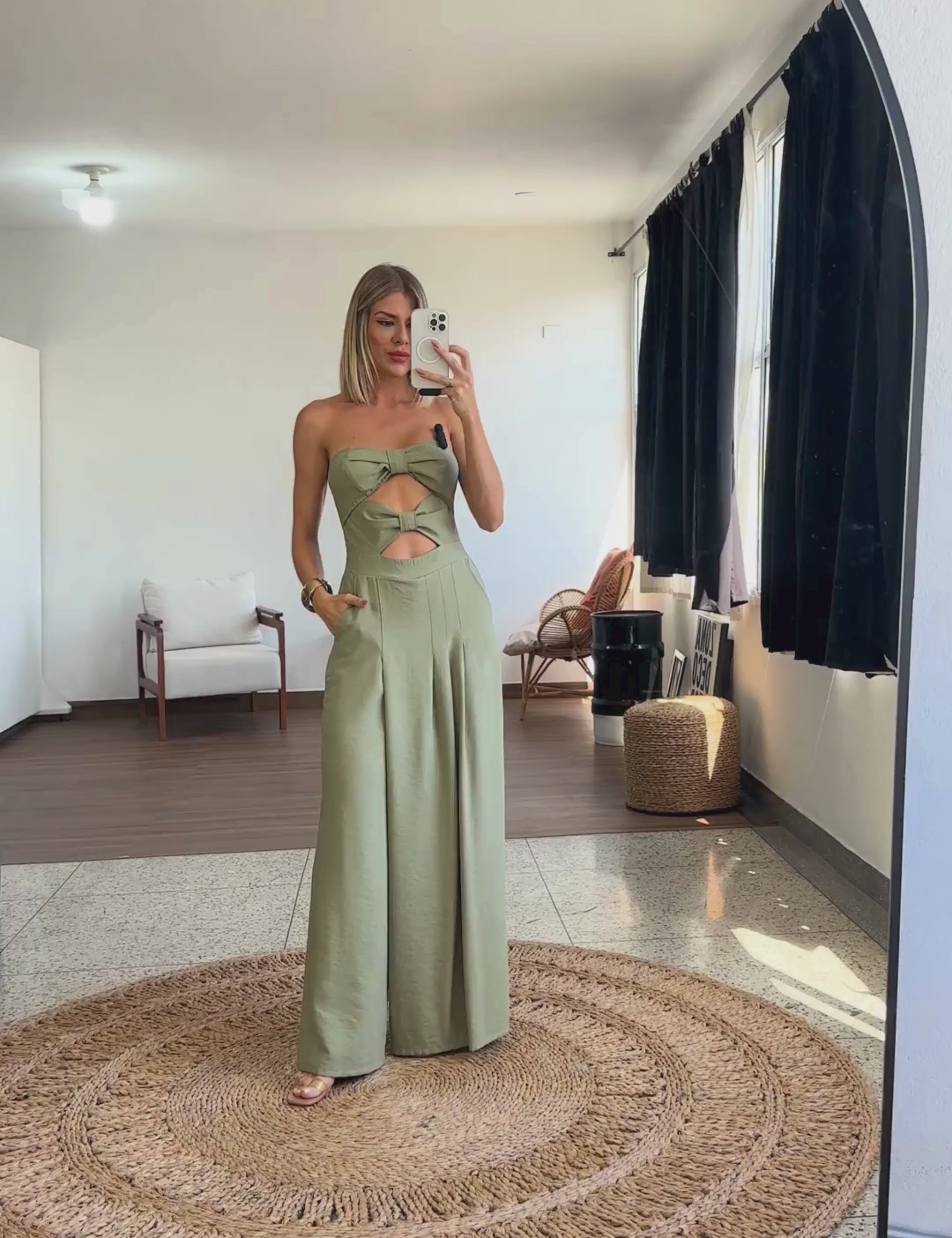 Macacão sem mangas confeccionado em sarja de alfaiataria em viscose mais encorpada. Possui decote coração com elástico; recortes vazados frontais, abaixo do busto e na cintura, com detalhe parecendo dois laços; pernas soltas estilo pantalona com pregas frontais com sobreposição de tecido partindo de uma delas; bolsos laterais; lastex franzido nas costas para melhor ajuste ao corpo e fechamento traseiro por zíper de metal com pingente que tem o detalhe da conchinha da Laguna gravada.