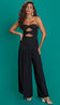 Macacão sem mangas confeccionado em sarja de alfaiataria em viscose mais encorpada. Possui decote coração com elástico; recortes vazados frontais, abaixo do busto e na cintura, com detalhe parecendo dois laços; pernas soltas estilo pantalona com pregas frontais com sobreposição de tecido partindo de uma delas; bolsos laterais; lastex franzido nas costas para melhor ajuste ao corpo e fechamento traseiro por zíper de metal com pingente que tem o detalhe da conchinha da Laguna gravada.