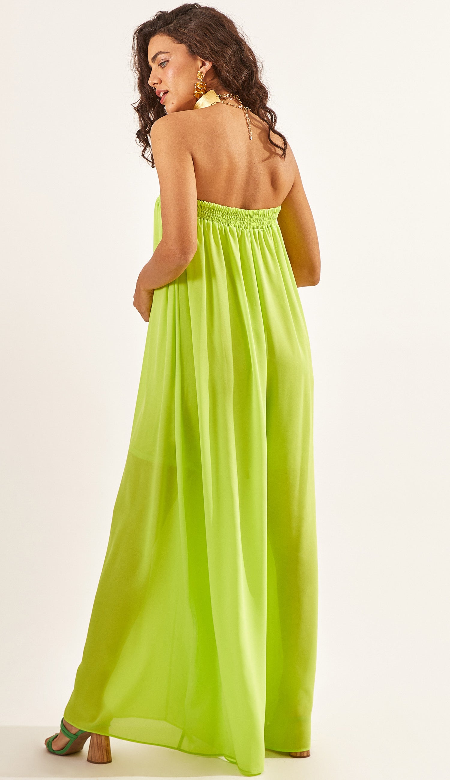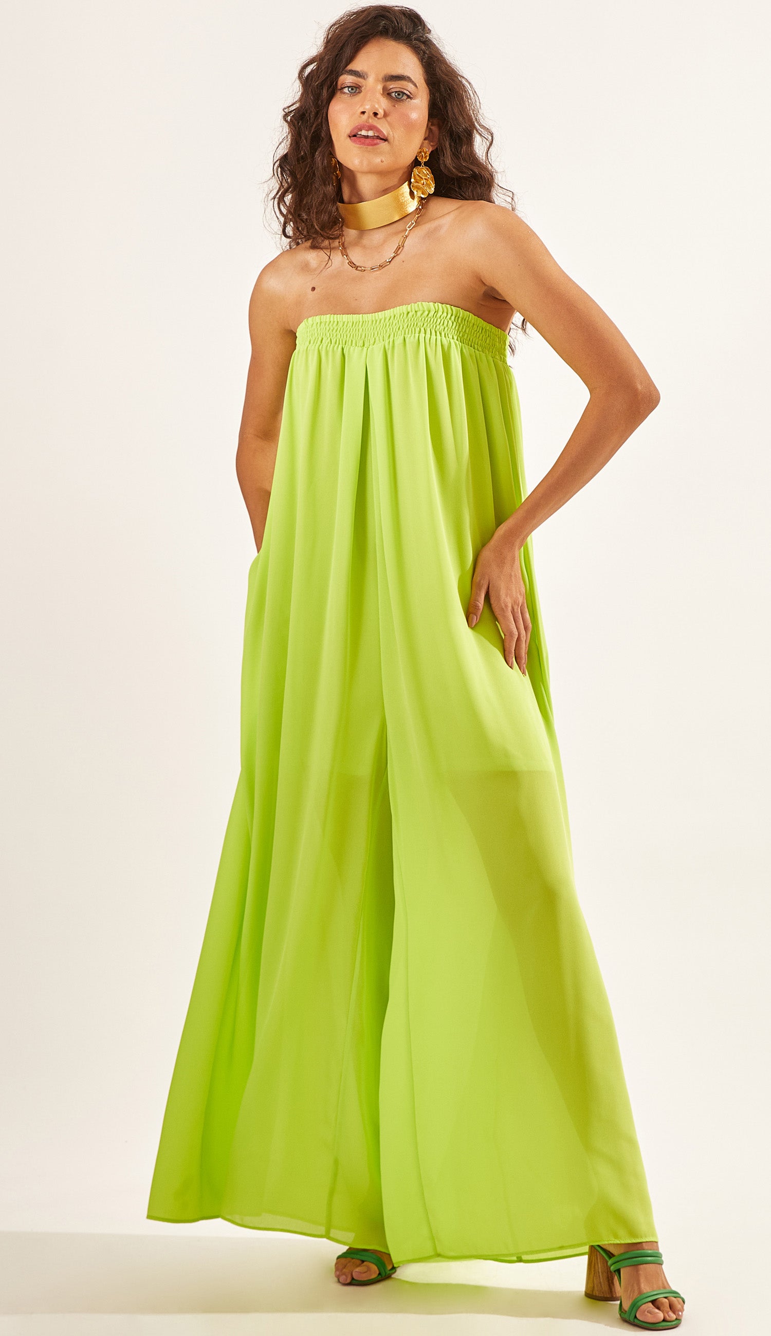 Macacão bem amplo confeccionado em crepe com forro. Não possui alças, apenas lastex franzido no decote com prega frontal. Uma peça bem confortável e elegante que pode ser usado solto ou ainda com cinto para ajustar a silhueta. Os maxi acessórios compõe muito bem esse look.