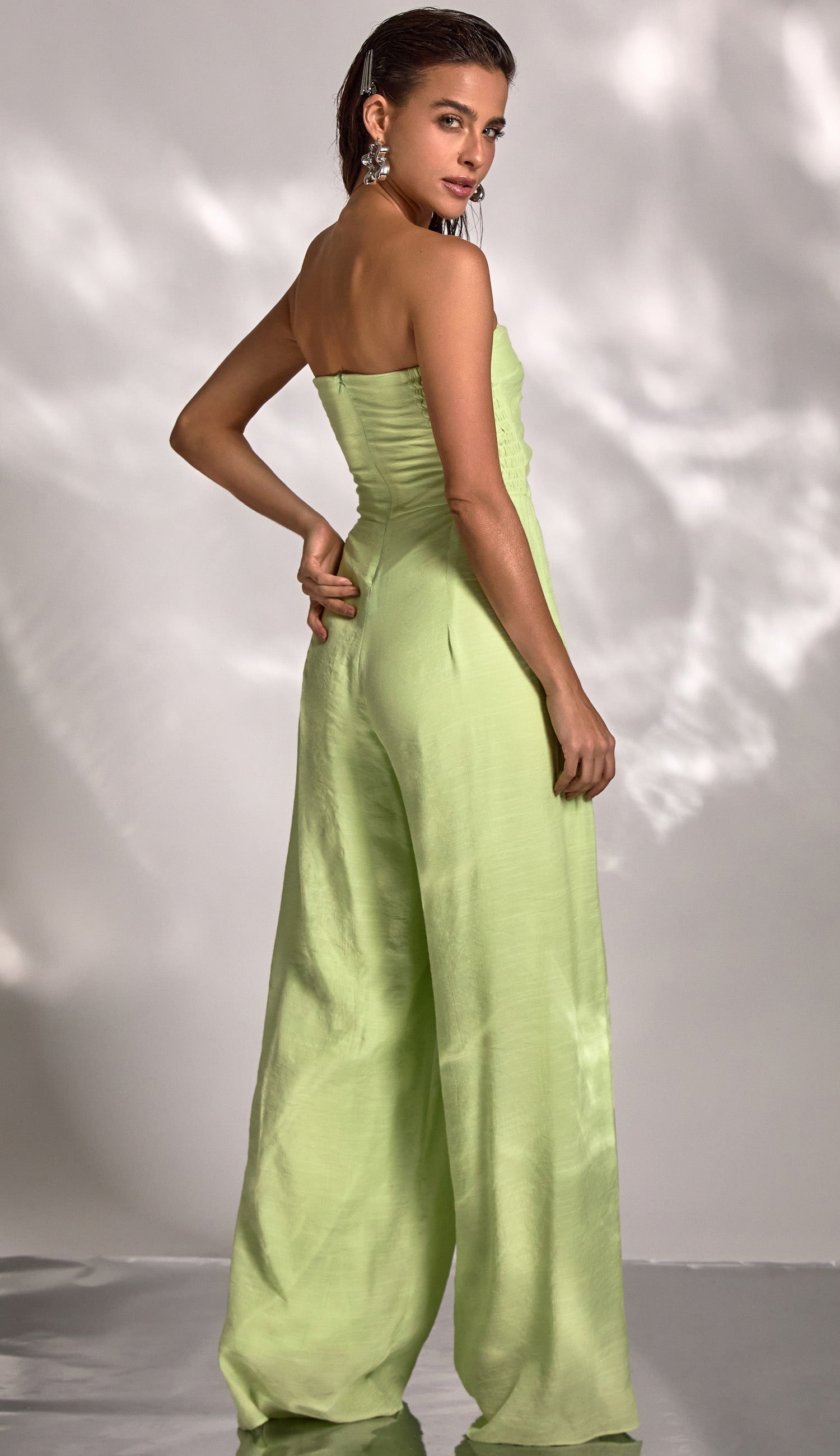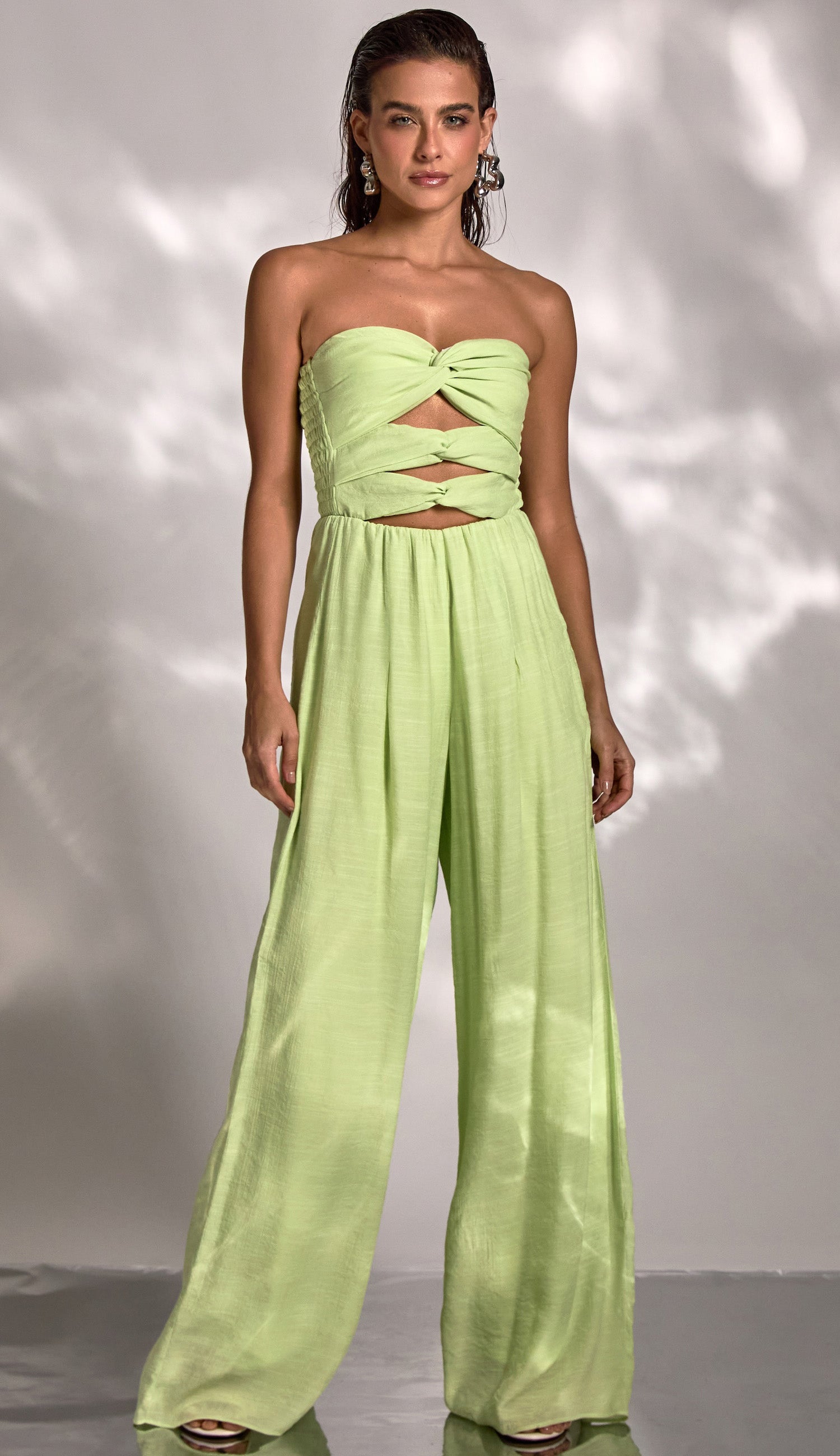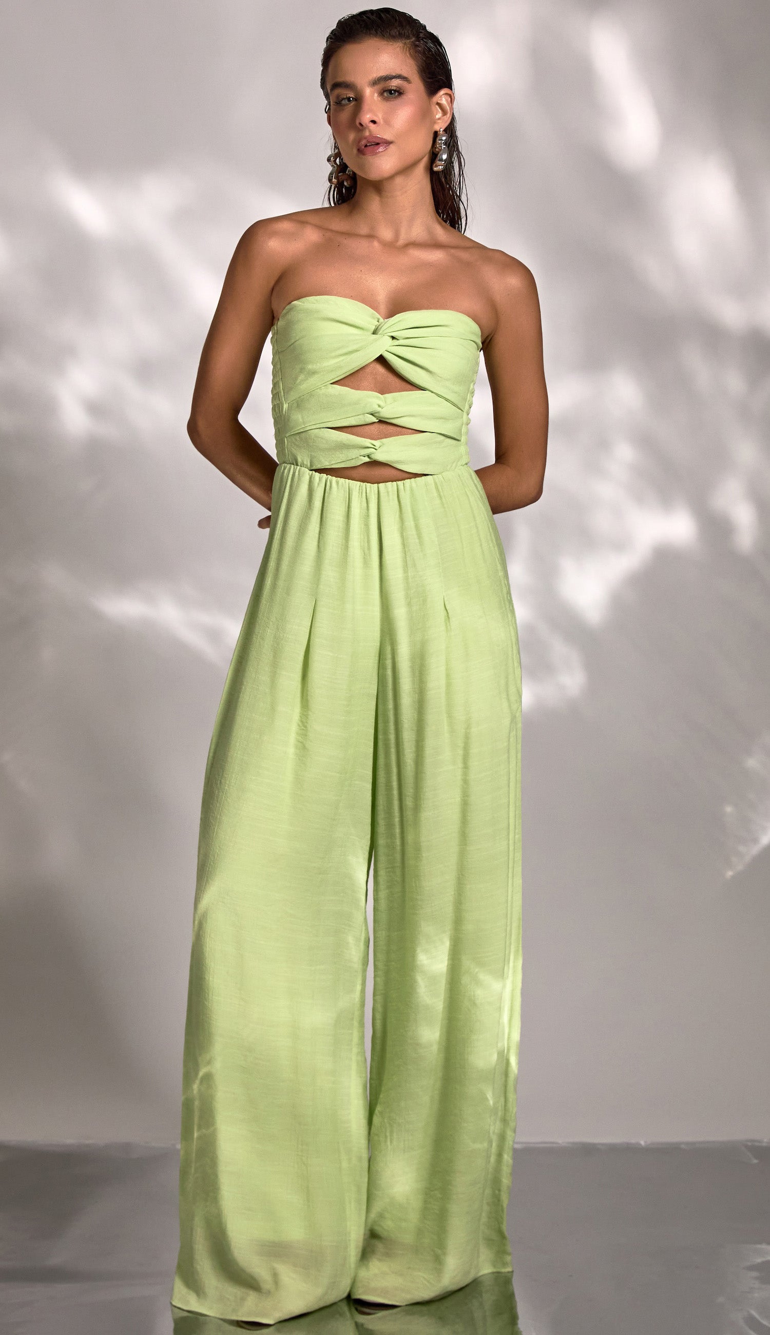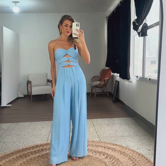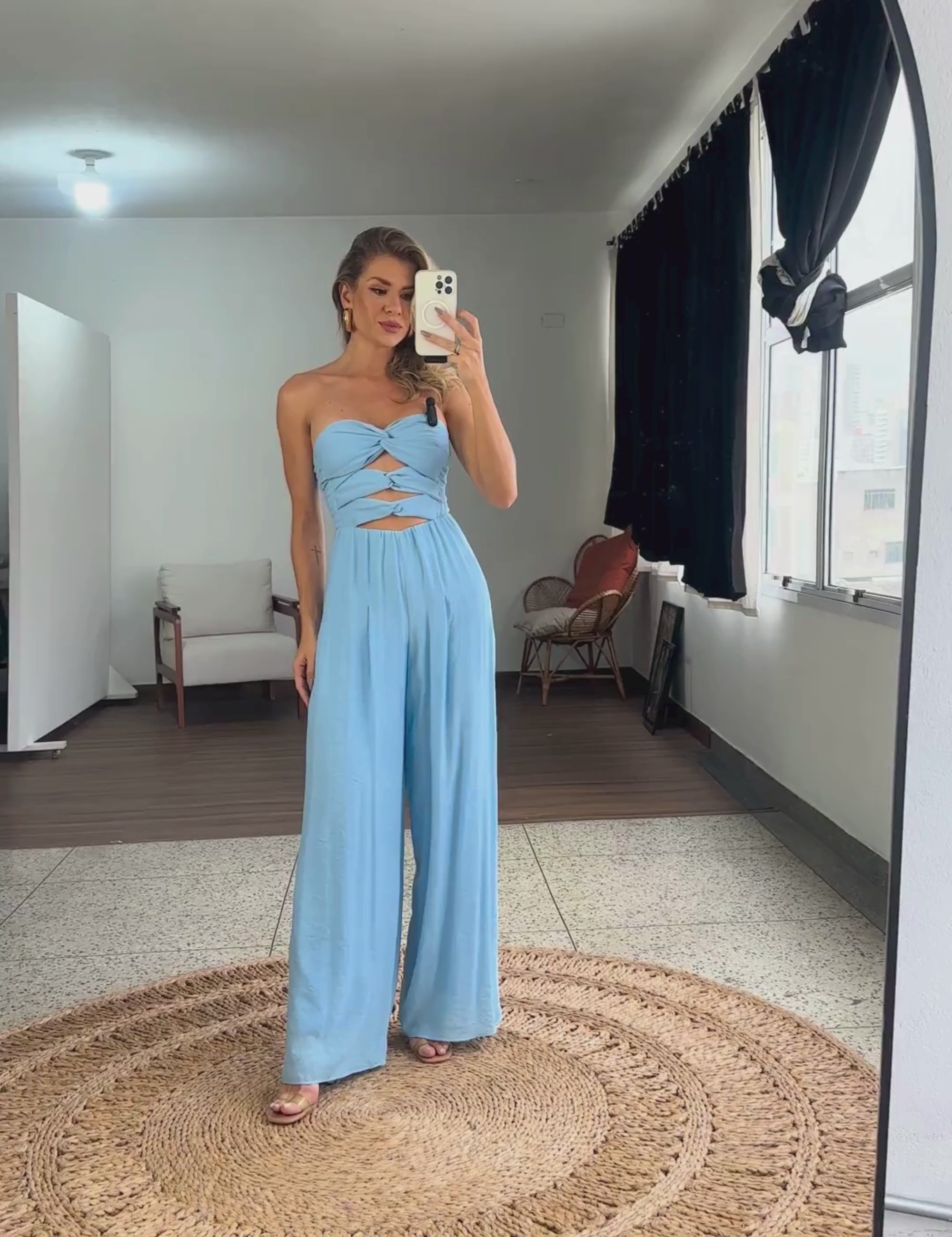 Macacão sem mangas confeccionado em poliviscose texturizado com aspecto de linho e efeito amassadinho. Possui forro longo na calça; tecido duplo no busto para não ficar transparente; decote coração com nó no centro e silicone interno para maior segurança; recortes vazados frontais, abaixo do busto e na cintura, com detalhe parecendo dois laços; pernas soltinhas; lastex franzido nas laterais para maior conforto; pregas frontais e fechamento traseiro por zíper invisível.