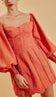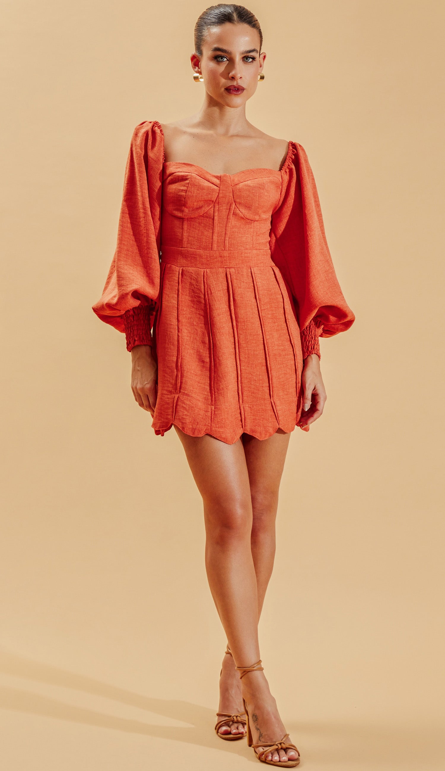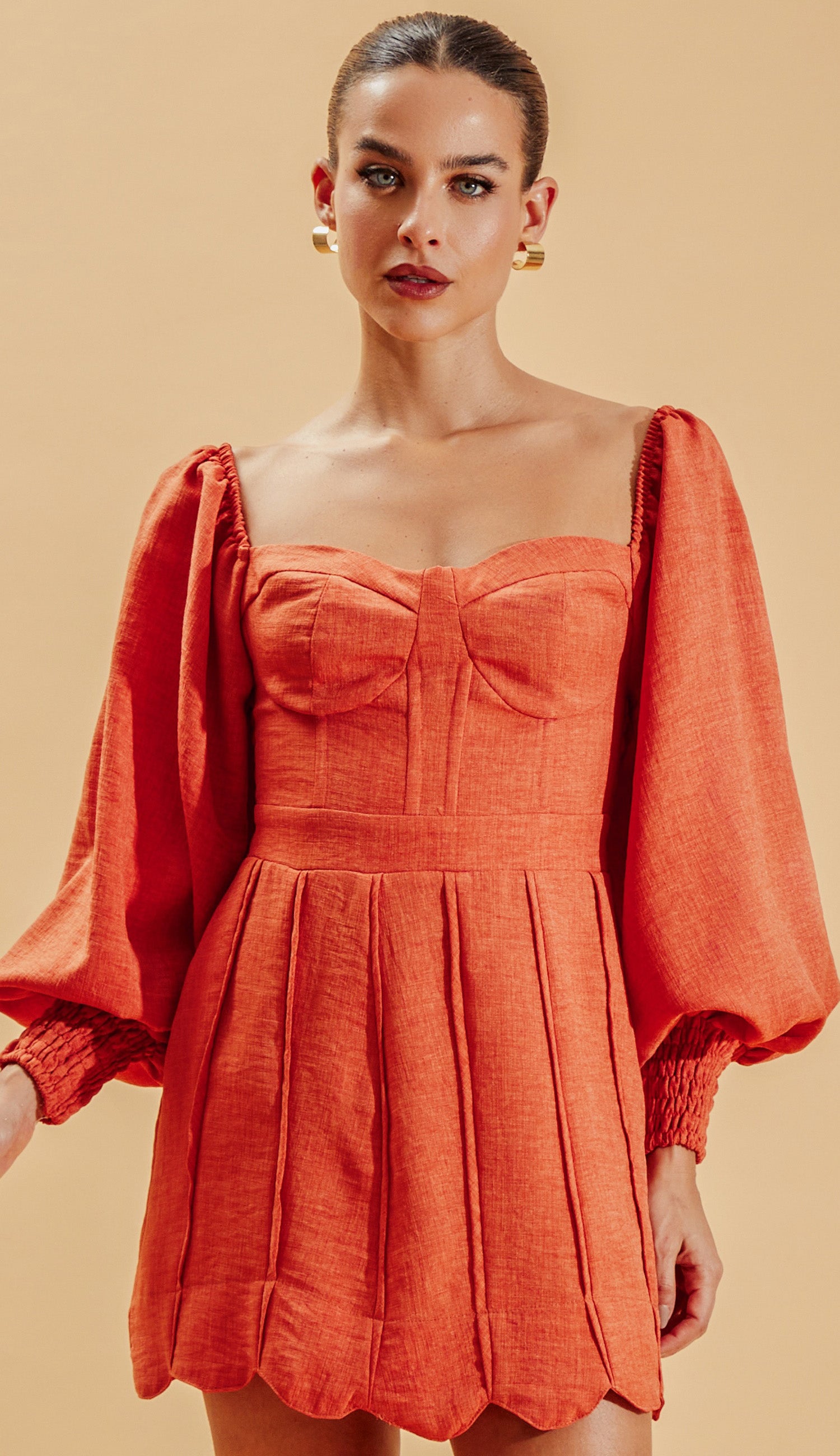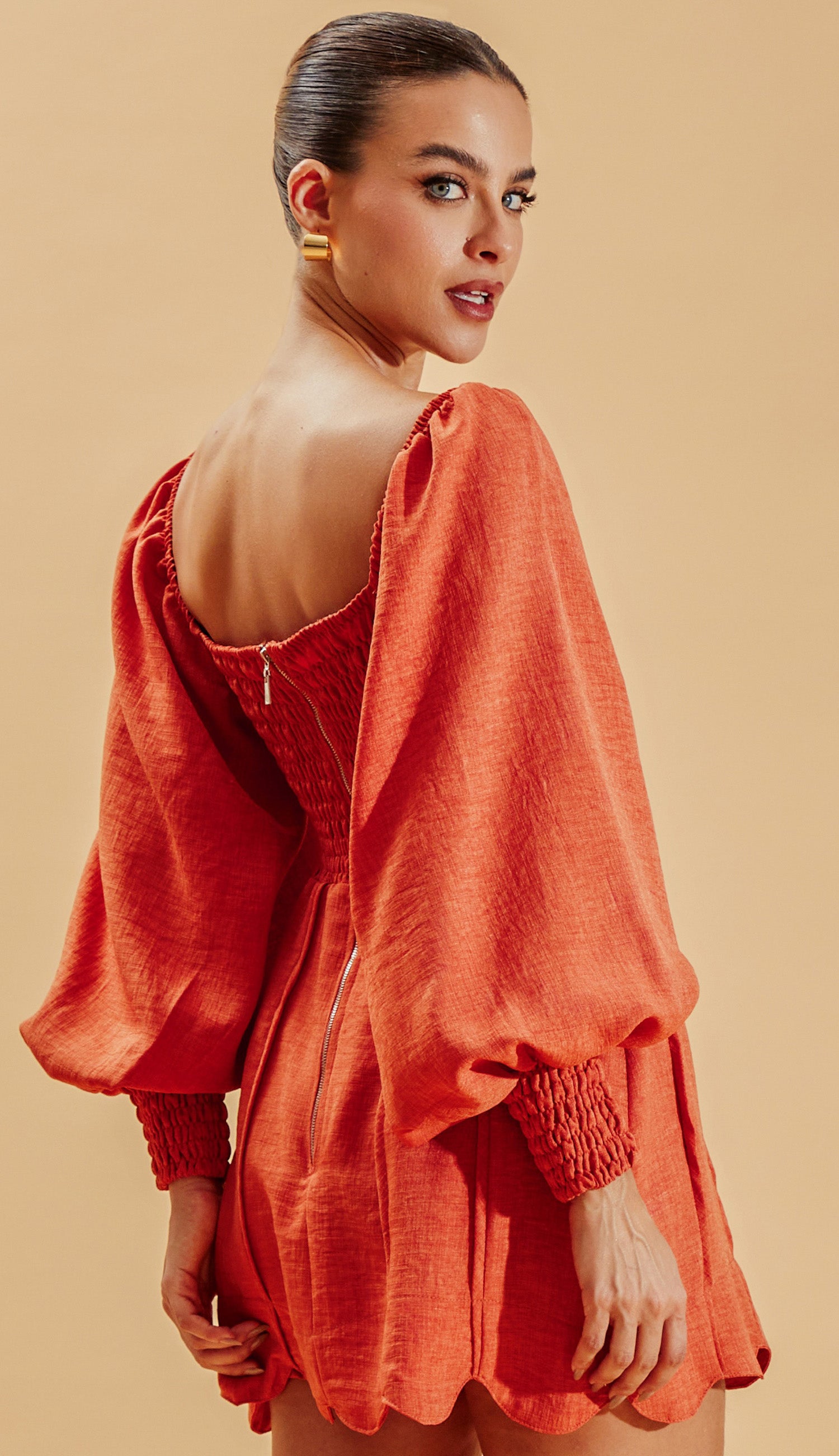 Macaquinho com forro, confeccionado em poliéster com aspecto de linho texturizado. Possui saia sobreposta ao forro de shorts, decote coração, mangas longas bufantes com elástico no ombro, podendo ser usado no estilo "ciganinha" ou "princesa", conta com recortes que modelam o busto, pala na cintura com barbatanas para estruturar a peça, punho das mangas em lastex, nesgas na saia com detalhe em vivo e barra com recortes arredondados, lastex franzido nas costas e fechamento traseiro por zíper de metal.