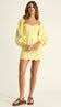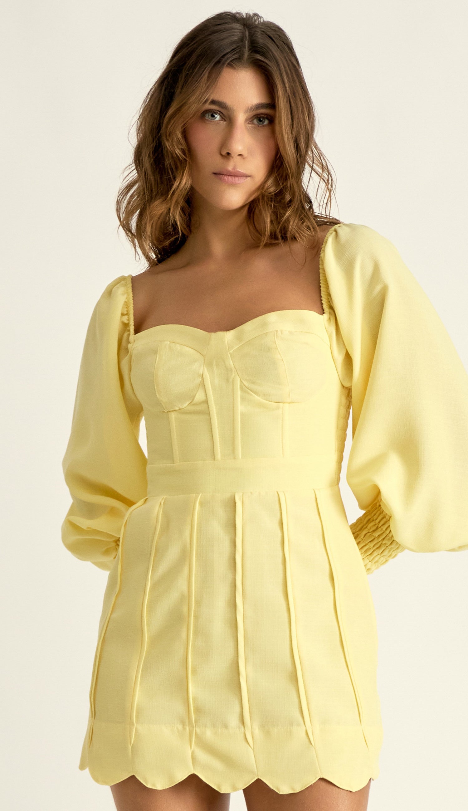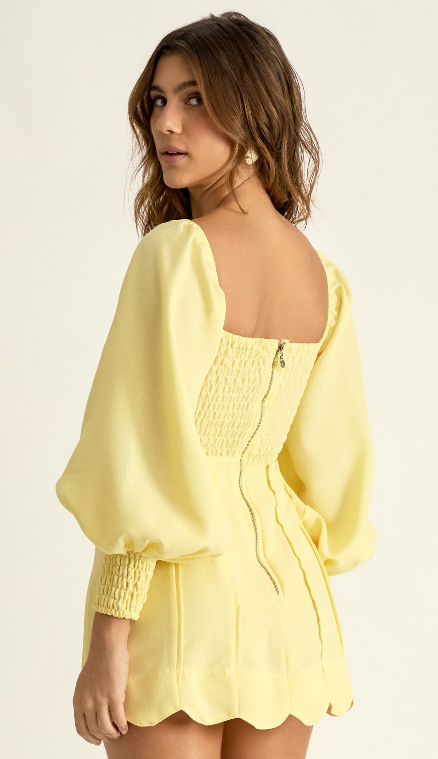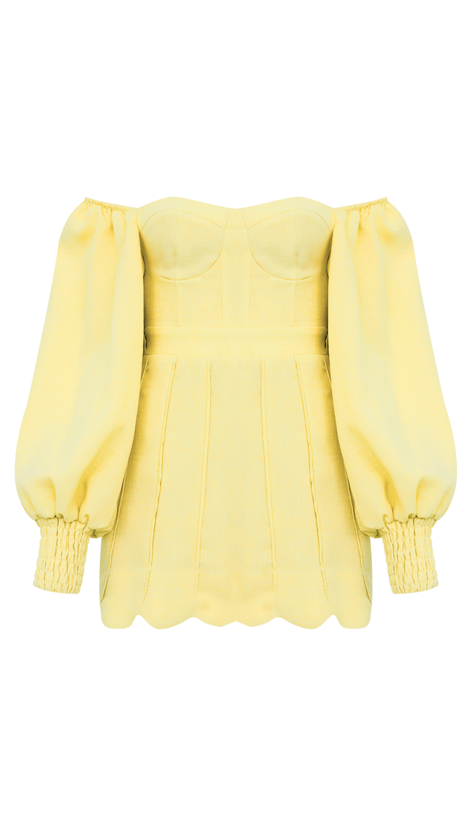 Macaquinho com forro, confeccionado em poliéster com aspecto de linho texturizado mais encorpadinho. Possui saia sobreposta ao forro de shorts, decote coração, mangas longas bufantes com elástico no ombro, podendo ser usado no estilo "ciganinha" ou "princesa", conta com recortes que modelam o busto, pala na cintura com barbatanas para estruturar a peça, punho das mangas em lastex, nesgas na saia com detalhe em vivo e barra com recortes arredondados, lastex franzido nas costas e fechamento traseiro por zíper de metal com pingente em formato de conchinha.