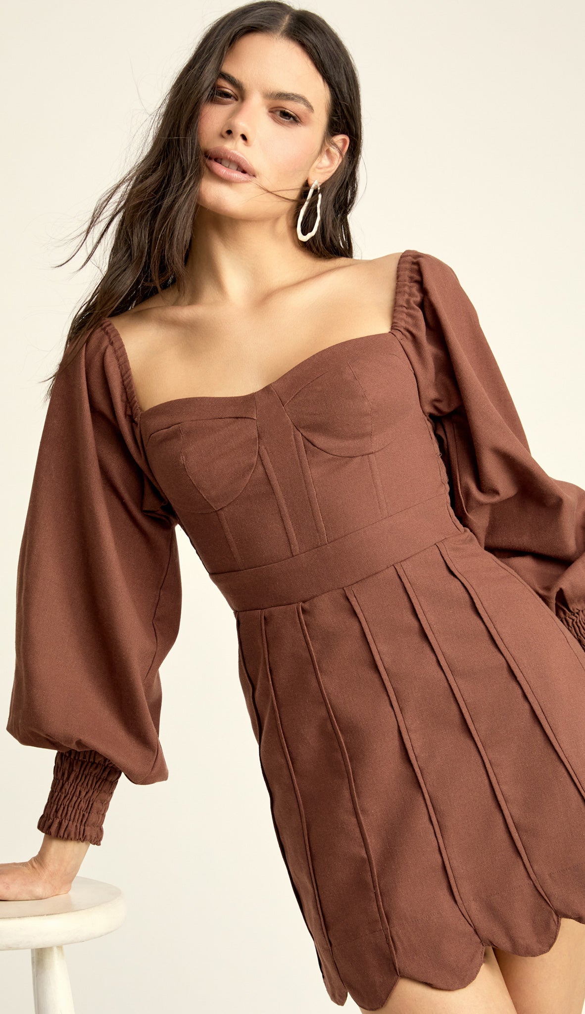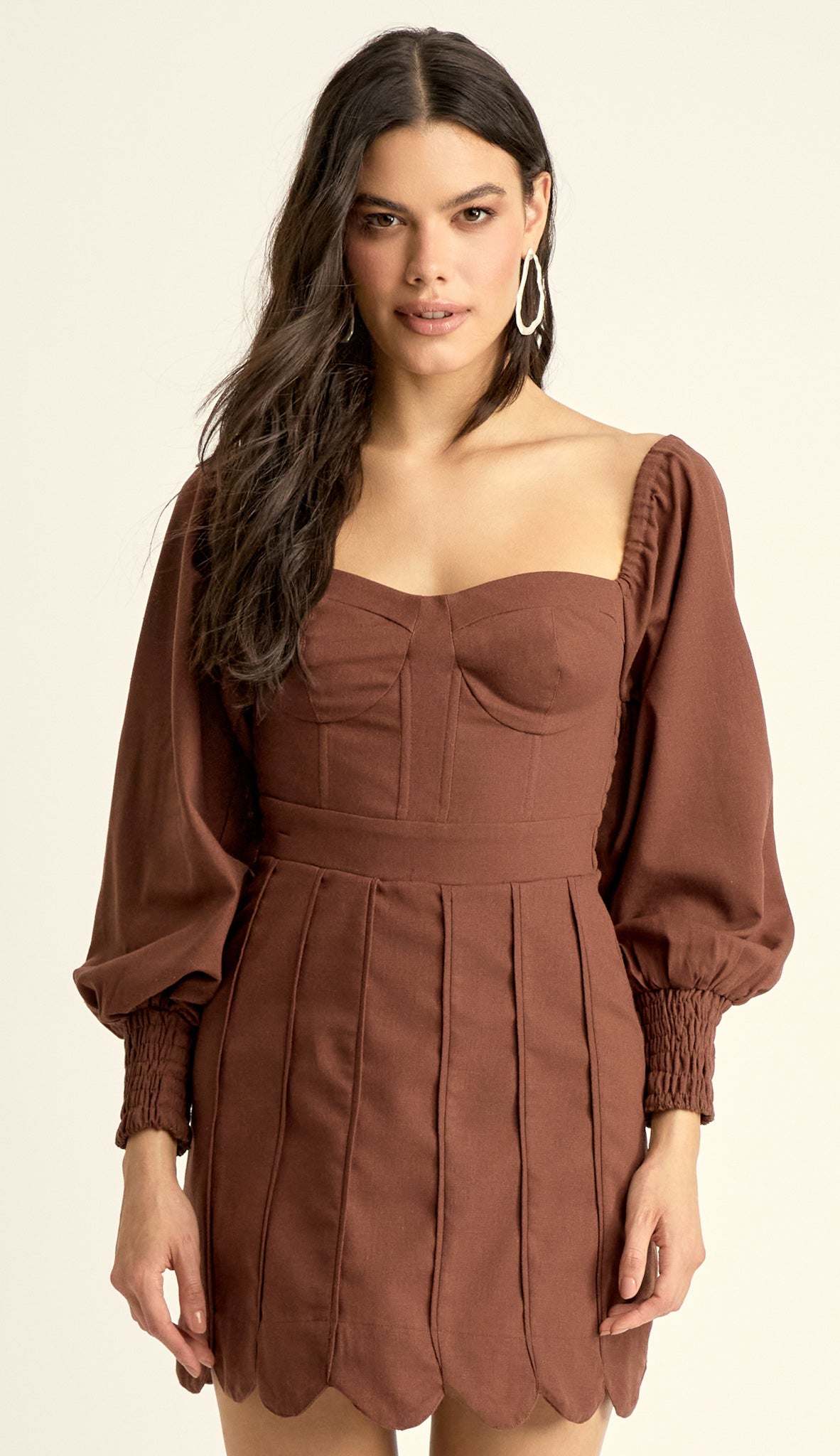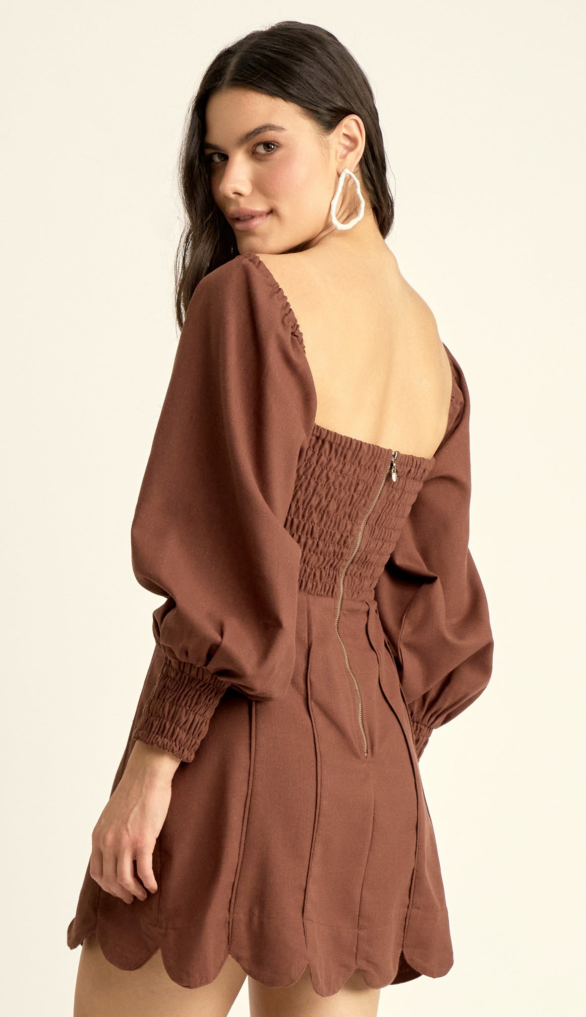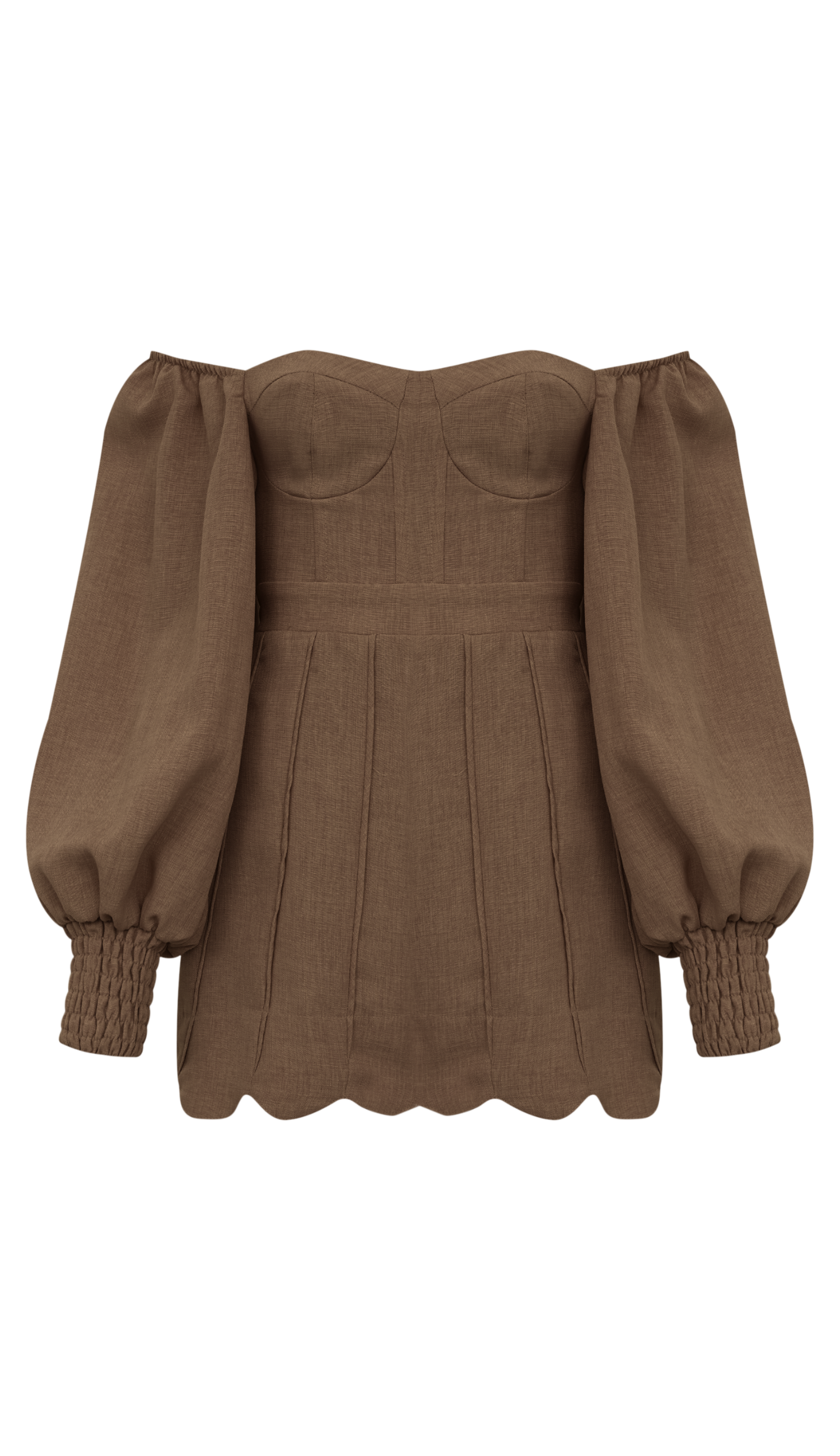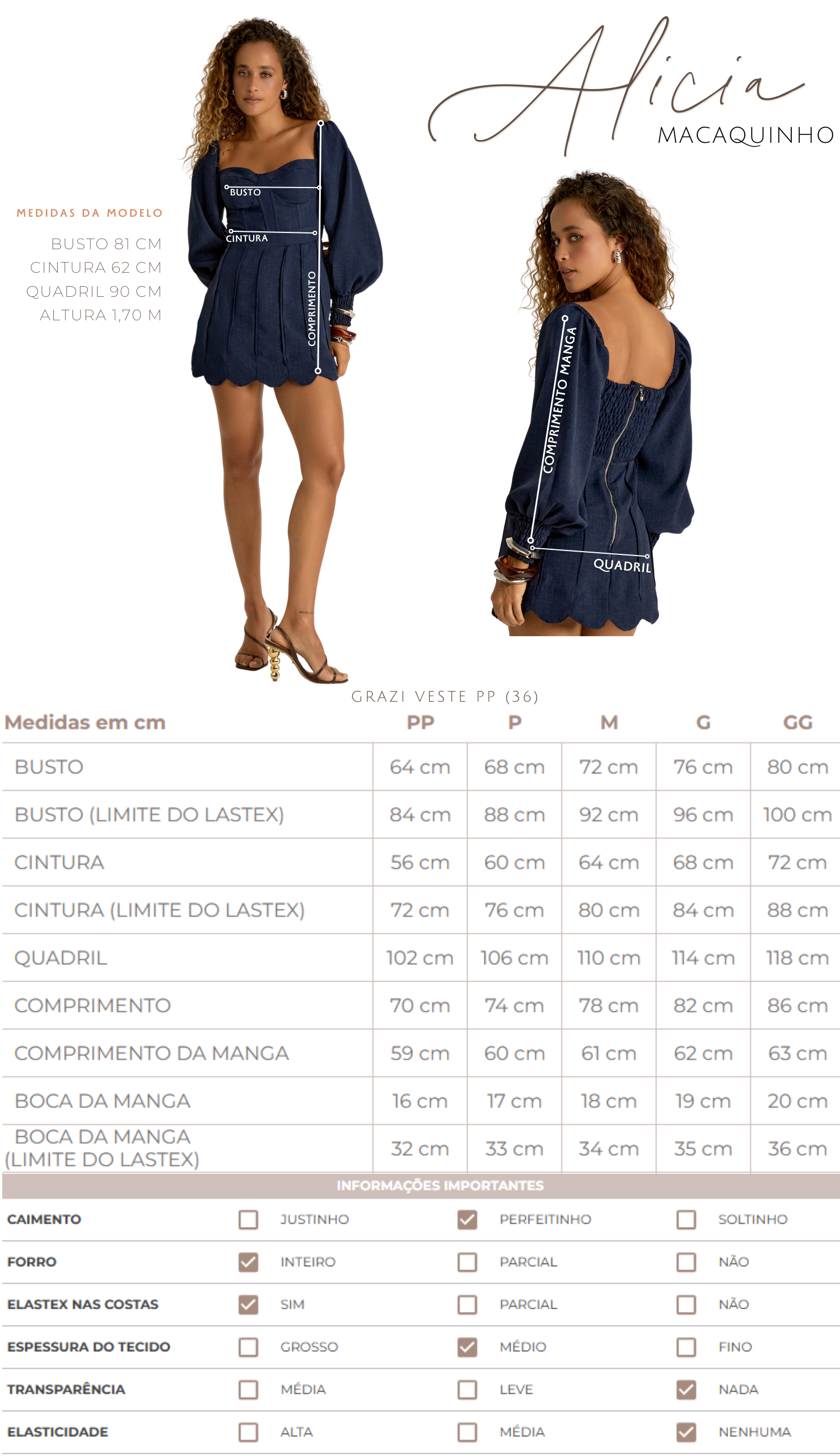 Macaquinho confeccionado em linho com forro. Possui saia sobreposta ao forro de shorts, decote coração, mangas longas bufantes com elástico no ombro, podendo ser usado no estilo "ciganinha" ou "princesa", conta com recortes que modelam o busto, pala na cintura com barbatanas para estruturar a peça, punho das mangas em lastex, nesgas na saia com detalhe em vivo e barra com recortes arredondados, lastex franzido nas costas e fechamento traseiro por zíper de metal com pingente em formato de conchinha.