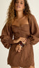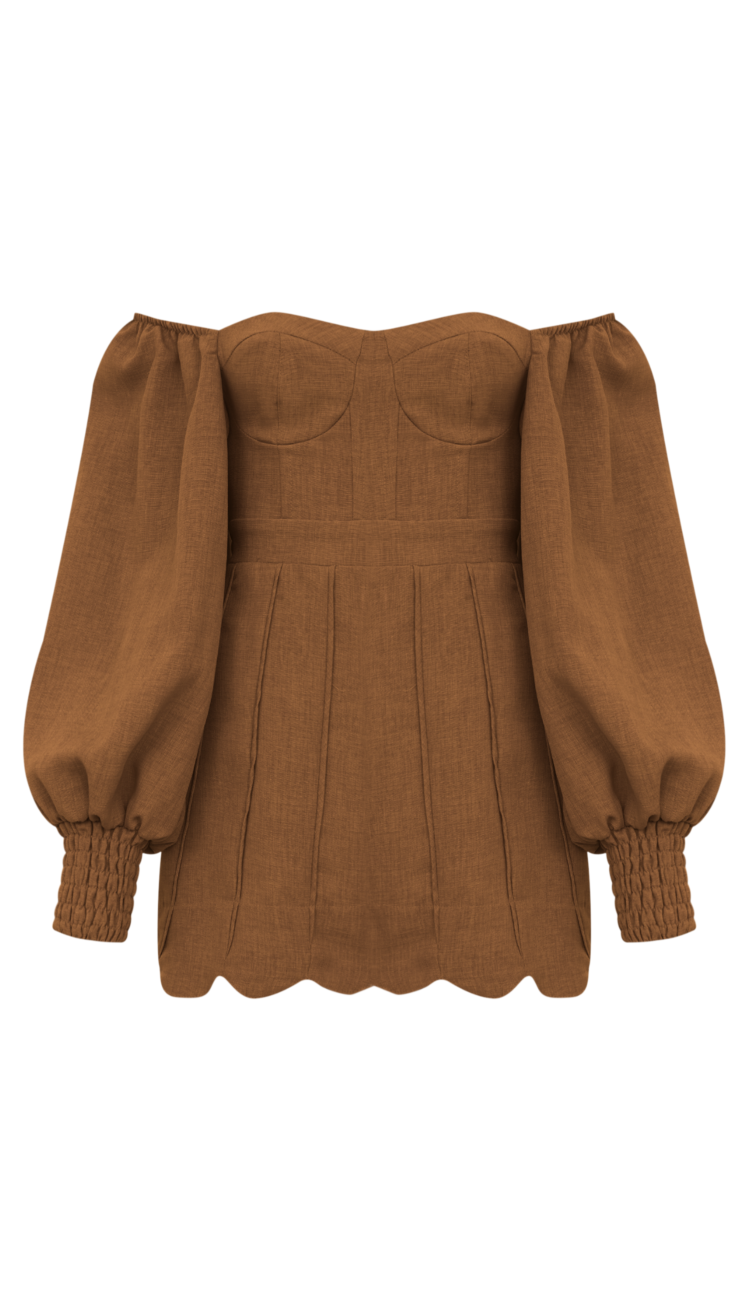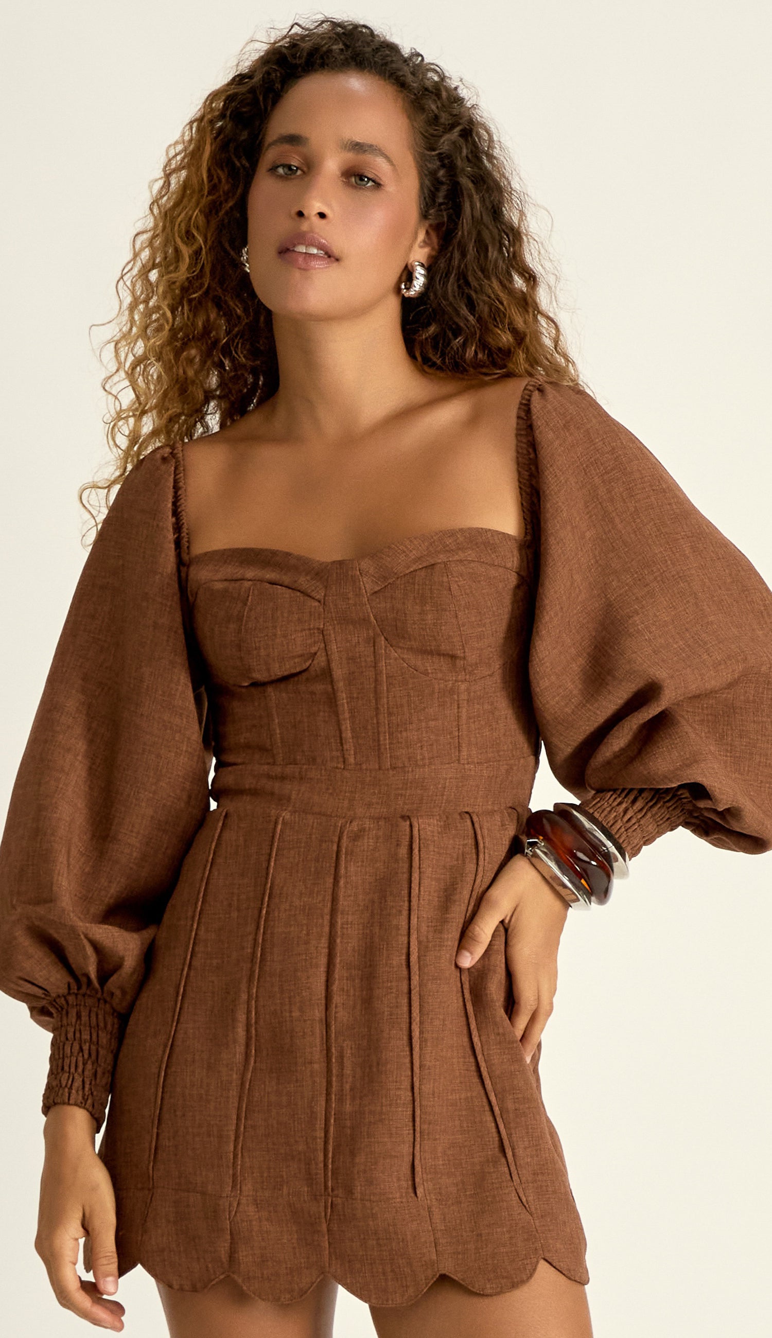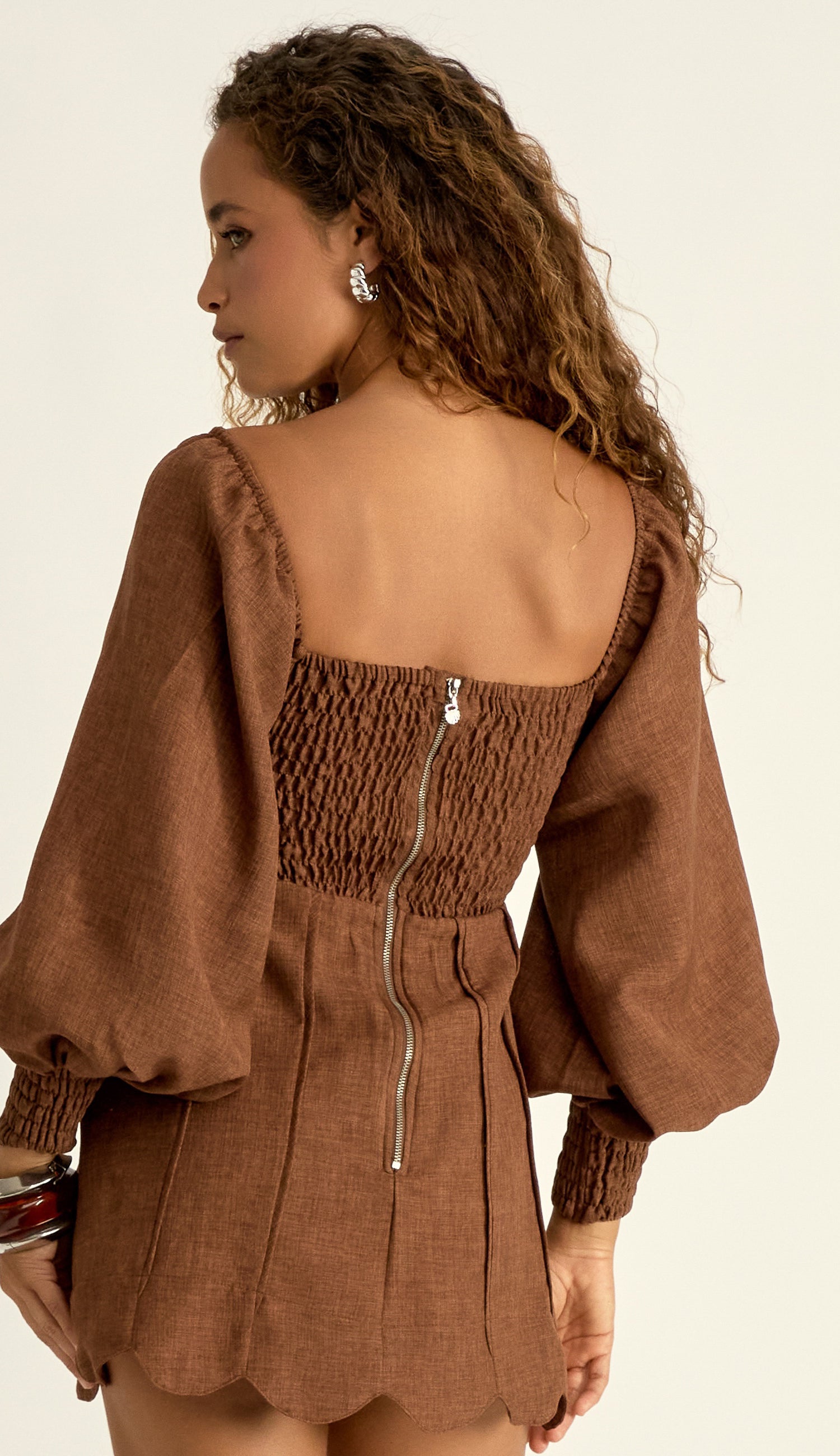 Macaquinho com forro, confeccionado em poliéster com aspecto de linho texturizado mais encorpadinho. Possui saia sobreposta ao forro de shorts, decote coração, mangas longas bufantes com elástico no ombro, podendo ser usado no estilo "ciganinha" ou "princesa", conta com recortes que modelam o busto, pala na cintura com barbatanas para estruturar a peça, punho das mangas em lastex, nesgas na saia com detalhe em vivo e barra com recortes arredondados, lastex franzido nas costas e fechamento traseiro por zíper de metal com pingente em formato de conchinha.
