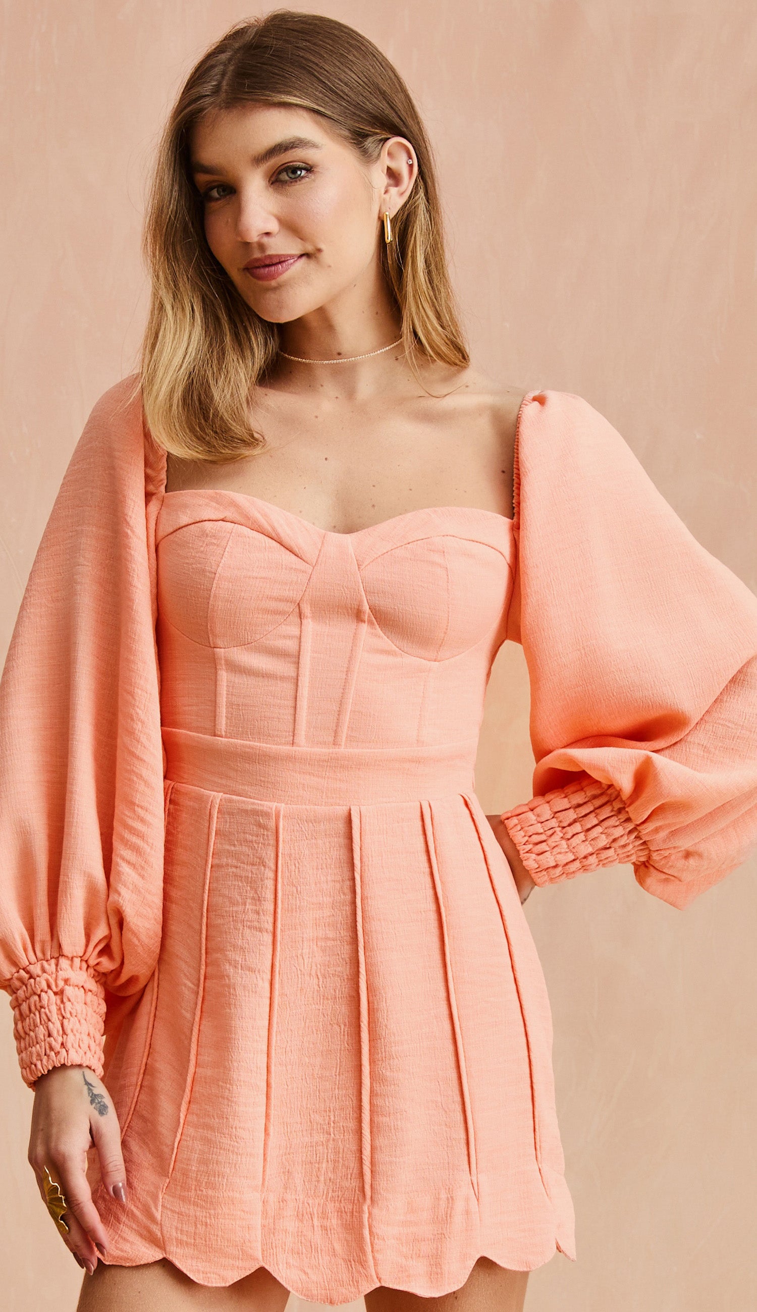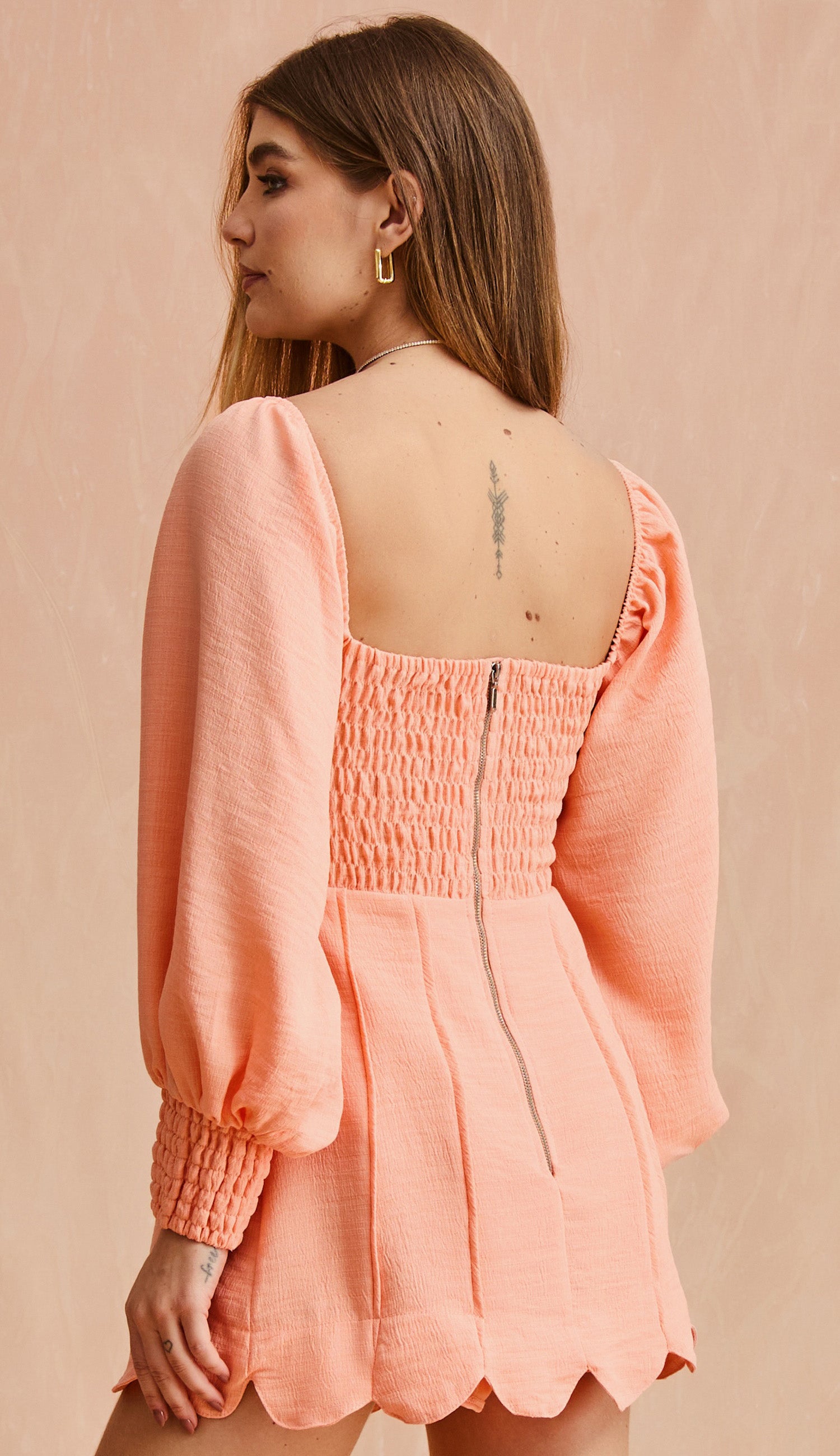 Macaquinho com forro, confeccionado em poliéster com aspecto de linho texturizado. Possui saia sobreposta ao forro de shorts, decote coração, mangas longas bufantes com elástico no ombro, podendo ser usado no estilo "ciganinha" ou "princesa", conta com recortes que modelam o busto, pala na cintura com barbatanas para estruturar a peça, punho das mangas em lastex, nesgas na saia com detalhe em vivo e barra com recortes arredondados, lastex franzido nas costas e fechamento traseiro por zíper de metal.