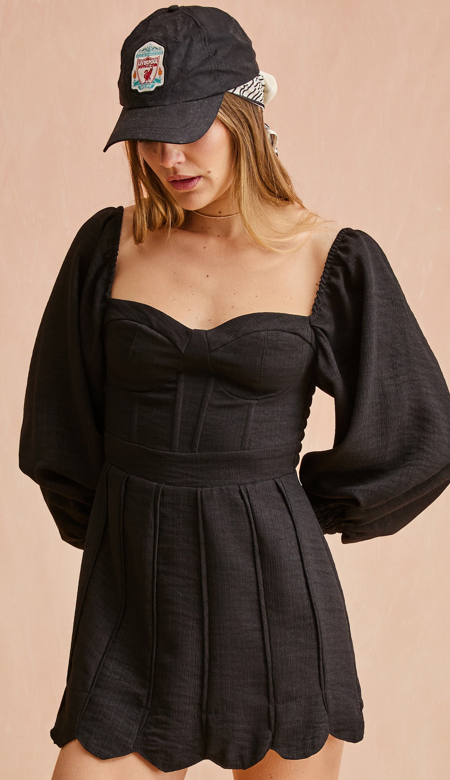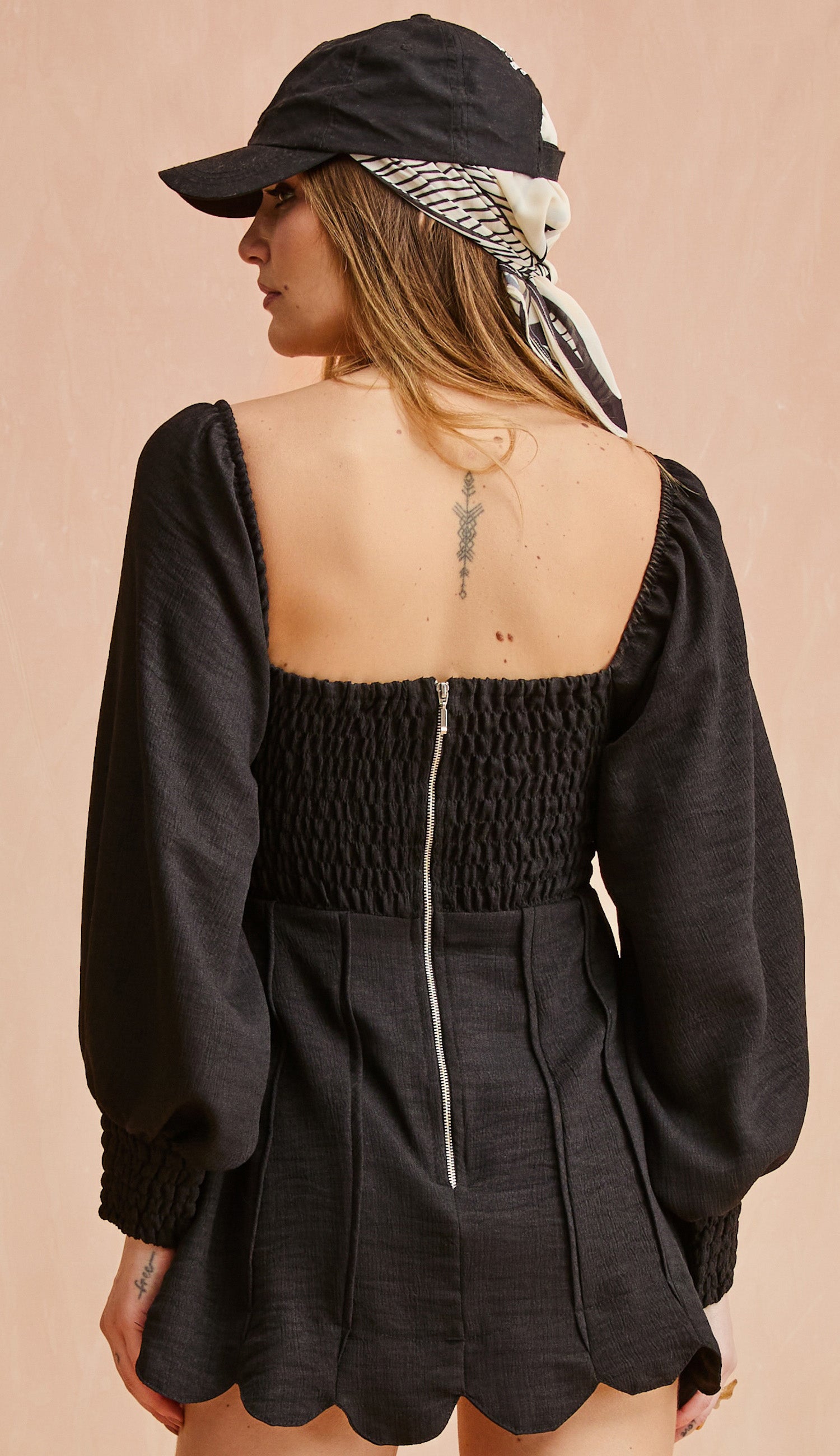 Macaquinho com forro, confeccionado em poliéster com aspecto de linho texturizado. Possui saia sobreposta ao forro de shorts, decote coração, mangas longas bufantes com elástico no ombro, podendo ser usado no estilo "ciganinha" ou "princesa", conta com recortes que modelam o busto, pala na cintura com barbatanas para estruturar a peça, punho das mangas em lastex, nesgas na saia com detalhe em vivo e barra com recortes arredondados, lastex franzido nas costas e fechamento traseiro por zíper de metal.