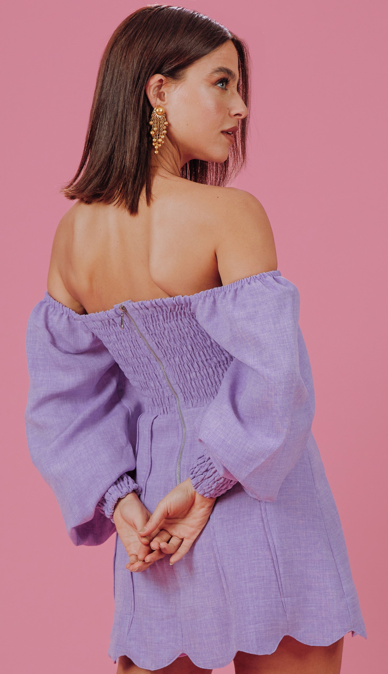 Macaquinho com forro, confeccionado em poliéster com aspecto de linho texturizado. Possui saia sobreposta ao forro de shorts, decote coração, mangas longas bufantes com elástico no ombro, podendo ser usado no estilo "ciganinha" ou "princesa", conta com recortes que modelam o busto, pala na cintura com barbatanas para estruturar a peça, punho das mangas em lastex, nesgas na saia com detalhe em vivo e barra com recortes arredondados, lastex franzido nas costas e fechamento traseiro por zíper de metal.
