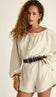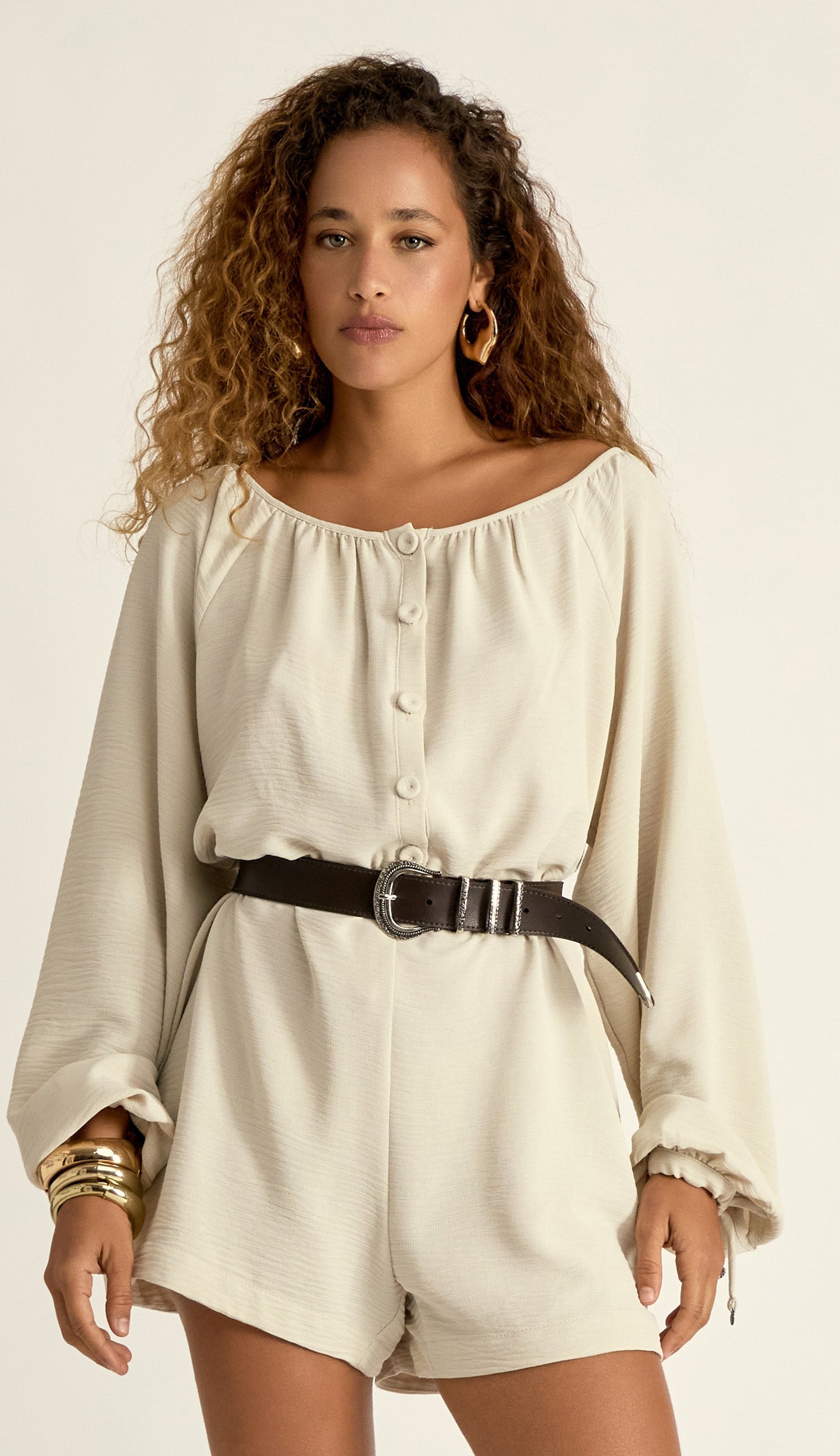Macaquinho confeccionado em crepe texturizado com aspecto de linho e efeito amassadinho. Possui modelagem soltinha, decote canoa com franzidinhos e viés, mangas longas levemente bufantes com tirinha embutida com ponteiras de metal em formato de conchinha no punho para franzir e amarrar, bolsos laterais e fechamento frontal por botões forrados.