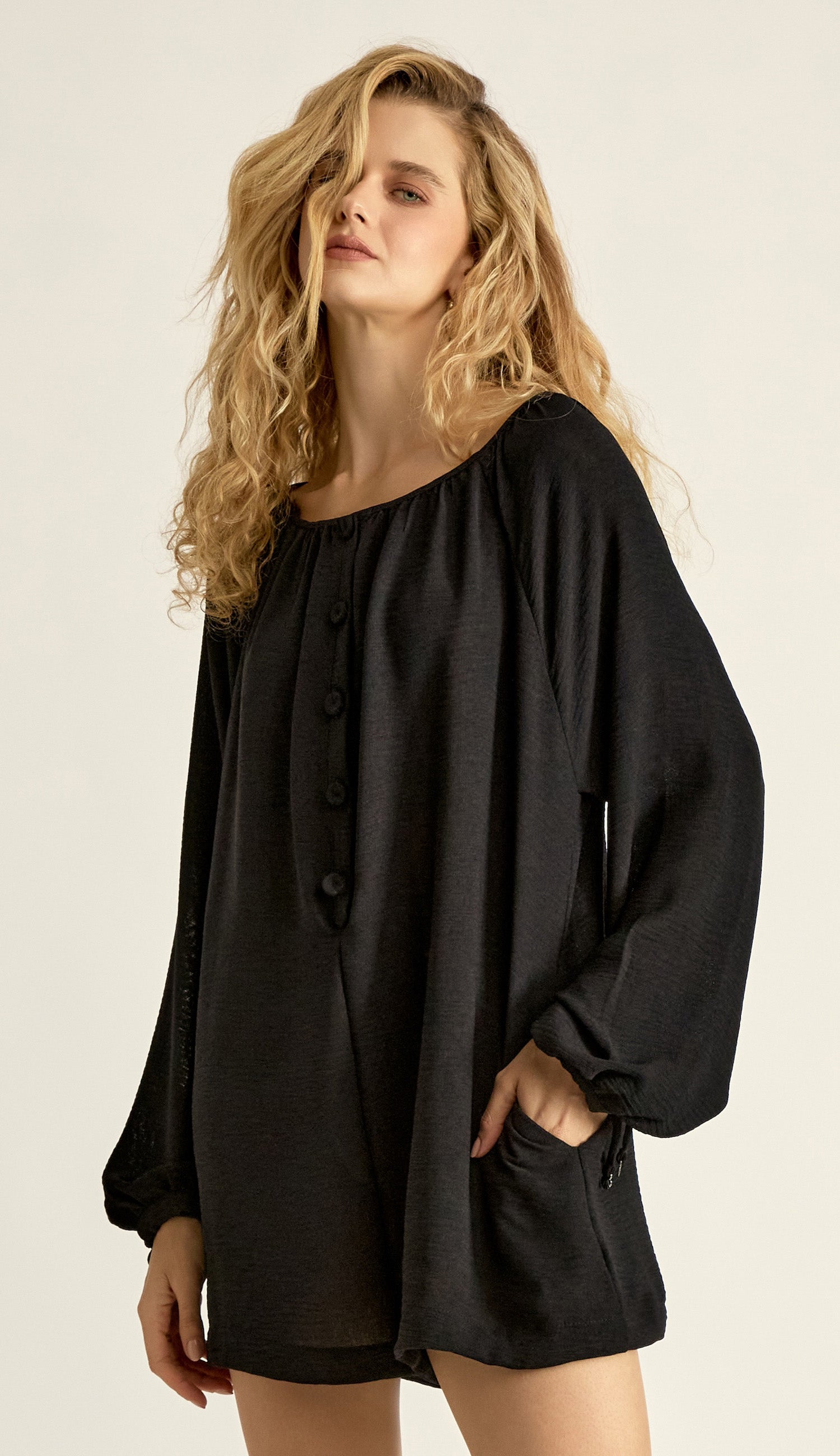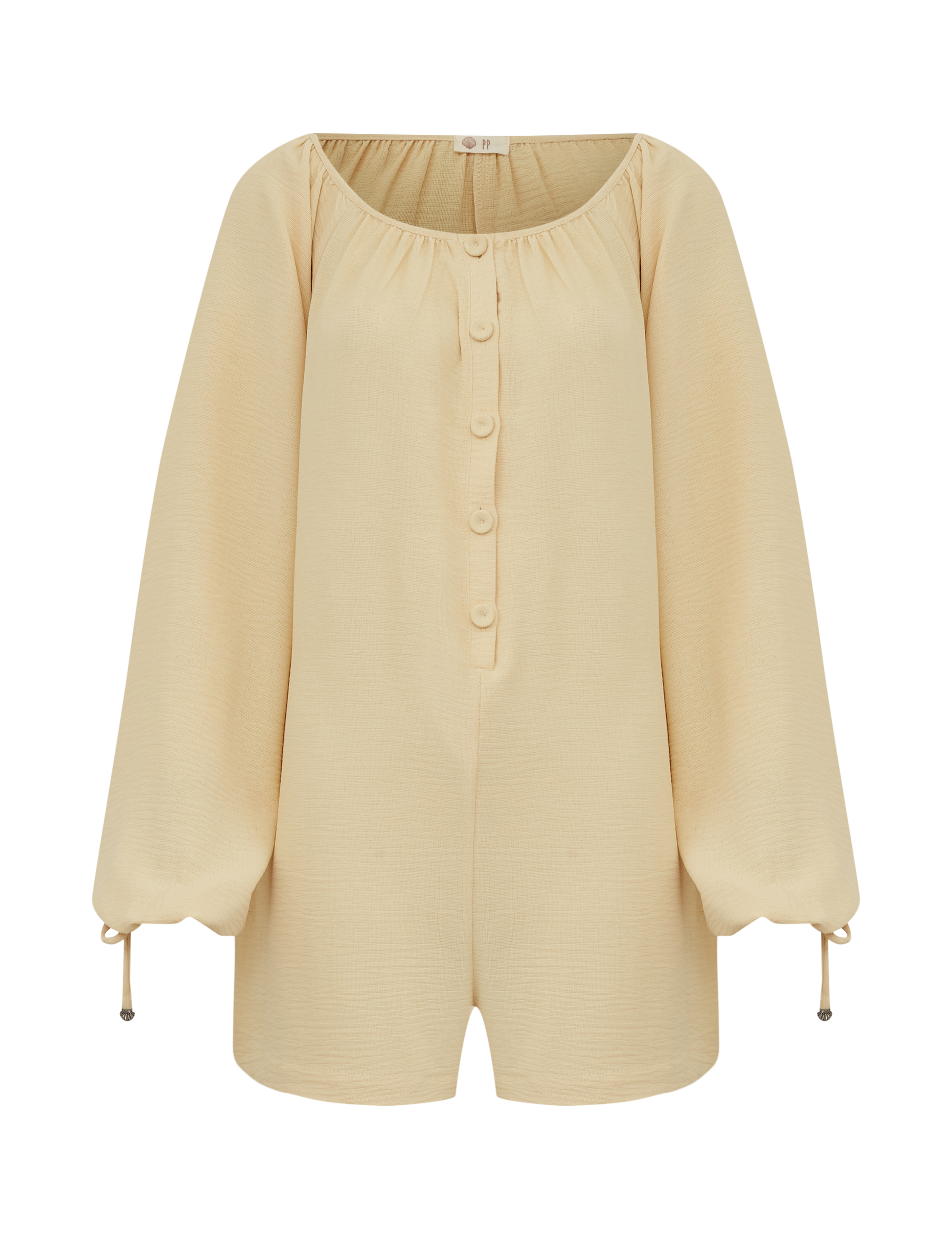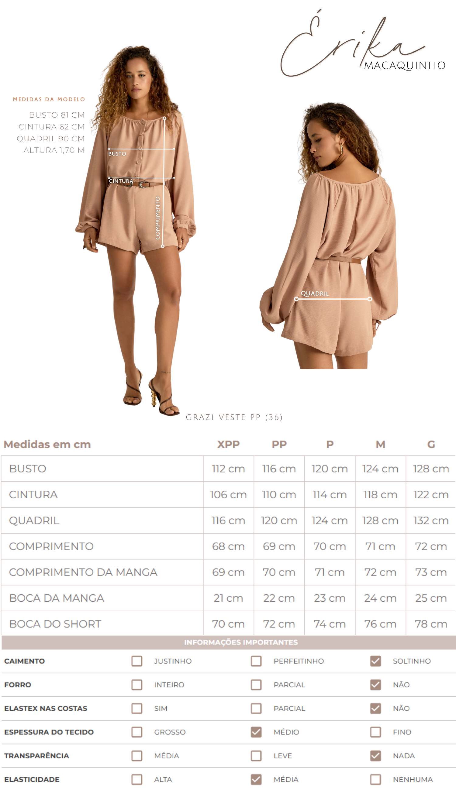 Macaquinho confeccionado em crepe texturizado com aspecto de linho e efeito amassadinho. Possui modelagem soltinha, decote canoa com franzidinhos e viés, mangas longas levemente bufantes com tirinha embutida com ponteiras de metal em formato de conchinha no punho para franzir e amarrar, bolsos laterais e fechamento frontal por botões forrados.