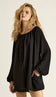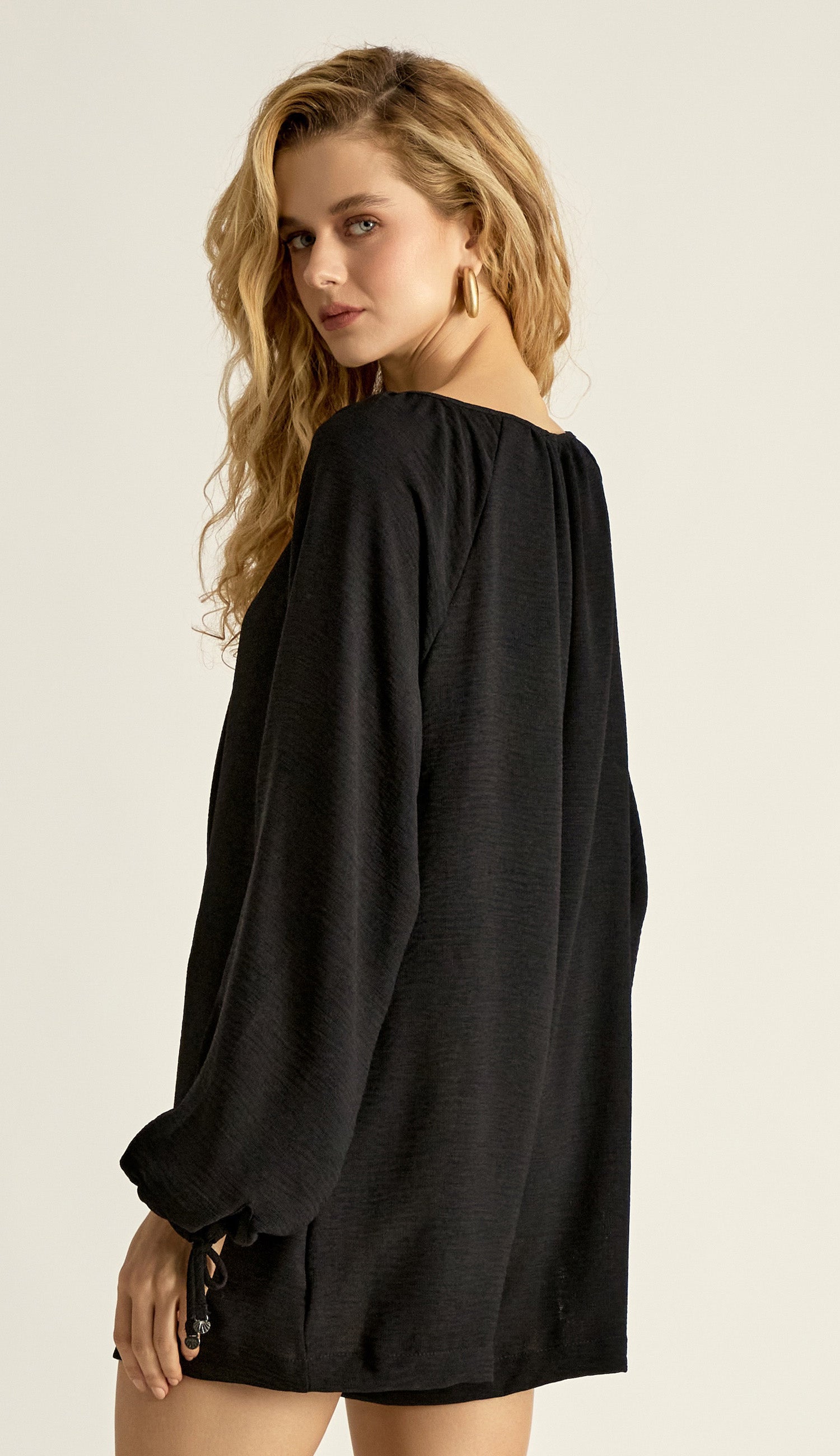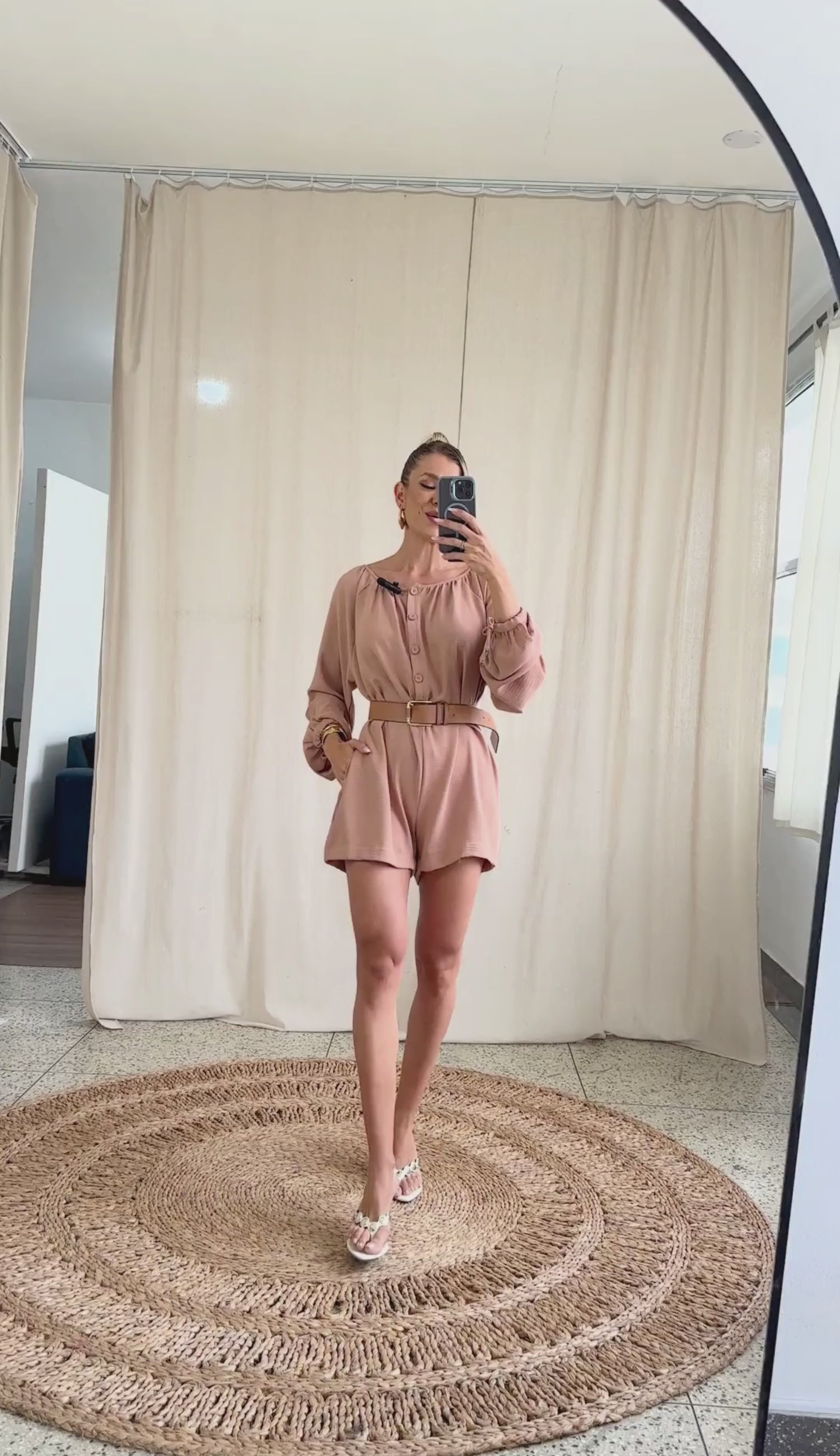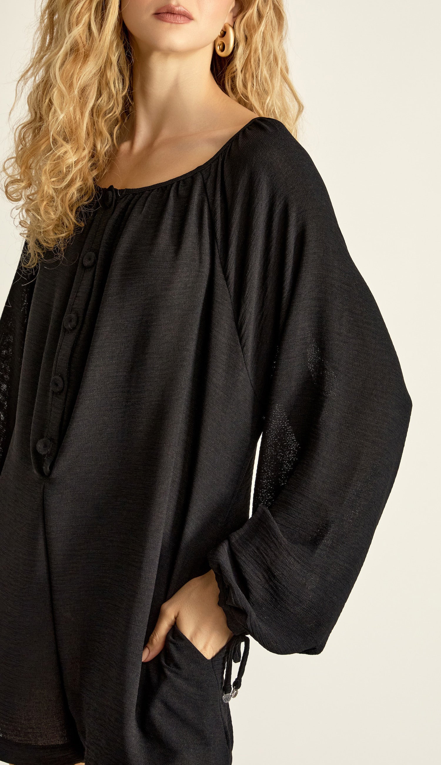 Macaquinho confeccionado em crepe texturizado com aspecto de linho e efeito amassadinho. Possui modelagem soltinha, decote canoa com franzidinhos e viés, mangas longas levemente bufantes com tirinha embutida com ponteiras de metal em formato de conchinha no punho para franzir e amarrar, bolsos laterais e fechamento frontal por botões forrados.