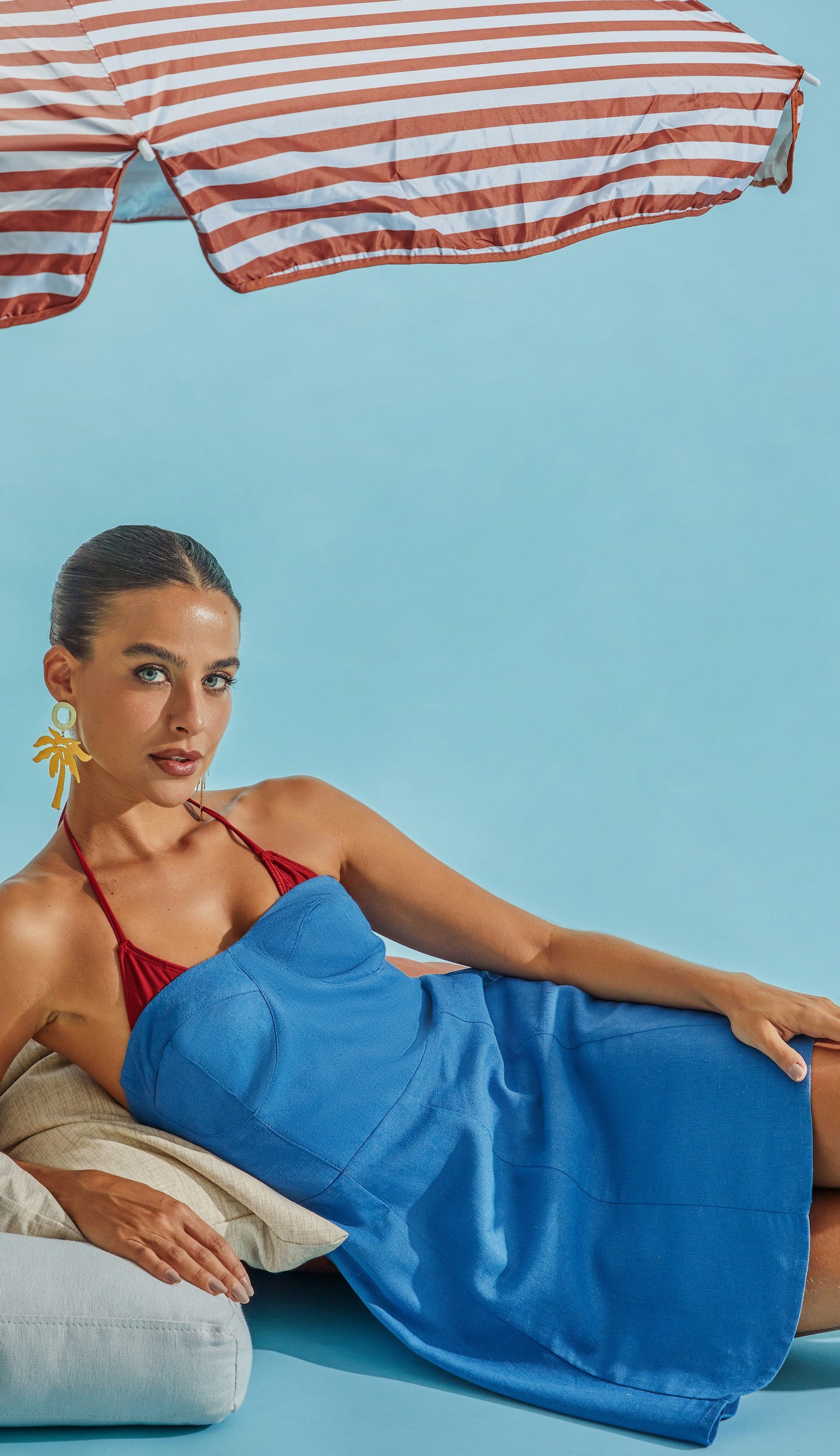 Macaquinho confeccionado em linho. Não possui mangas e conta com decote coração, silicone interno para maior segurança, pala e recortes no busto para modelar à peça, lastex nas costas, fechamento traseiro por zíper de metal com pingente que tem a conchinha da Laguna gravada e saia evasê com nesgas por cima do shorts, parecendo um vestidinho.