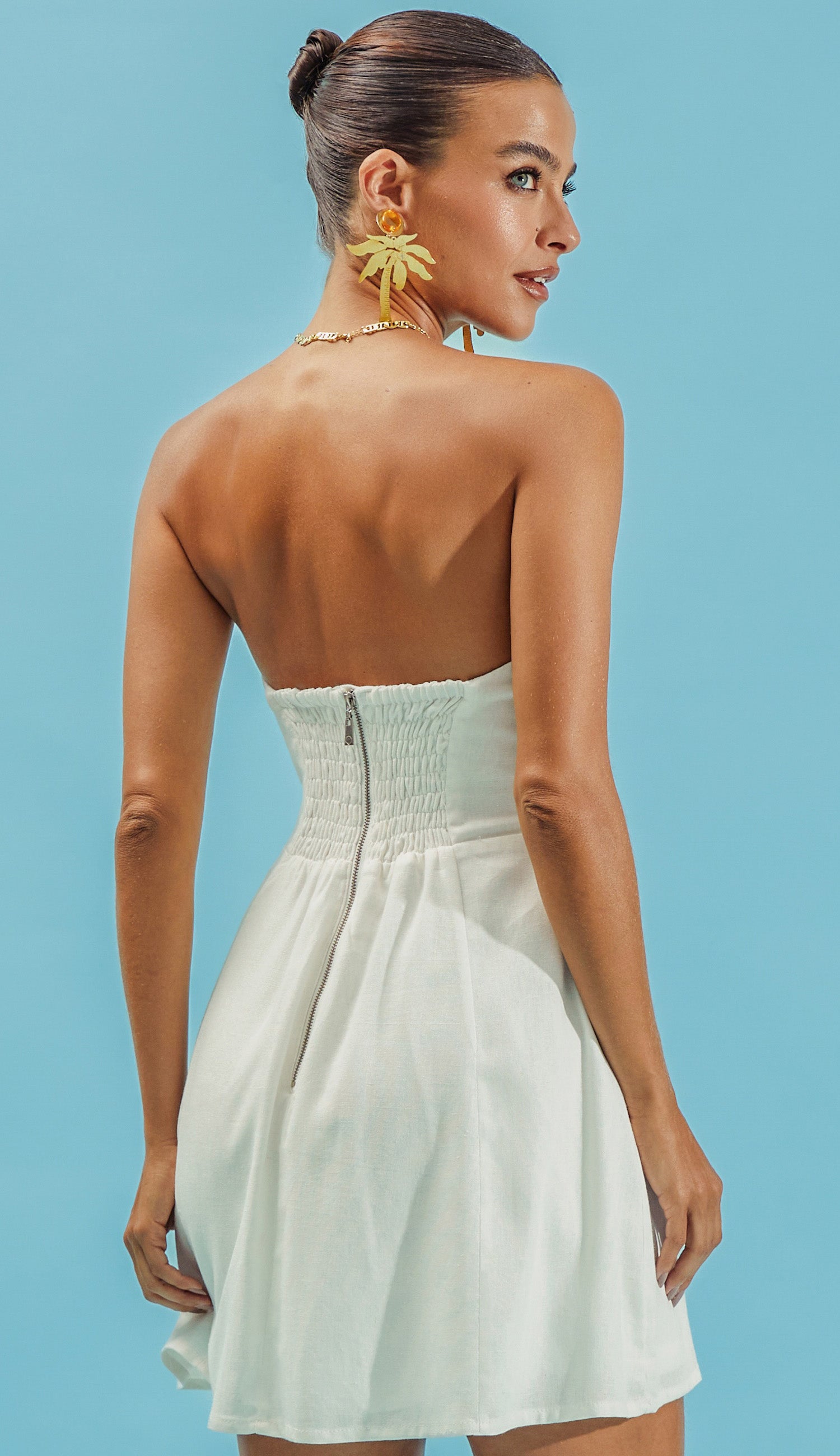 Macaquinho confeccionado em linho. Não possui mangas e conta com decote coração, silicone interno para maior segurança, pala e recortes no busto para modelar à peça, lastex nas costas, fechamento traseiro por zíper de metal com pingente que tem a conchinha da Laguna gravada e saia evasê com nesgas por cima do shorts, parecendo um vestidinho.