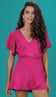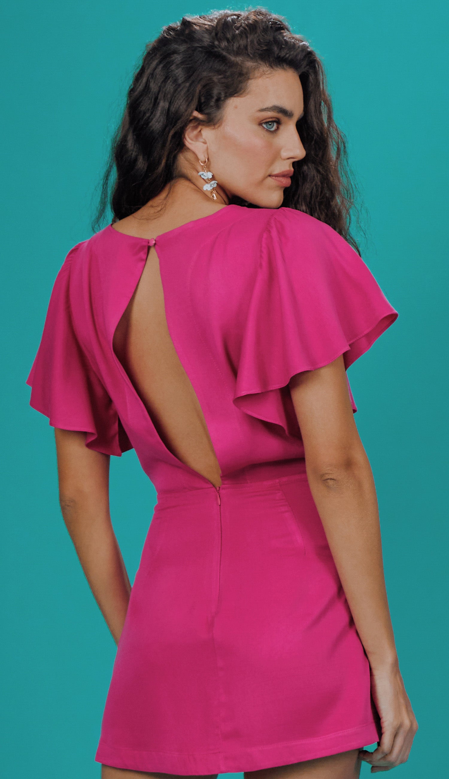 Macaquinho confeccionado em viscose twill. Possui saia, frente sobreposta, manga sino, frente saia assimétrica com babadinho, costas aberta, fecho por botão forrado, e fecho da saia posterior por zíper invisível.