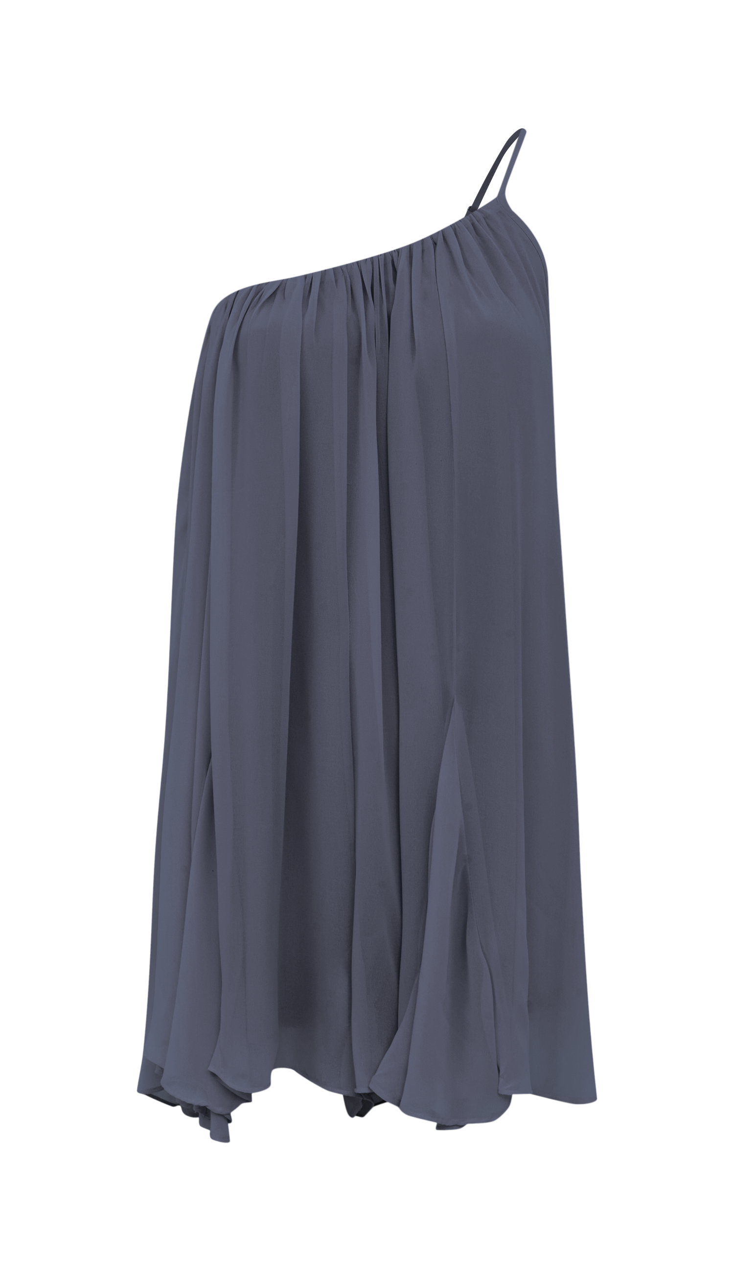 Macaquinho confeccionado em crepe leve com forro. Possui decote ombro único com elástico interno franzido em todo o decote, alcinha regulável, fechamento lateral por zíper invisível e botão esmaltado e modelagem ampla com nesgas na barra.