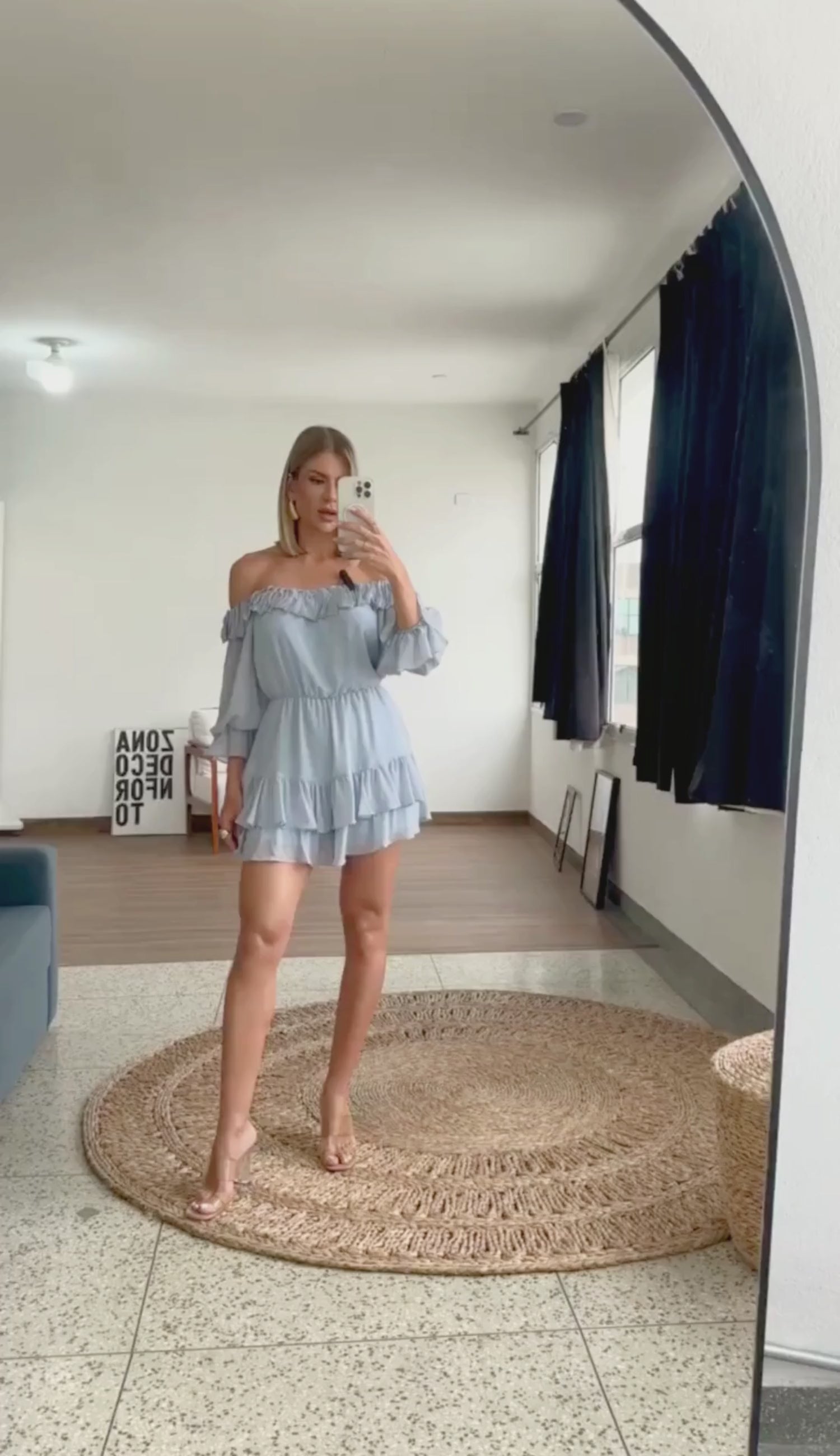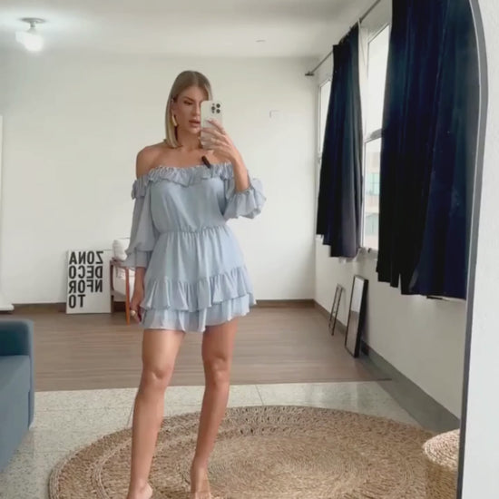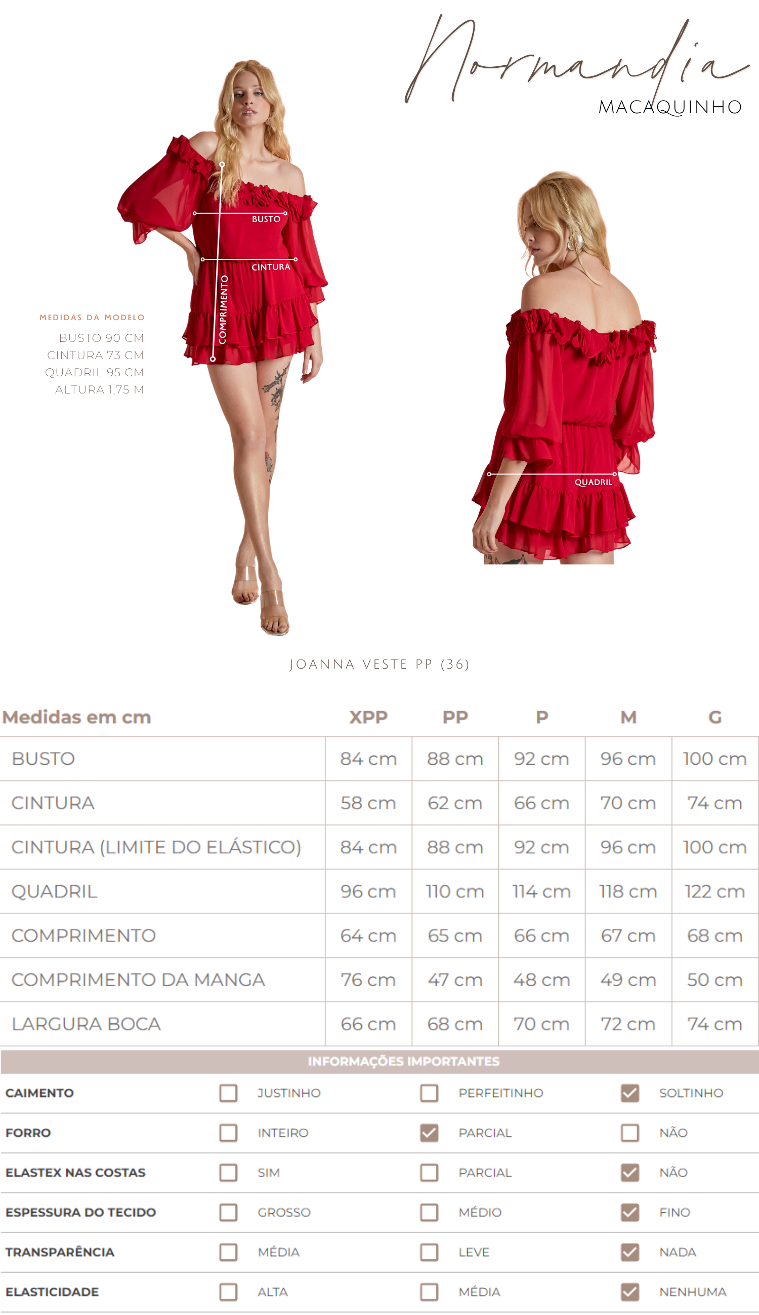 Macaquinho confeccionado em crepe com forro. Possui decote ombro a ombro com elástico e babadinhos volumosos franzidos, mangas levemente bufantes com elástico e babado nos punhos, elástico interno também na cintura dando um efeito blusê, tecido soltinho na parte de baixo com recortes e babados, parecendo uma saia.