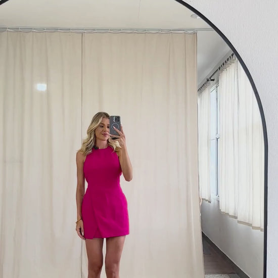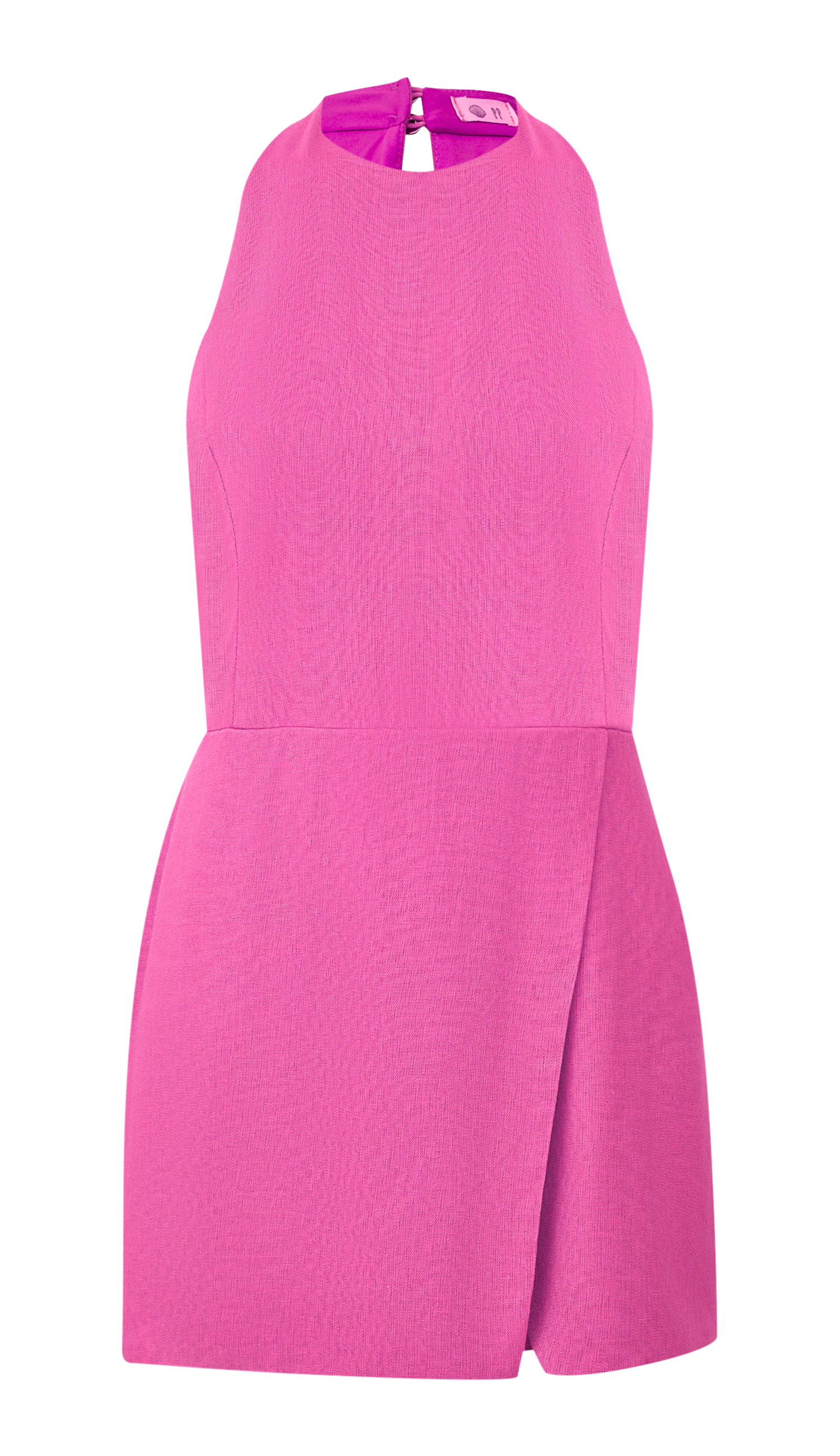 Macaquinho regata ajustado confeccionado em linho com forro. Possui decote halter com gola careca bem fechadinha e cava americana, criando um lindo decote nadador aberto nas costas; conta ainda com recortes que modelam a peça, saia estilo envelope sobreposta ao shorts na parte da frente, parecendo um vestidinho, bolsos laterais e fechamento traseiro por botões esmaltados na gola e zíper invisível.