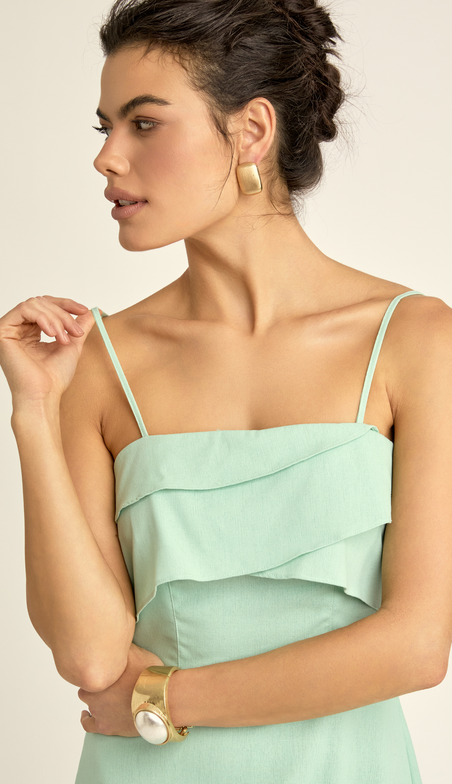 Em linho nobre e com frescor natural, o Macaquinho Philippa combina leveza e feminilidade com babados assimétricos no busto e modelagem evasê que lembra um vestido. A sobreposição cria movimento e conforto, resultando em uma peça charmosa, versátil e perfeita para dias de verão.