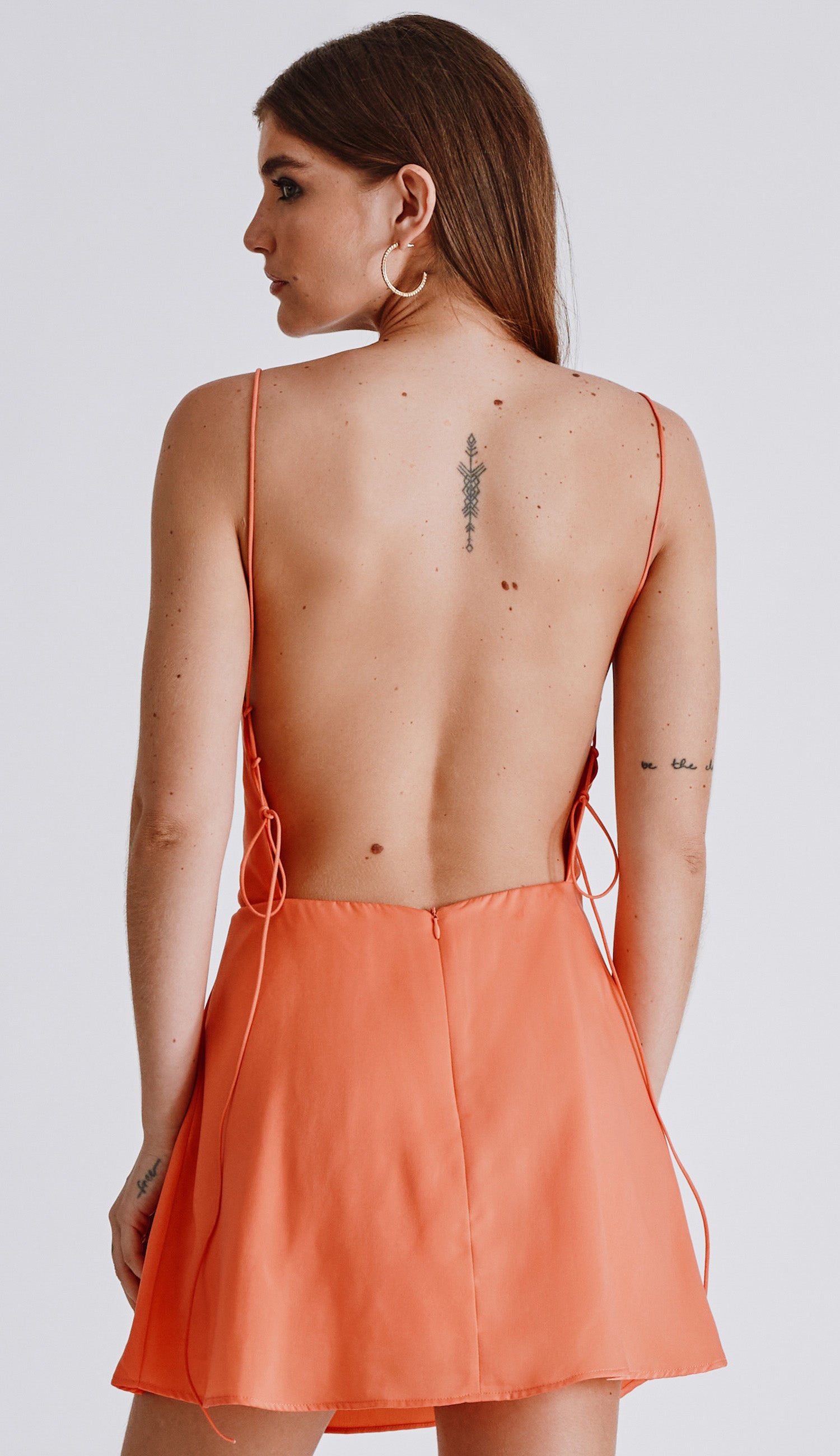 Macaquinho confeccionado em alfaiataria acetinada. Possui decote degagê, saia sobreposta ao shorts parecendo um vestidinho, modelagem evasê, costas abertas com tira fininha elástica para transpasse e amarração nas costas e fechamento traseiro no shorts por zíper invisível.