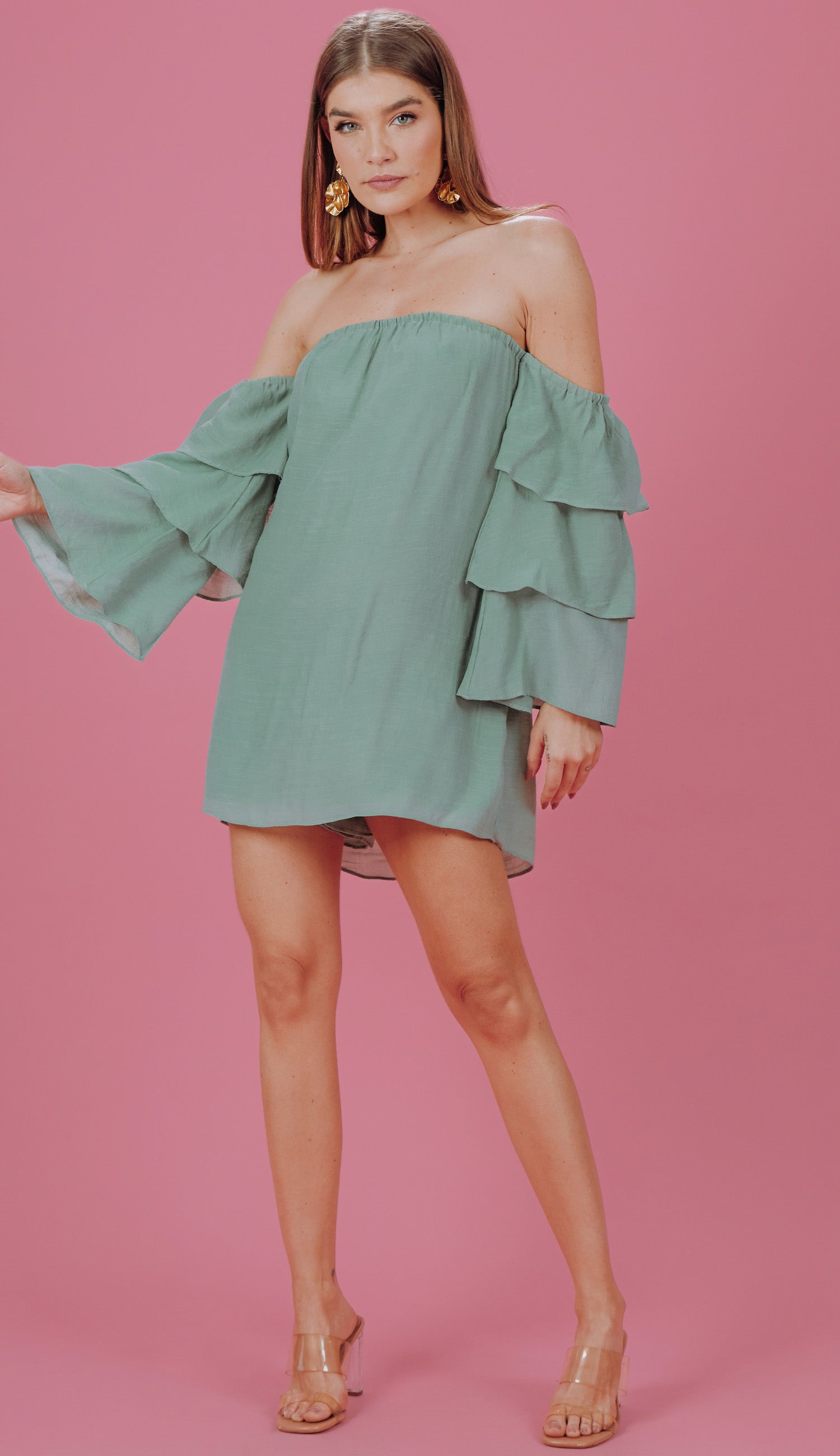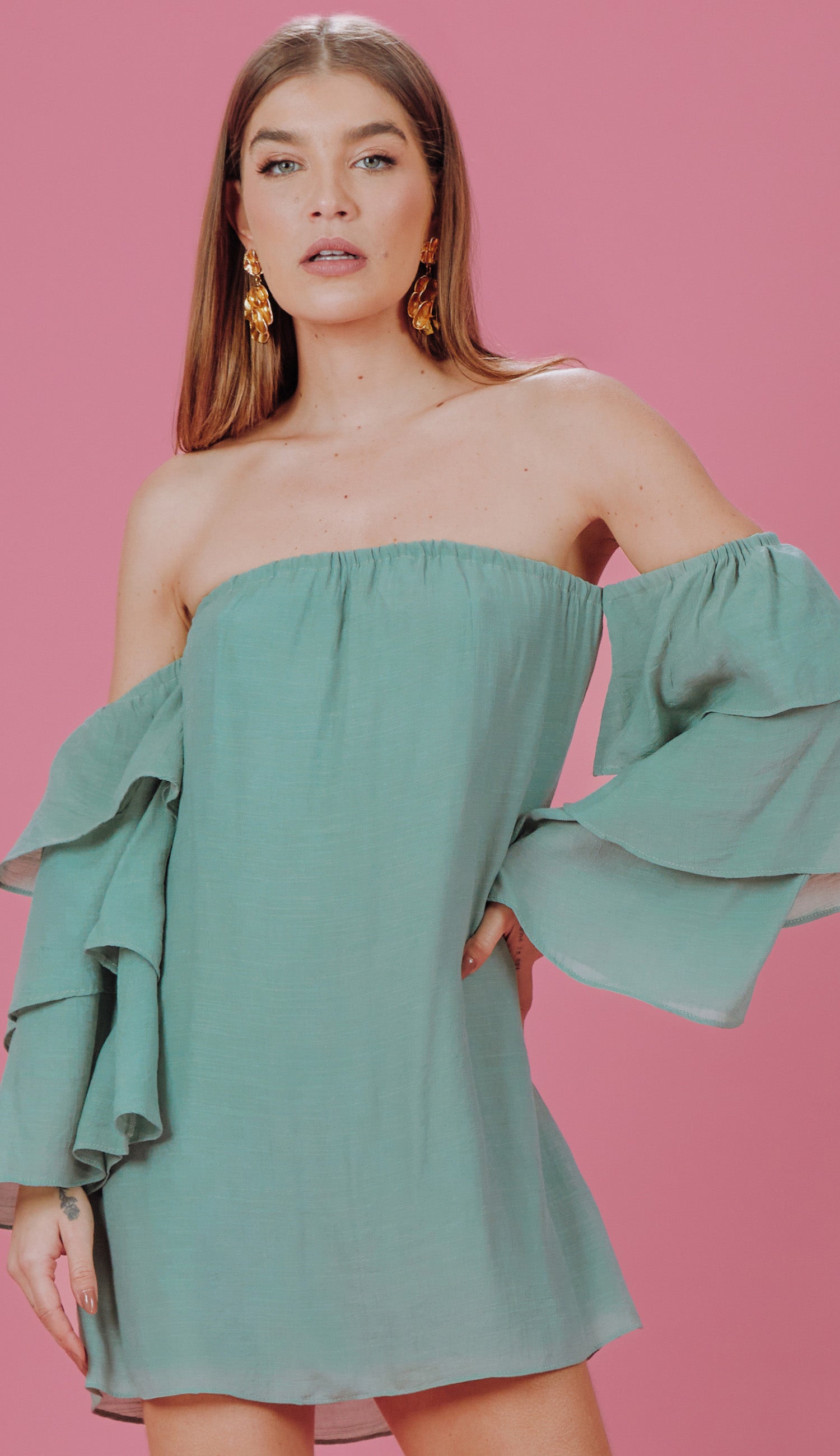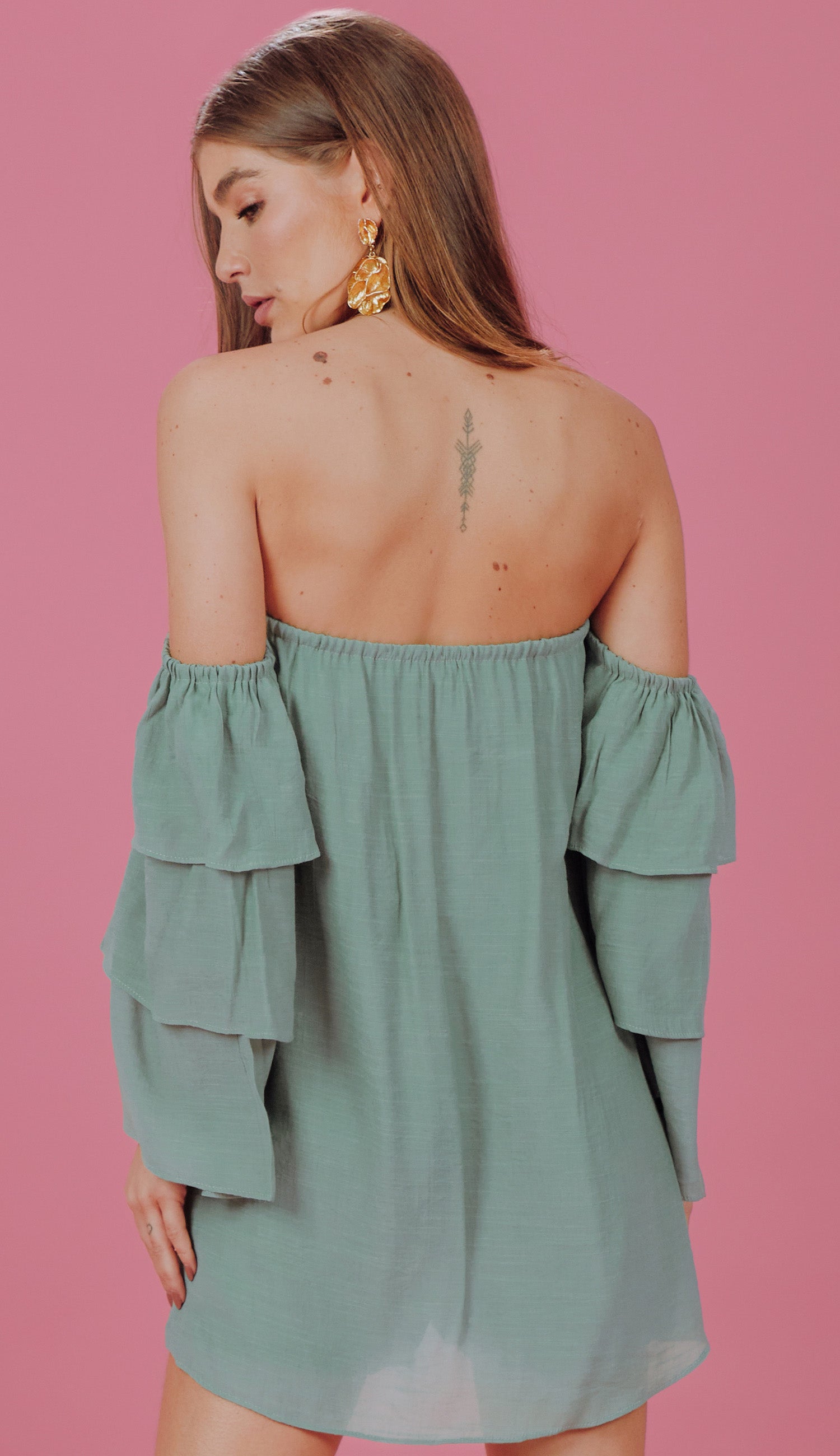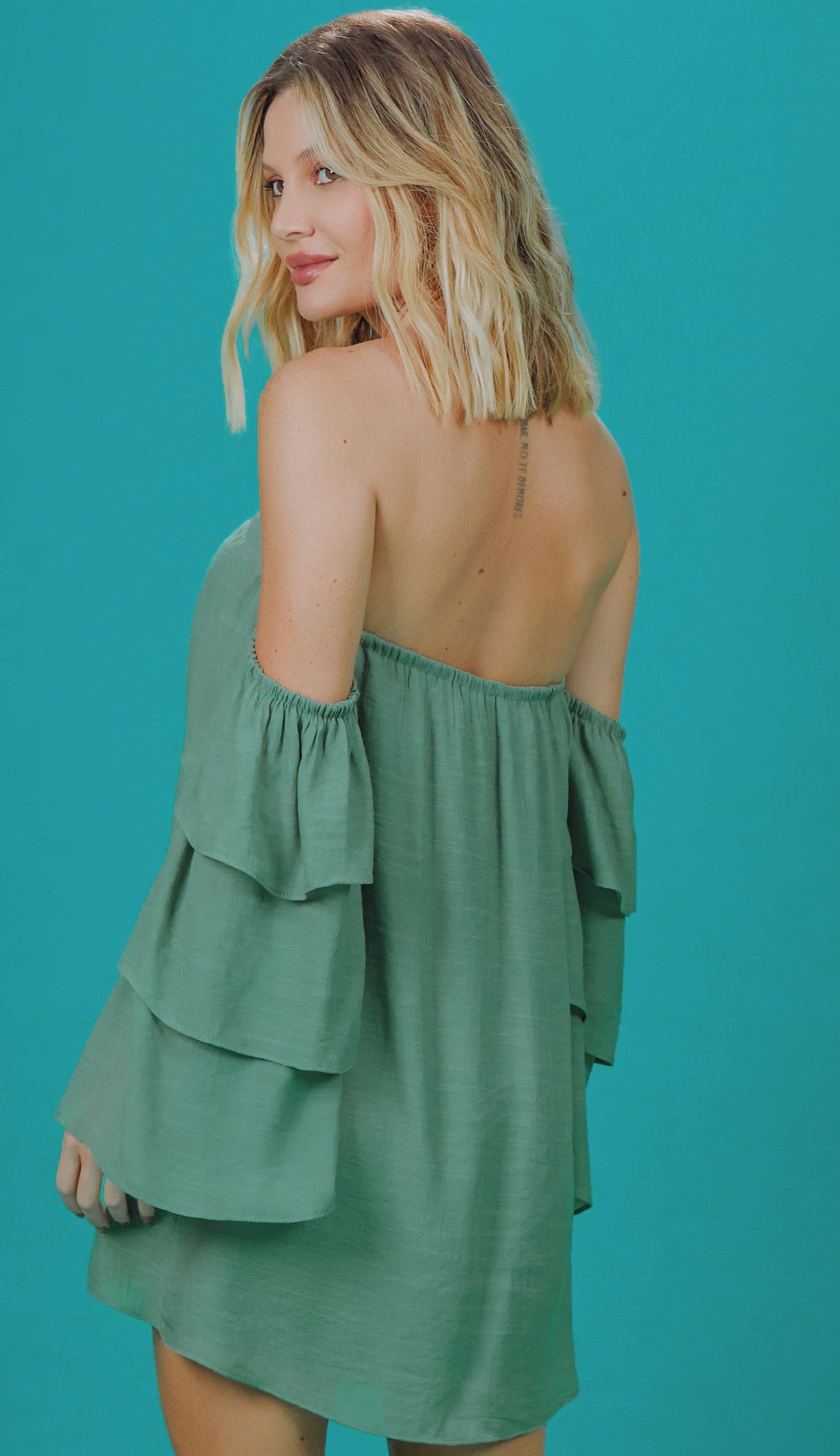 Macaquinho confeccionado em poliviscose texturizada com aspecto de linho. Possui decote ombro a ombro; mangas sino 7/8 amplas em camadas, dando um lindo volume à peça; elástico nos ombros e no decote; modelagem reta com sobreposição ao shorts, parecendo um vestidinho e top fixo interno no mesmo tecido com elástico abaixo do busto para maior sustentação e conforto.