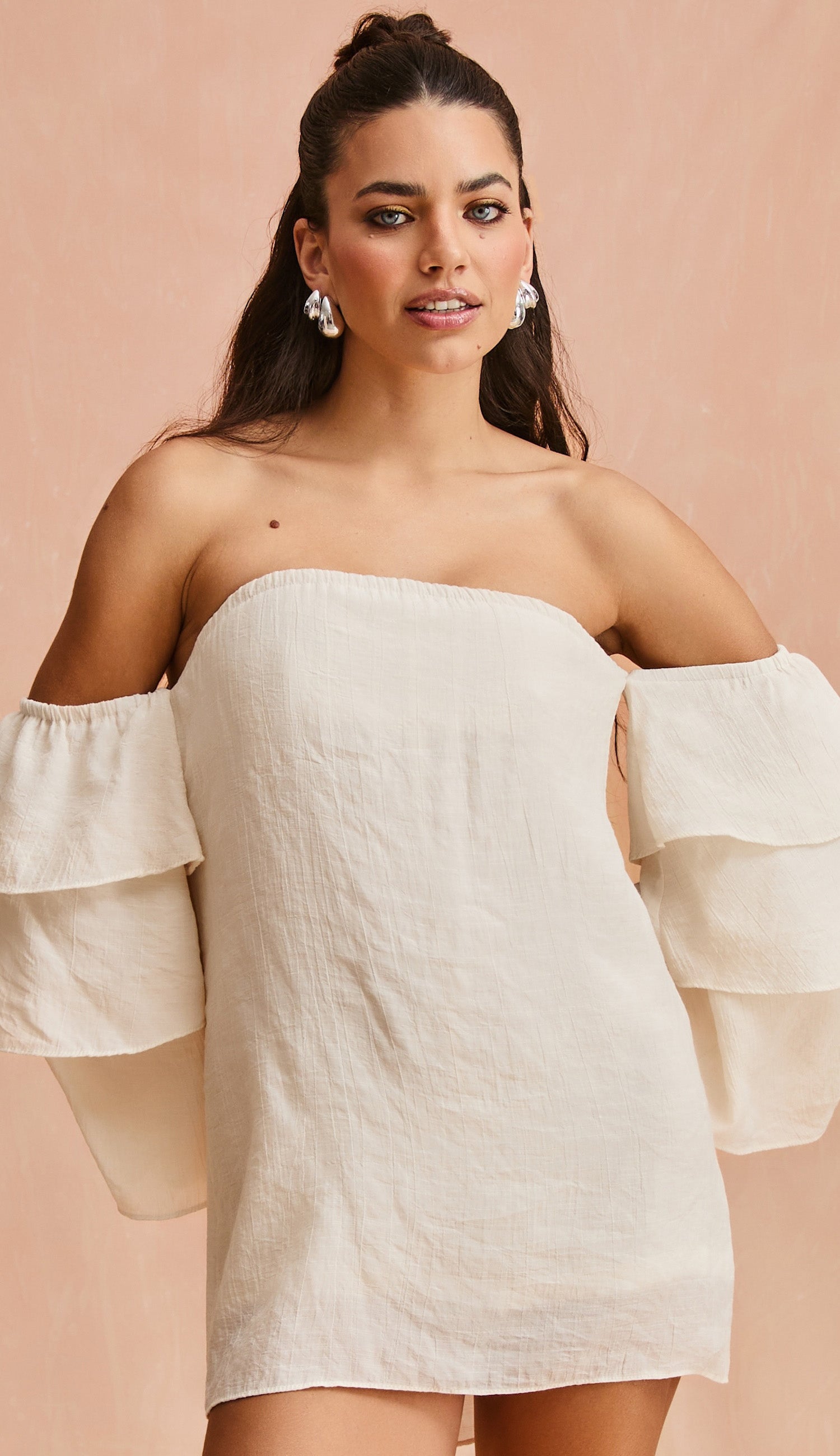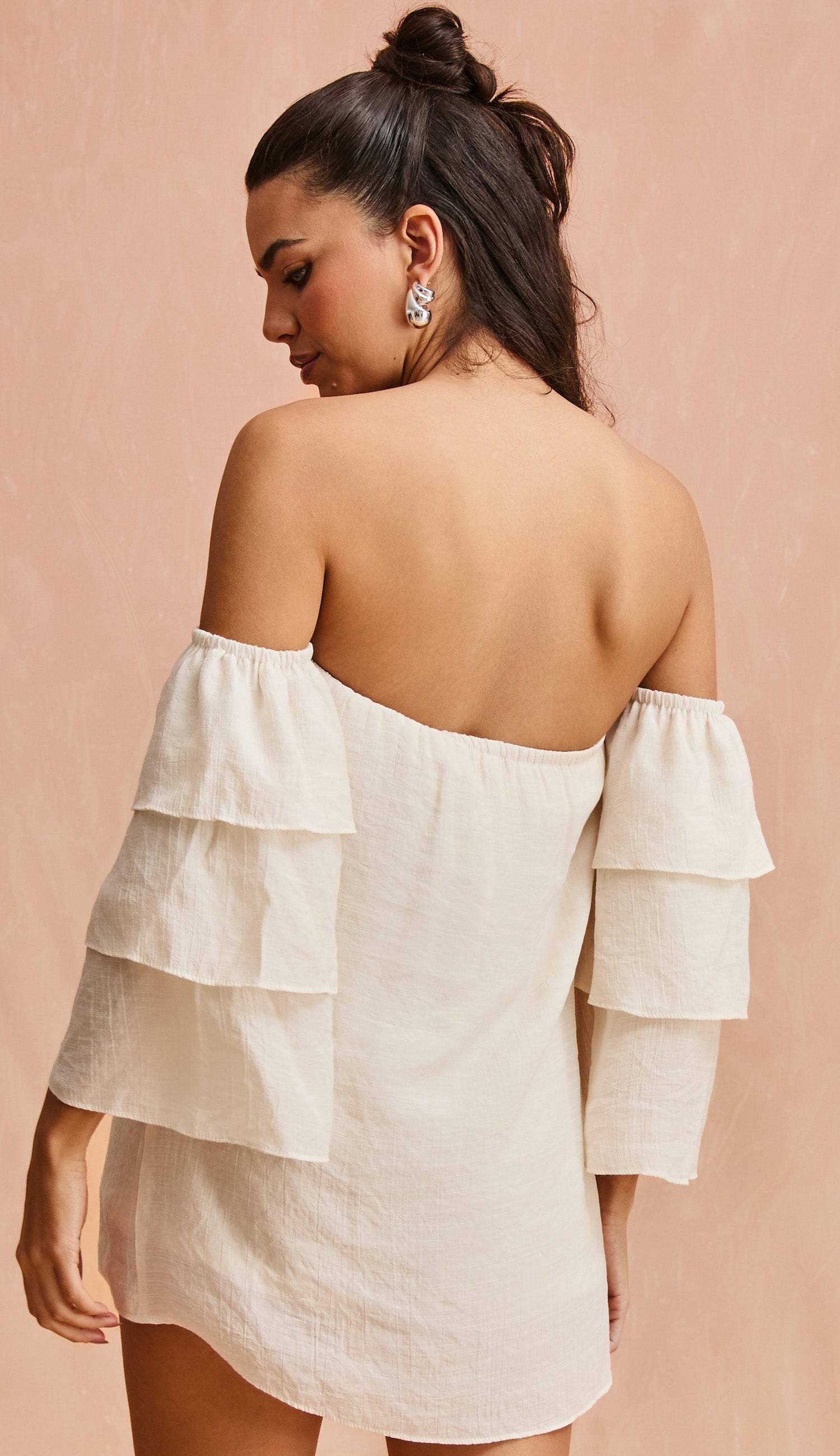 Macaquinho confeccionado em poliviscose texturizado com aspecto de linho e efeito amassadinho. Possui decote ombro a ombro; mangas sino 7/8 amplas em camadas, dando um lindo volume à peça; elástico nos ombros e no decote; modelagem reta com sobreposição ao shorts, parecendo um vestidinho e top fixo interno no mesmo tecido com elástico abaixo do busto para maior sustentação e conforto.