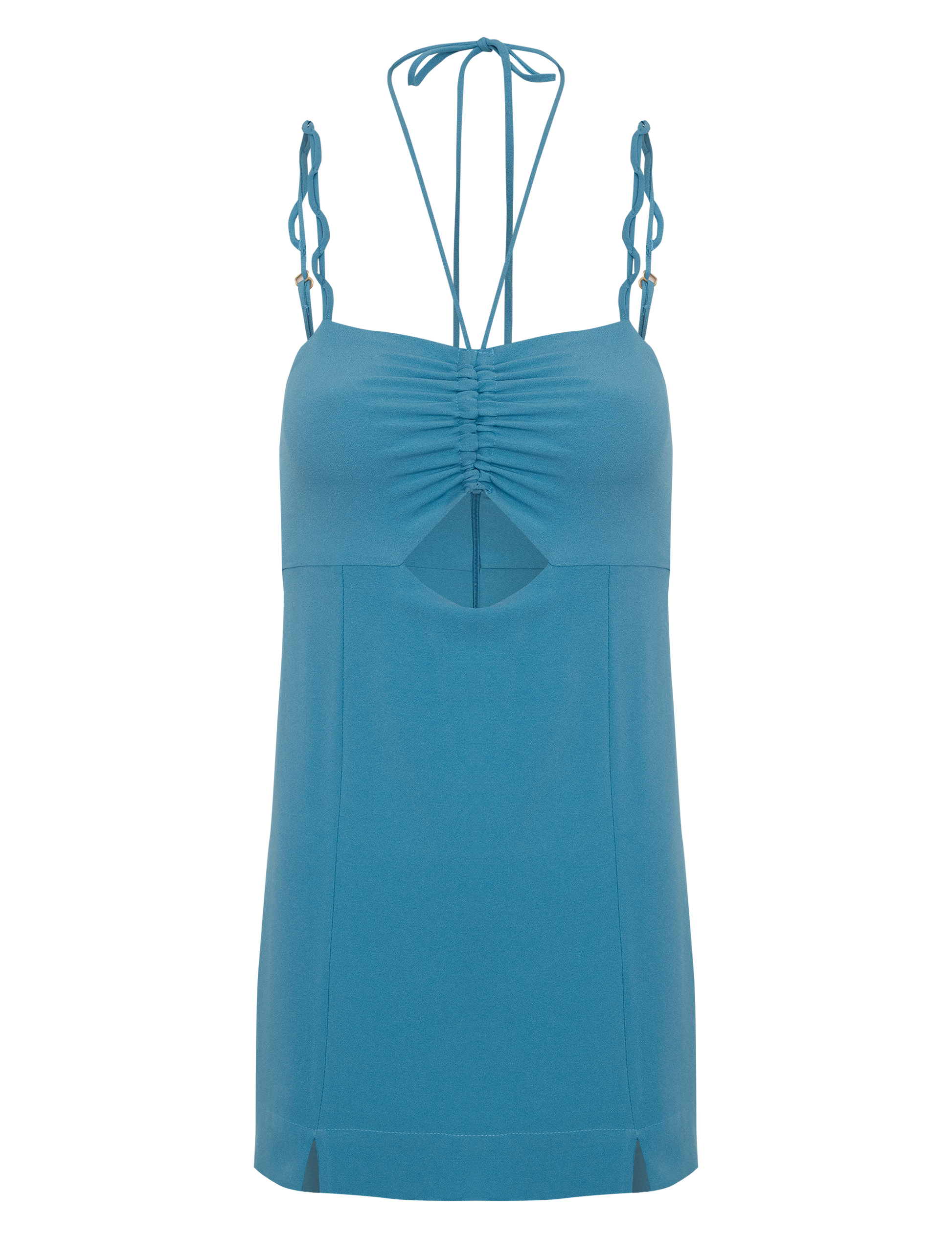 Macaquinho confeccionado em crepe de alfaiataria. Possui modelagem ajustada; decote coração com franzidinho no centro do busto e tirinhas para amarrar no pescoço; alcinhas reguláveis com detalhe de tirinha em ondas na alça; recorte vazado frontal logo abaixo do busto; saia curta com fendinhas na barra sobreposta ao shorts, parecendo um vestidinho e fechamento traseiro por zíper invisível.
