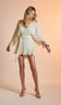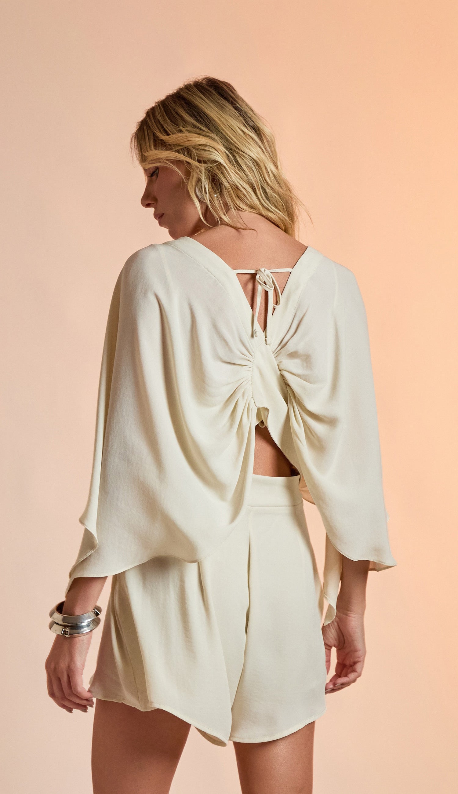 Macaquinho confeccionado em crepe com forro. Possui mangas amplas fixa na parte da frente com abertura nas costas e amarração que pode ser na frente ou nas costas. Fechamento por zíper invisível na lateral. A peça acompanha top confeccionado com o mesmo tecido e forro, possui alças finas e reguláveis.
